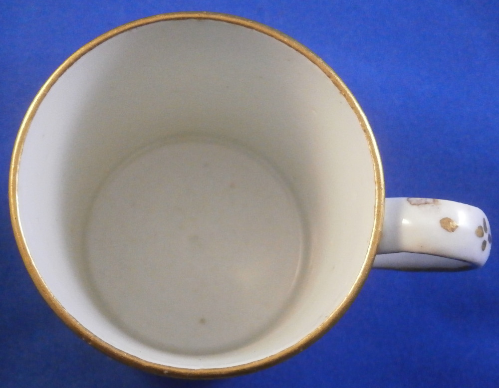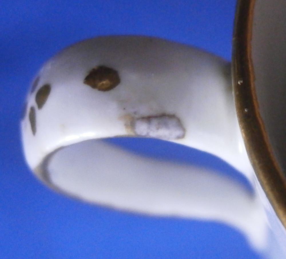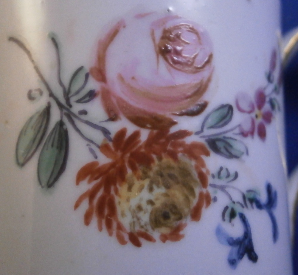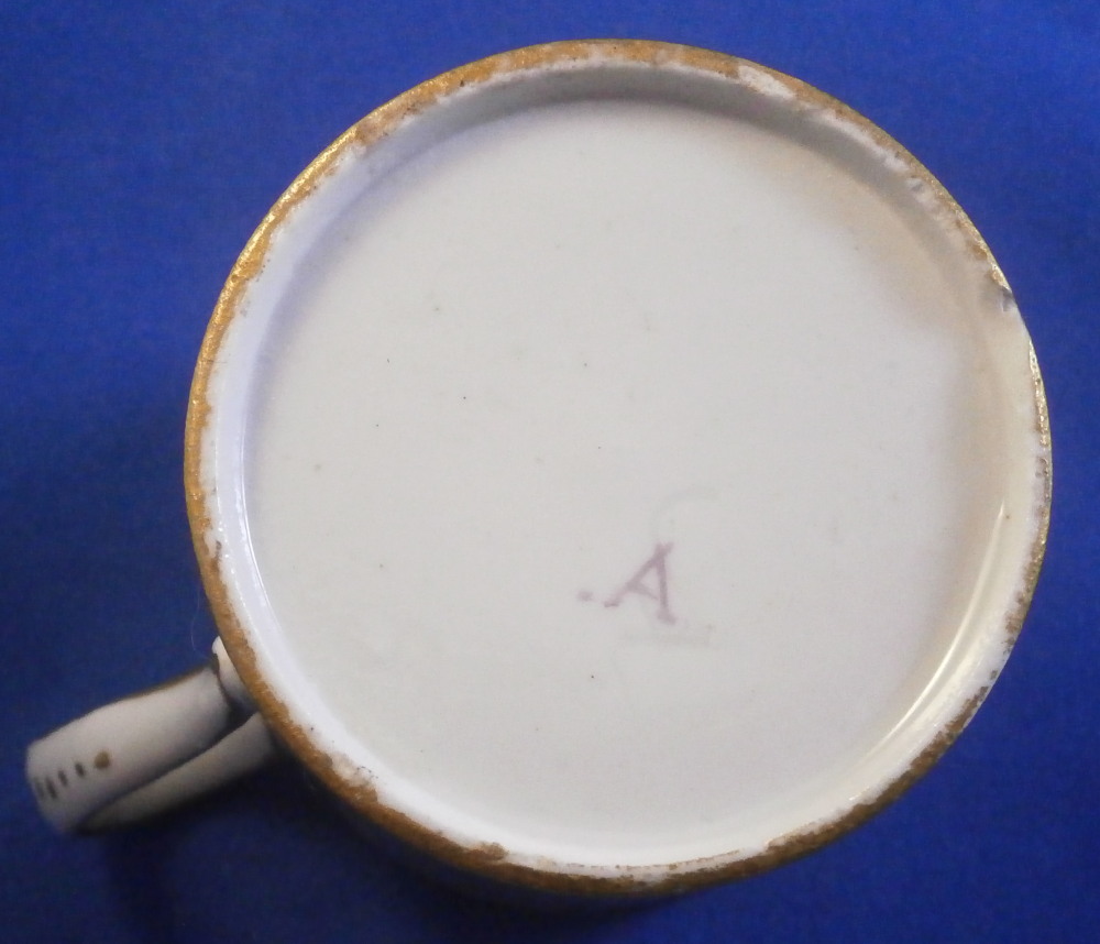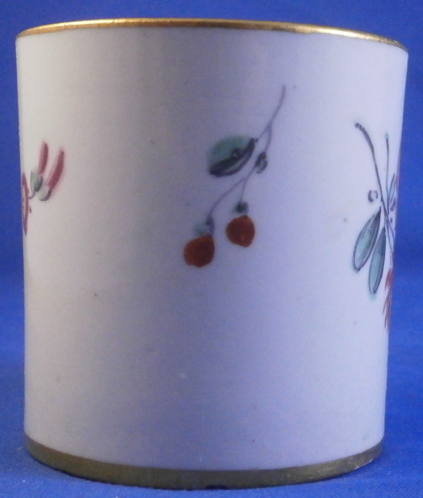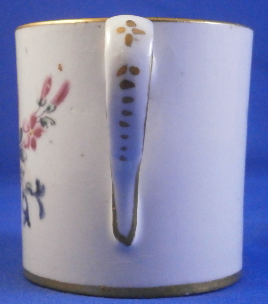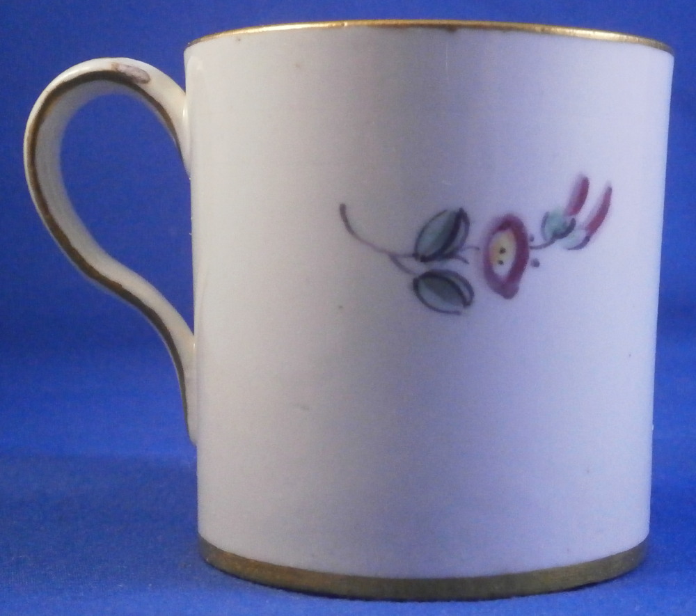 This is a rare small cup made by Alcora of Spain in the late 18th century. The full name of the maker is Real Fábrica del Conde de Aranda ( l'Alcora ) and it is really hard to find pieces by this maker! Plates and cups are found mostly in museums and often damaged. The cup is hand painted with a large floral arrangement to on side and two smaller single flowers to the rest of the space. Gold trim to the edges and handle. This piece would have belonged to the German flower series of dishes inspired by the engravings of Weidemann . The design was introduced by Vincente Alvaro after a stay in Paris which explains why it looks so French in style. The quality of the porcelain is very nice! The piece is marked with their typical A mark in underneath as well as another incised. The piece is in great condition with a firing flaw to the top of the handle and a chip to the foot ring which is not really visible when on display. I forgot to take a pic of it but you can see it on the underside picture. If you need another jsut let me know and I'll send it over. The cup is 2.125 inches tall and 2 inches in diameter. While it matches the saucer I own in terms of design it is too small for it so they are not a perfect match. Please email me for more information or other pictures.