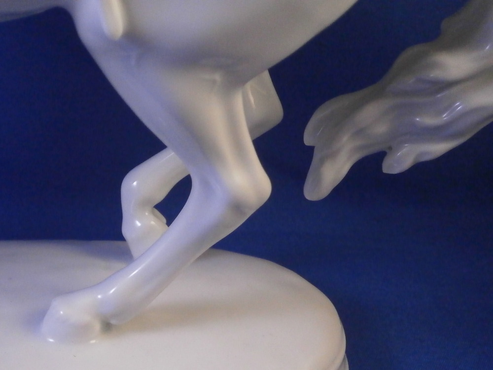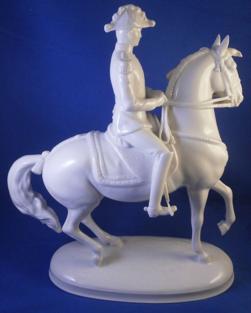 This is a figurine made by Augarten in the 20th century. The white version of the more common painted examples. The figure is from the series of figures depicting different pieces of the Spanish Riding School in Vienna this one being called Pirouette. Super modeling and left in the white you can see al that amazing detail that the painting usually coverns up like the veins in the skin, etc. Hard to find the white examples in perfect condition as is the case here! The figure is 9.5 inches tall, 3.5 inches wide and about 8.125 inches long. The piece is marked underneath with the blue shield with the crown on top as well as the word Wien underneath, impressed letter H, impressed 1668 and Made in Austria impressed. There is a line cut below the mark so it is a second choice piece though I do not know why. Please email me for more information or photos.