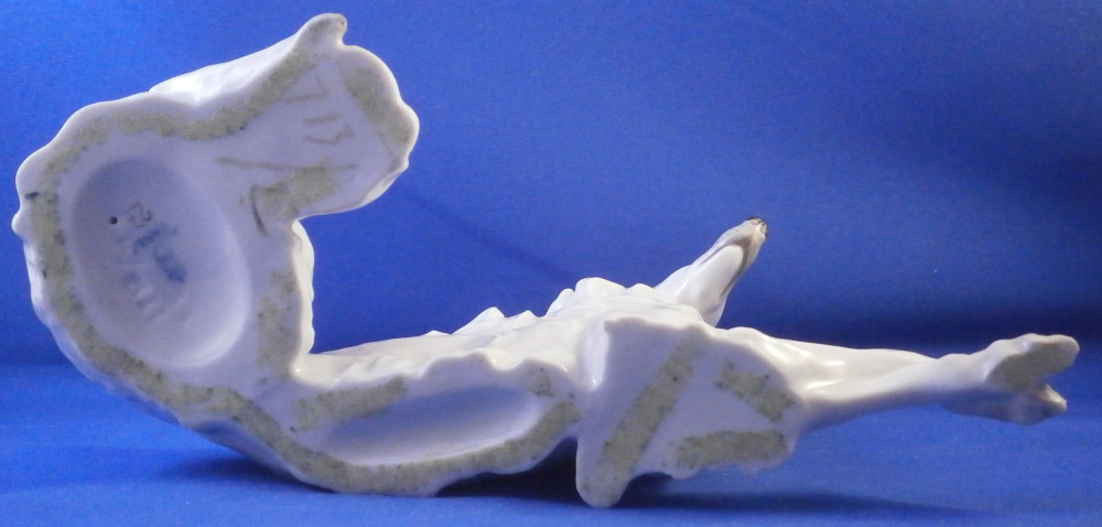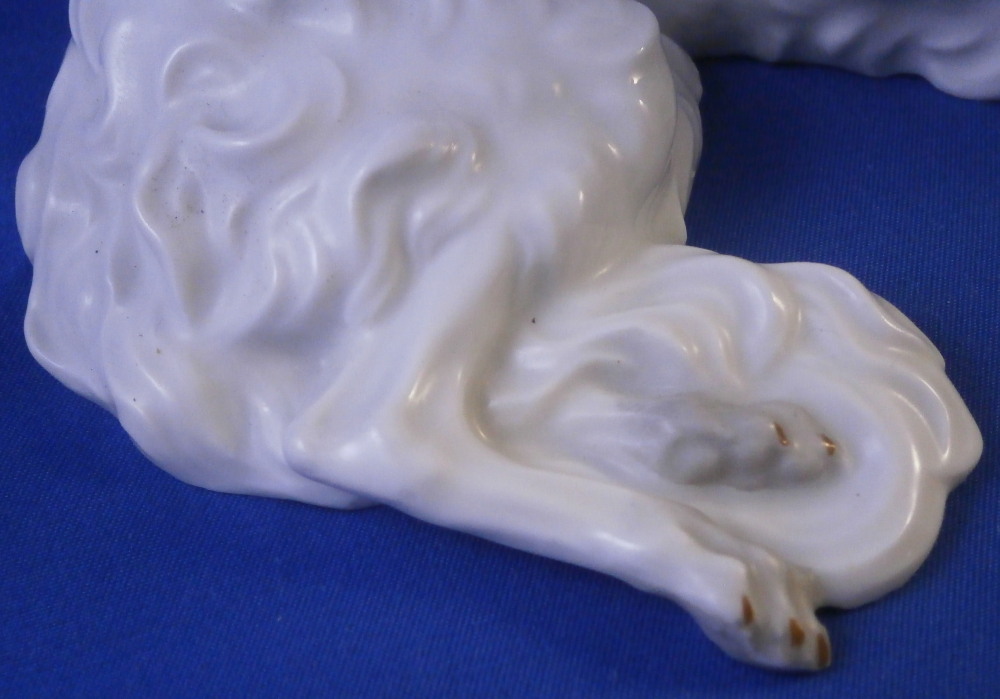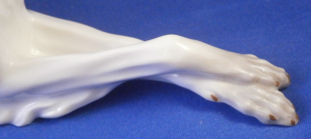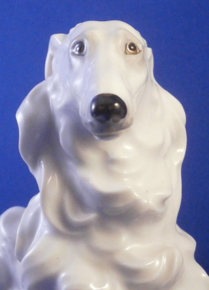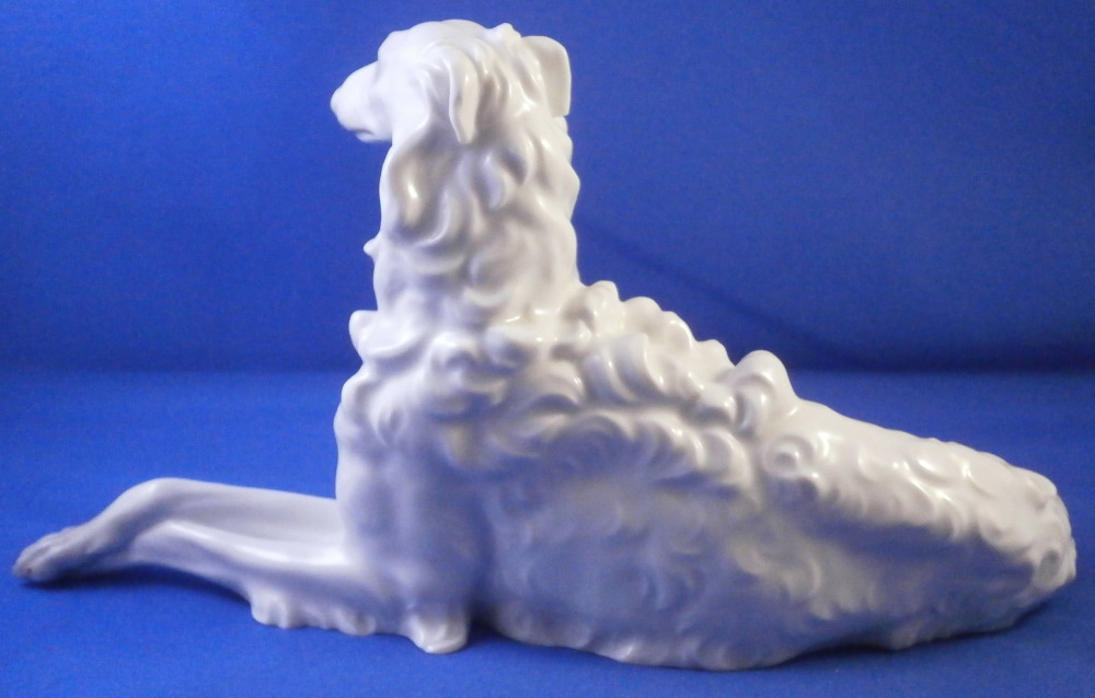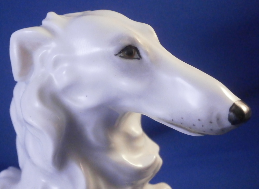 This is a figurine of a Russian Wolf dog / Wolfhound / Borzoi made by Augarten in the mid 20th century. A supebly modeled figure with lots of detail to it and hand painted just enough to look amazing! The fur is superbly done as is the detail of the face and paws. One of their nicer models for sure. The figurine is the medium sized version being 4.25 inches tall, 8 inches long and 3.75 inches deep. It is in perfect condition. Marked underneath with the blue shield with the crown on top as well as the word Wien underneath, impressed number 1713/II , as well as Made in Austria impressed and a painter's mark 27. as shown. Please email me for more information or photos.