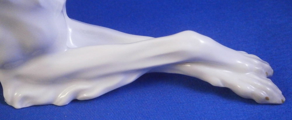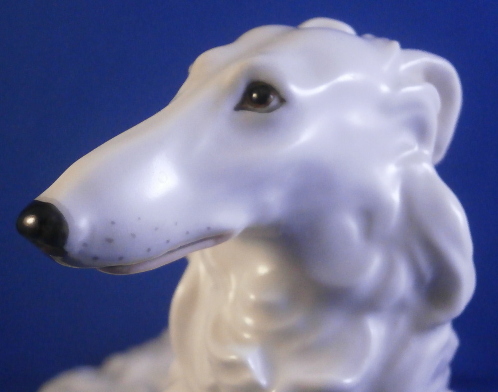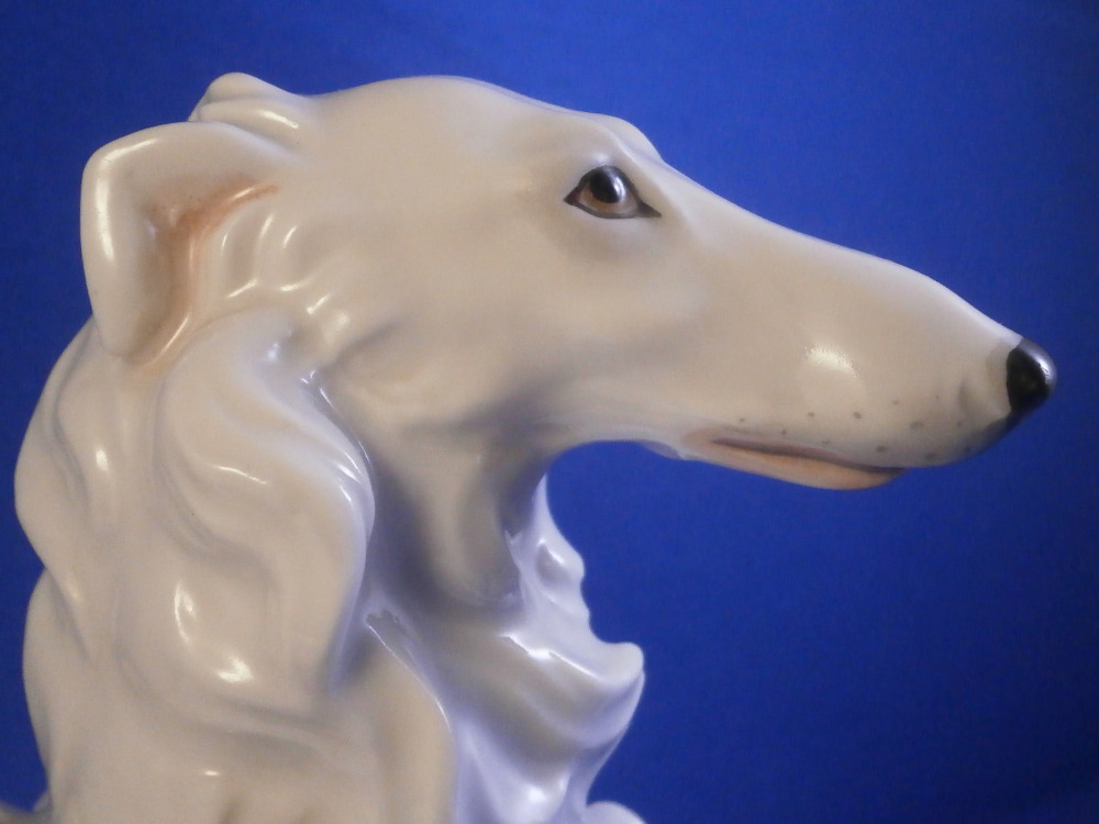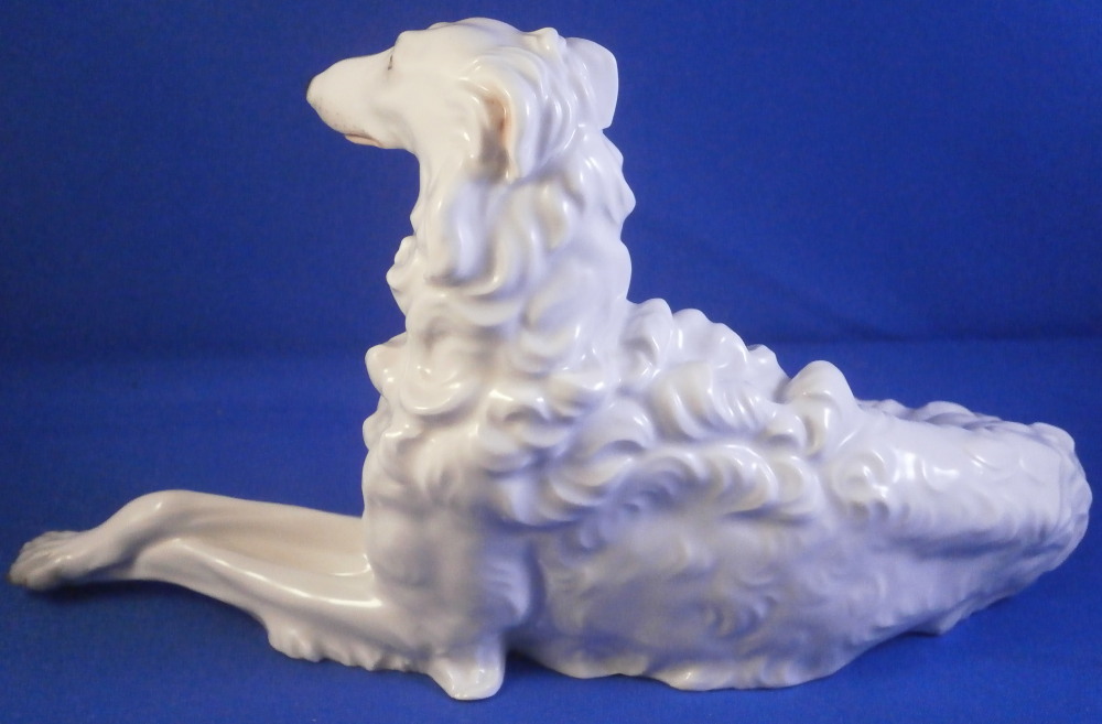 This is a figurine of a Russian Wolf dog / Wolfhound / Borzoi made by Augarten in the mid 20th century. A superbly modeled figure with lots of detail to it and hand painted just enough to look amazing! The fur is really well done as is the detail of the face and paws. One of their nicer models for sure. The figurine is the medium sized version being 4.25 inches tall, 8.125 inches long and 3.75 inches deep. It is in perfect condition. Marked underneath with the blue shield with the crown on top as well as the word Wien underneath, impressed number 1713/II, an inpressed letter F as well as Made in Austria in red and a painter's mark 82 (I think). as shown. Please email me for more information or photos.