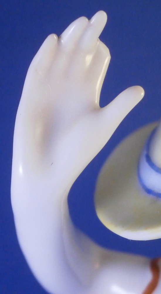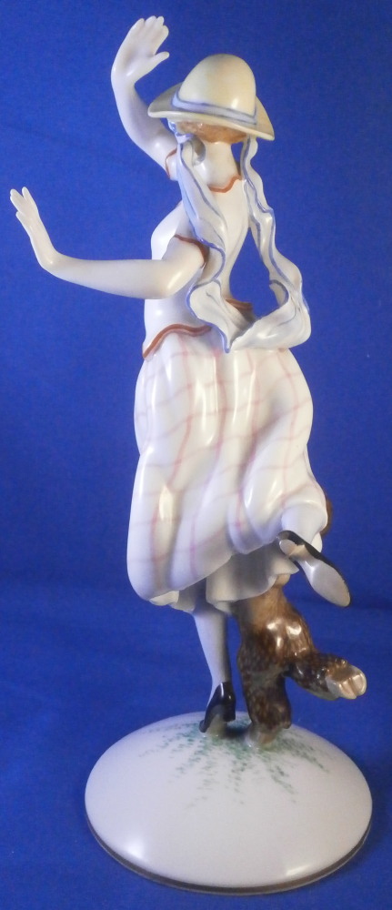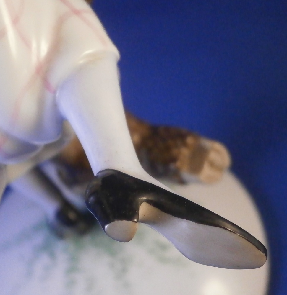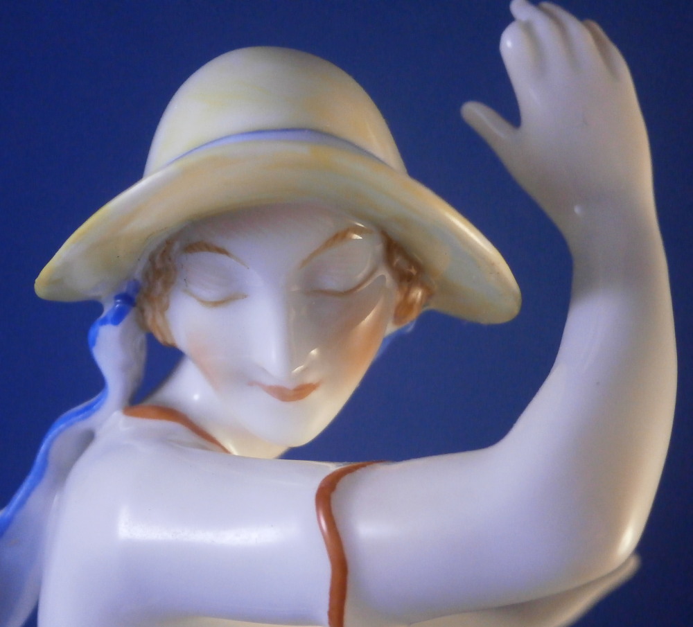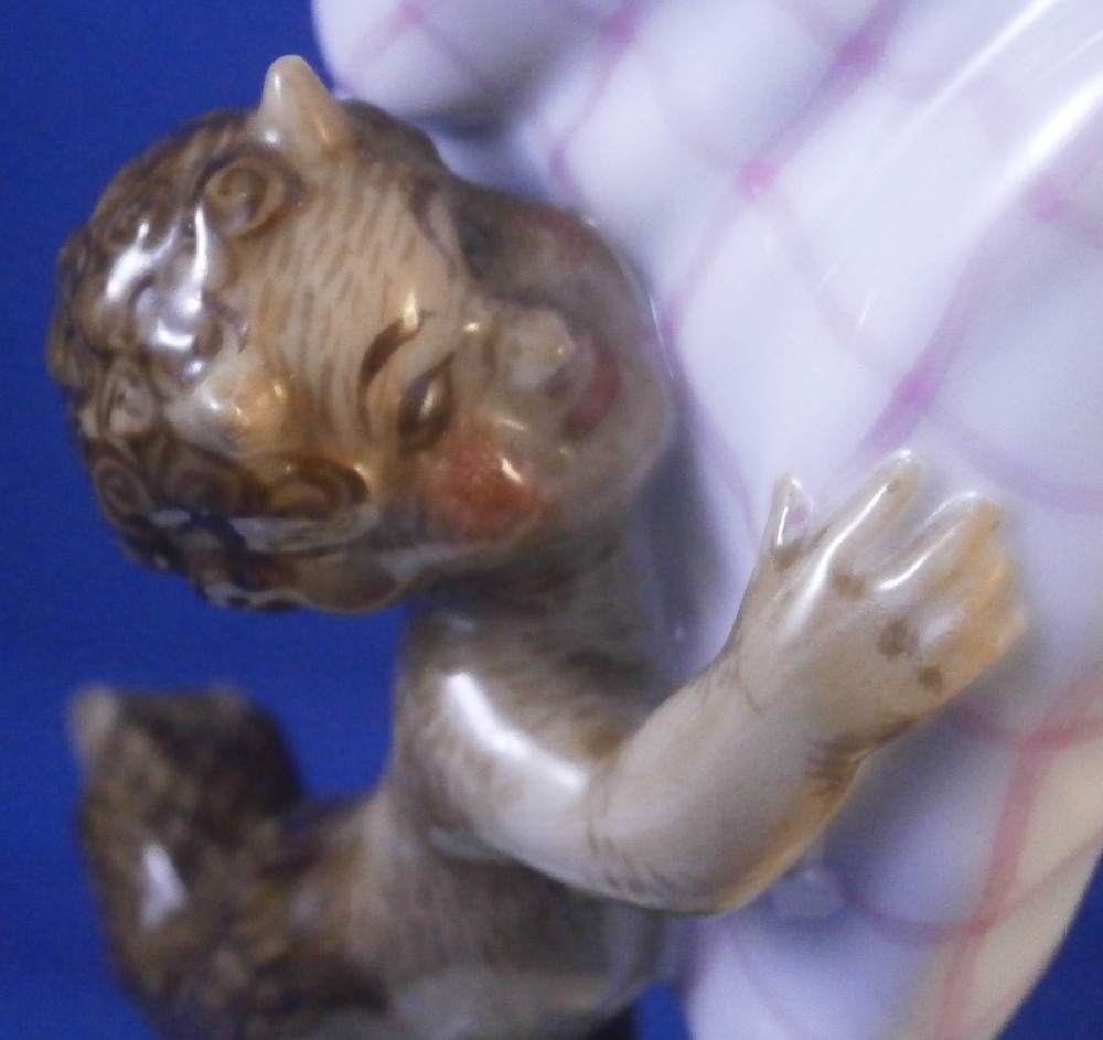 This is a really nice figurine of a lady with a faun by her side made by Augarten in Vienna , Austria. Designed by Carl Schwetz in about 1925 and from the original period. Not a model one sees often at all and the two I did find were restored quite heavily. The figure is of a lady dressed in a cheery outfit dancing with a little faun holding onto her skirt and also dancing. A very typical figurine for this maker and period. They are great and rather hard to find! Superbly modeled and hand painted. The piece is in good condition with just the index finger of the upper (left) hand missing a piece as shown. The location and it not being terrible make it not obvious at all when on display and if need be this would be an easy fix for a decent restorer. The figurine is 9.25 inches tall, 4 inches wide and 4.125 inches deep. Marked underneath with the blue shield with the crown on top as well as the word Wien underneath, Augarten Austria in a red rectangle and impressed model number 1533 plus the remnants of an old sticker. Please email me for more information or photos.
