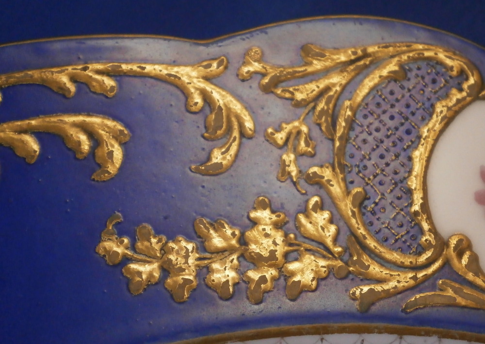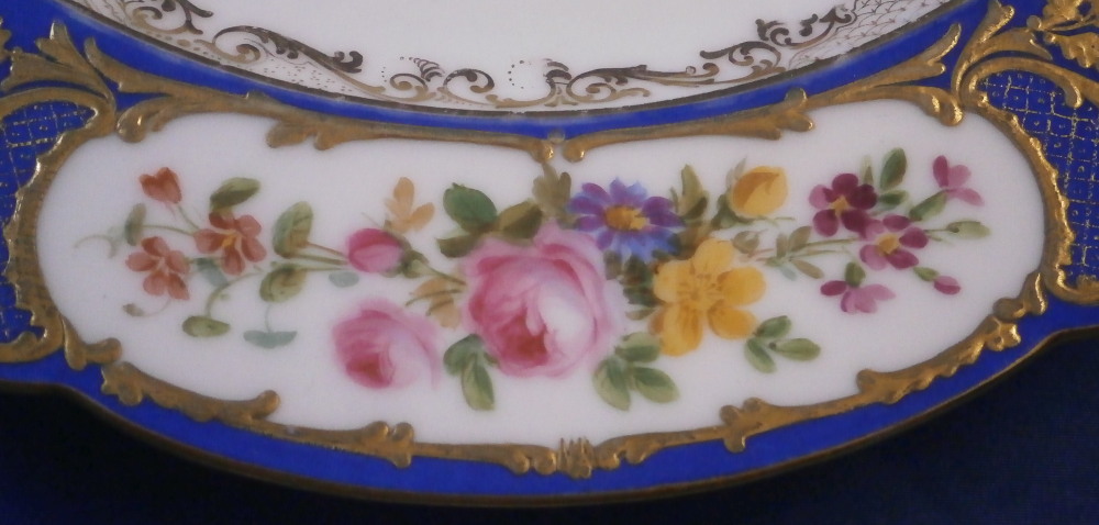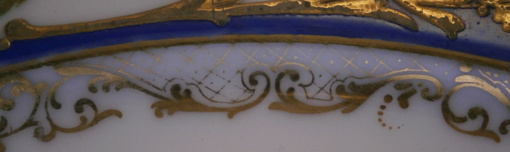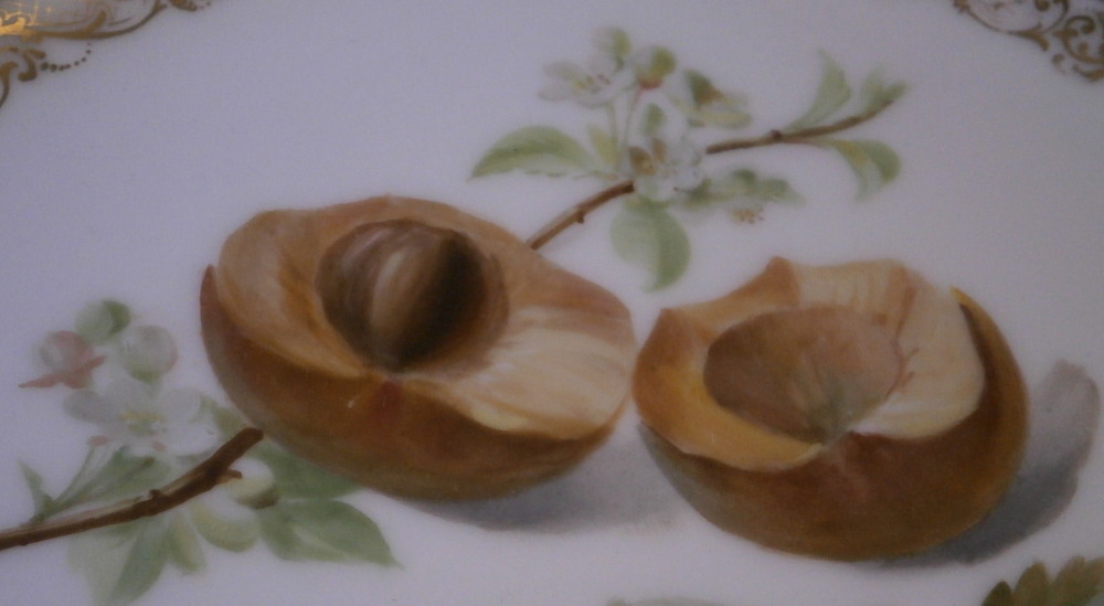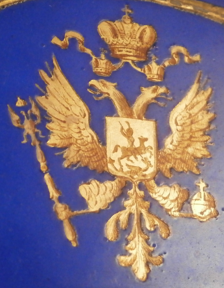 This is a really nice and interesting plate made in the Paris region of France and decorated at the workshop of Boyer Rue De La Paix in the mid 19th century around the late 1850s. This would place them in the time of Tsar Alexander II which fits the armorial used here. Jean-Pierre Feuillet started the studio and was very successful. He enjoyed patronage from the Prince de Condé among many others. In about 1834 Boyer joined him and eventually took over. The plate is superbly hand painted with two different apricot designs in the center. One having two whole fruit on a piece of branch with its leaves still attached and the other a flowering branch with a broken open apricot fruit next to it revealing the pit inside. The edge of the well has a fancy gold trim to it and the rim has this royal blue ground color to it with three panels of polychrome flowers on white ground with raised gilding on the blue ground. Off course the most exciting part of the plate is the red and gold Impreial Russian eagle cypher from the reign of Alexander II. Each eagle is wearing a small crown with a larger central crown above it, a scepter in one claw and the orb in the other with the central shield of the coat of arms of Moscow ( St. George slaying the dragon ). There are some French plates made for he Russian imperial family, usually for their summer residence in the south of France. Quite rare but you do see some from time to time though I ahve not come across any that are as nice as this example in a long time! A stunning looking piece! The plate is in great condition with some minor wear to the raised gilding along the rim of the plate. It displays perfectly and looks amazing plus not something you will find again anytime soon if ever. The piece is marked with the gold Boyer Rue de la paix mark as shown as well as Abricots for the title of the scene. The plate is 10 inches in diameter and 0.875 inches tall so a nice size for displaying. Please email me for more information or other pictures.
