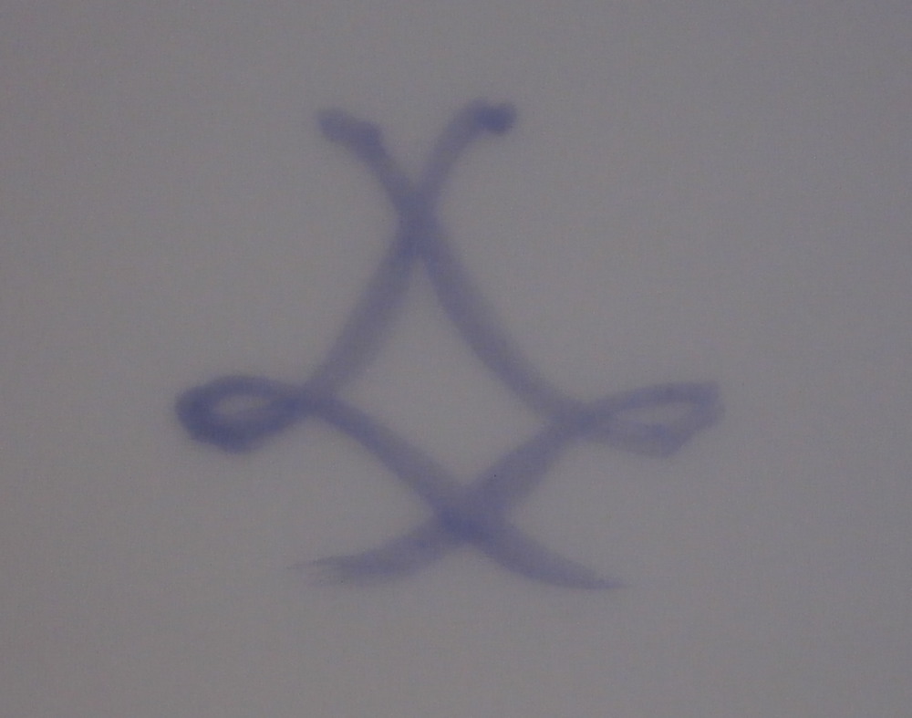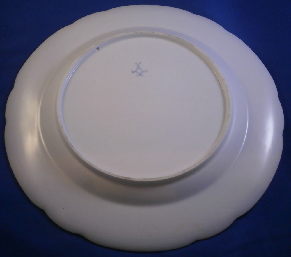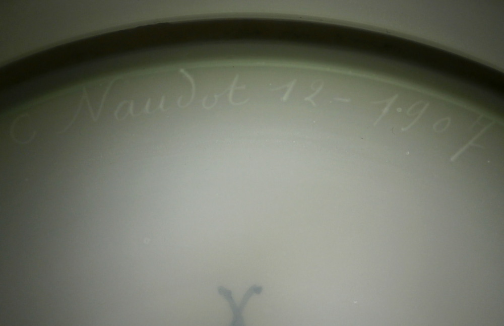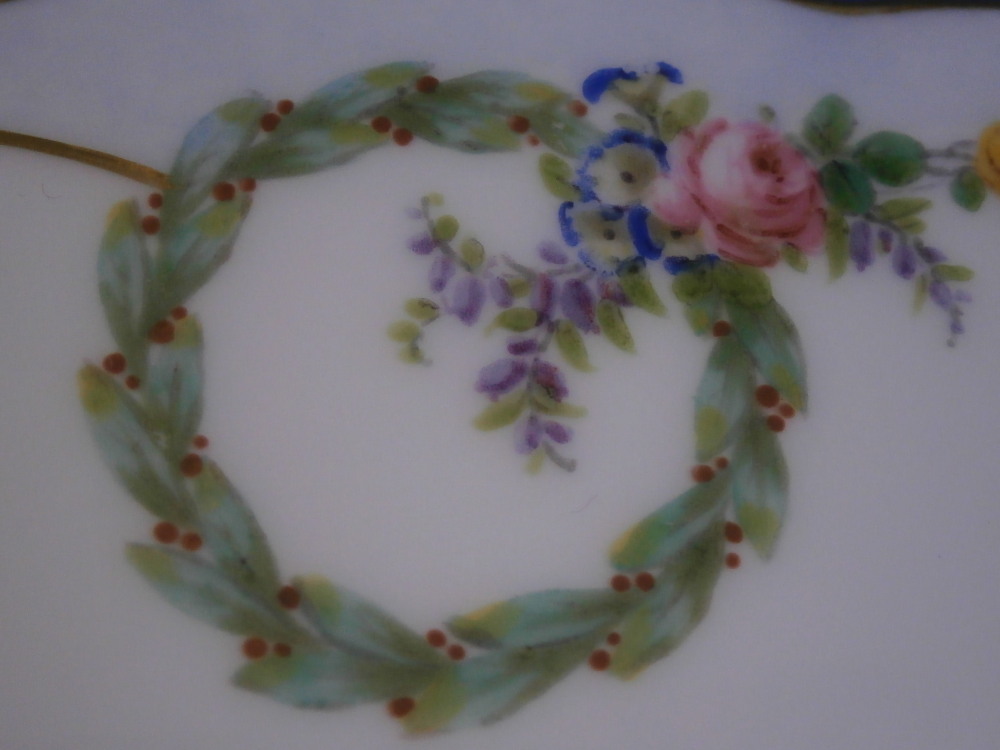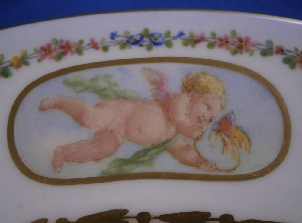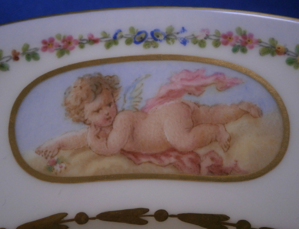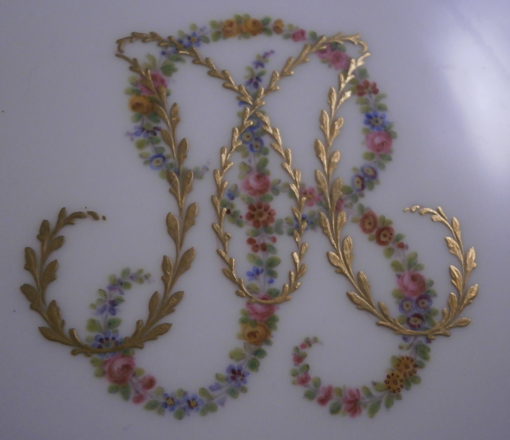 This is a really interesting plate made by Camille Naudot in 1907. It is off course after the much more famous Sevres design used for the service made for Madame du Barry as well as another one made for Charlotte-Louise. Camille Naudot copied these pieces in very much the same detail and quality since there was a need for replacement pieces or colelctors wanted a more affordable version of these pieces. Off course they were done on hard paste porcelain instead of soft paste but all in all they are superb pieces! The plate here has three different cartouches of a putto / cherub / angel doing different things. Each cartouche is surrounded by a gold frame. There are also three hand painted baskets filled with flowers along the rim plus leaf wreaths connected by floral garlands. Some gold trim to the edge as well as a gold design to the well edge and the one reseaon I could not resist the piece - the initials MB in the center in tiny flowers and gold leaves. The quality of the painting is top notch and the price somewhere around 1-2% of the original so I see why he made them! The plate is in perfect condition. It is marked with an interlaced double L mark in the back as well as some incised marks as shown. Very much like the real plates except this is a copy. The plate is 9.75 inches in diameter and 0.875 inches tall. Please email me for more information or other pictures.