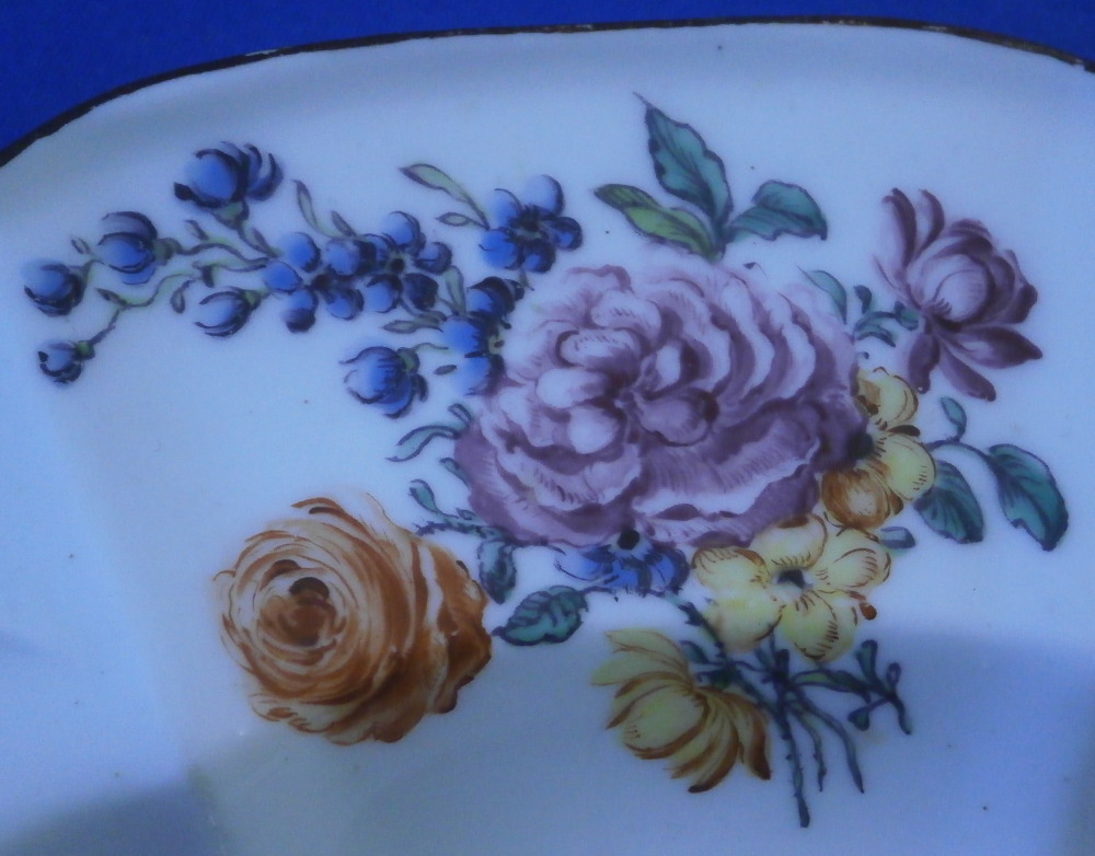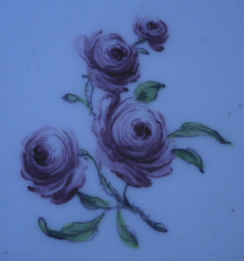 This is a rare plate made by Chelsea around 1755. It is made of soft paste porcelain and hand painted with four nice floral arrangements along the rim with the spaces between them having a relief floral design to the paste. The center has a single rose to it with multiple blossoms and there is another relief design around the outer well. The porcelain has a nice shape to it and the rim has their typical brown trim to it. Very reminiscent of the Gotzkovsky design made by Meissen. The softpaste combo with their enamel is stunning and dare I say nicer than the German original :) A really nice looking plate. This piece is extremely well done and in pretty much the same condition as the day it was made. No chips, etc. and only very minor wear to the brown trim and a chip to the foot ring that is glazed and from when it was made. A couple of small firing spots as is normal to their early wares. A really nice example! The dish is marked with their red anchor mark as well as a number 4 as shown. Likely a pattern mark rather than a painter's mark. It also has the typical spur marks on the back from firing and the moons when you shine a light through it. The piece is 1.125 inches tall and just over 9.125 inches in diameter. Please email me for more information or other pictures.