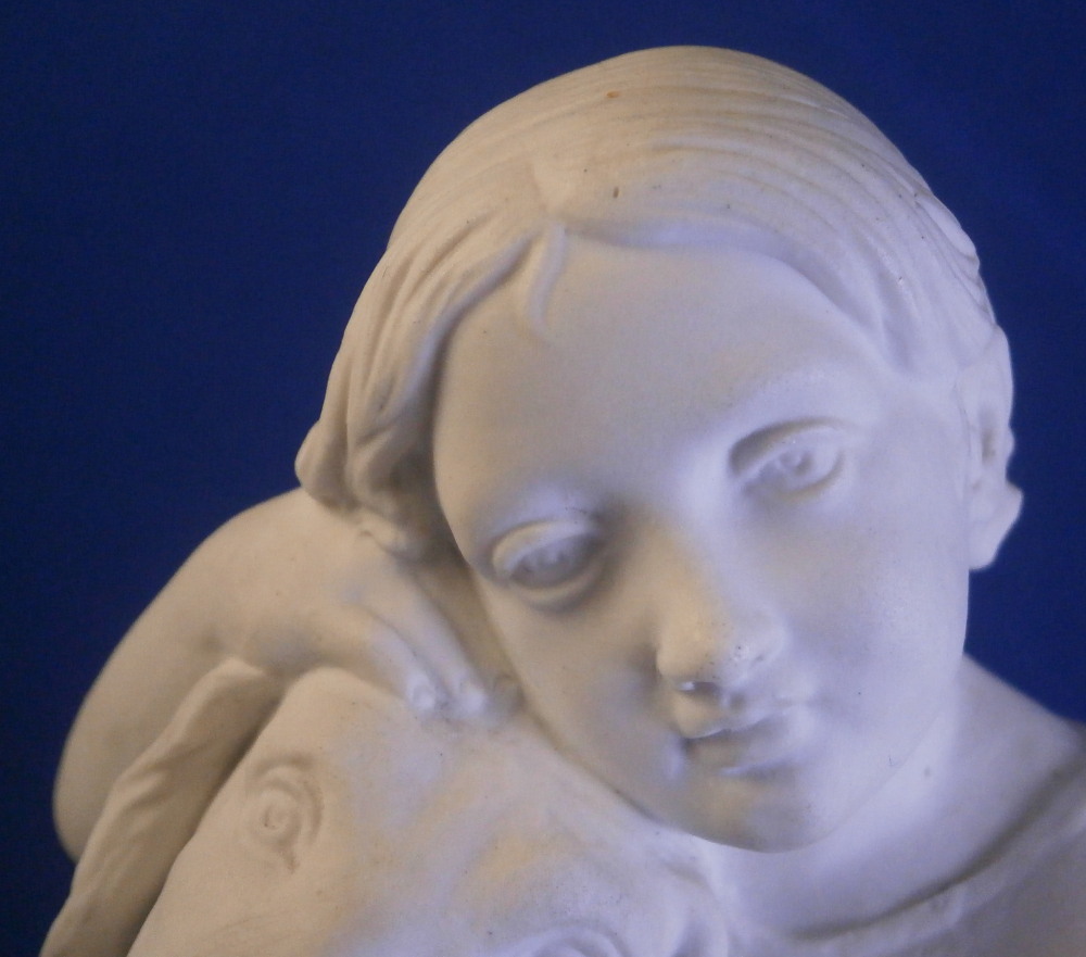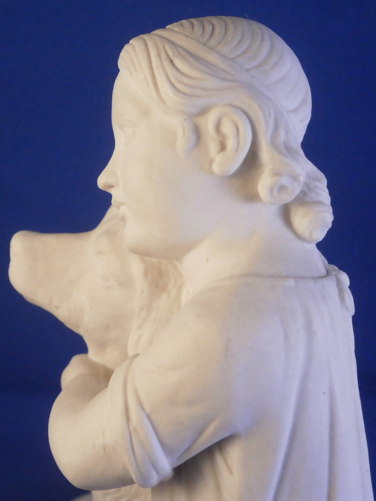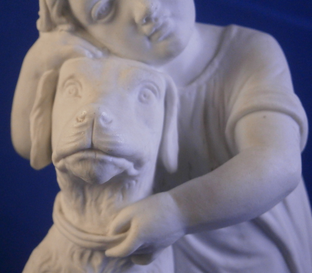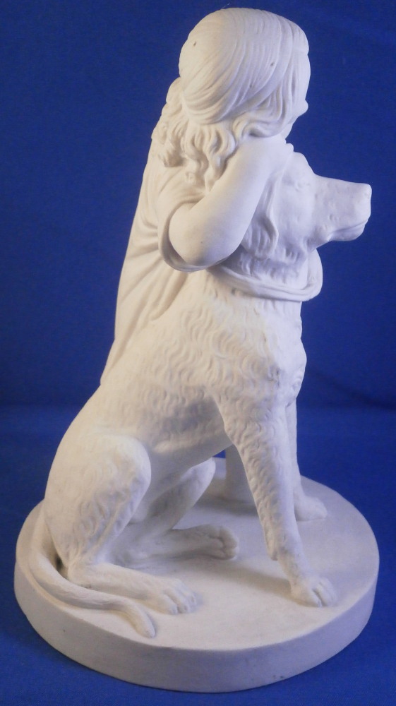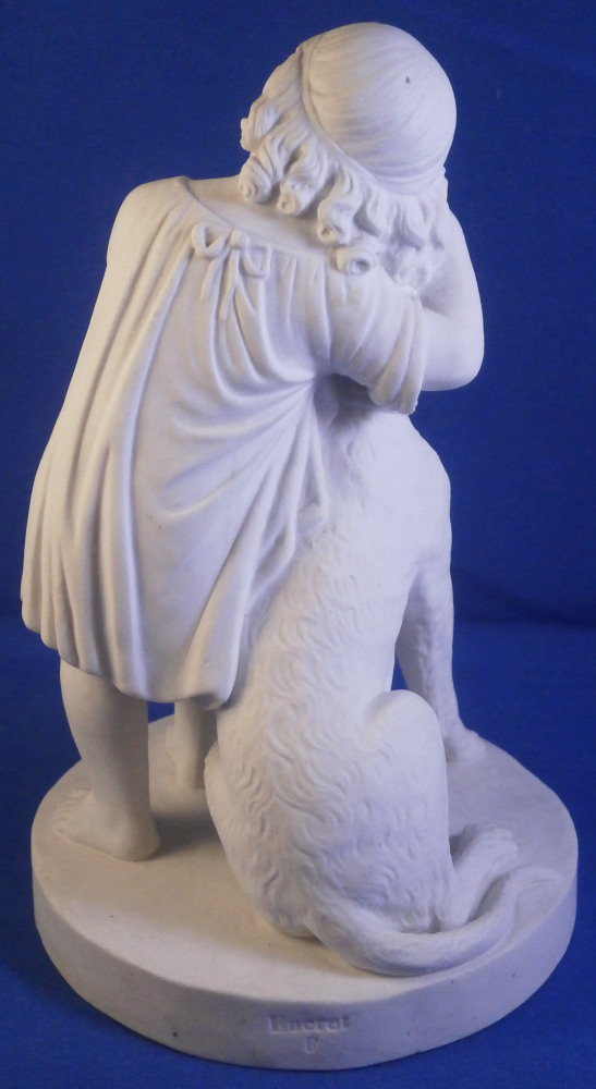 This is a superb biscuit porcelain figurine made by Royal Copenhagen in the late 19th century. It is of a young girl snuggling her rather large dog. The girl is wearing a night gown and standing next to the dog while holding his collar. The dog is sitting on the plain round base. The figure is unglazed which shows off all that amazing detail that is often hidden by the glaze. Just stuning! The piece is in great condition with a tiny chip to the underside base and a larger one. The larger one I am showing from both views - underside and side. I could not find this model anywhere so it is definitely not a common one! The bottom of the base is marked with the wavy three blue linesand the back side has the word Eneret (I think it stands for Copyright) with the letter F. under it impressed as shown. The figurine is 6.125 inches tall with the base having a diameter of 4 inches. Please email me for more information or other pictures.