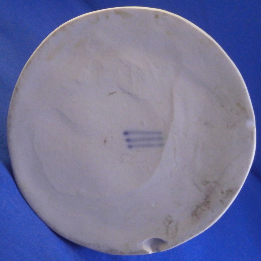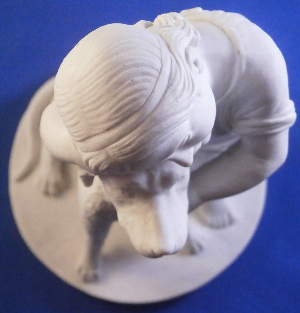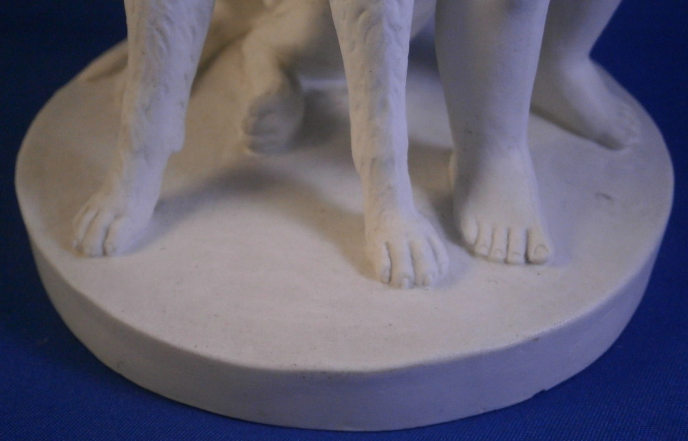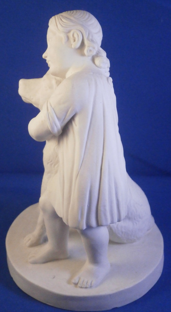 This is a superb biscuit porcelain figurine made by Royal Copenhagen in the late 19th century. It is of a young girl snuggling her rather large dog. The girl is wearing a night gown and standing next to the dog while holding his collar. The dog is sitting on the plain round base. The figure is unglazed which shows off all that amazing detail that is often hidden by the glaze. Just stuning! The piece is in great condition with a tiny chip to the underside base and a larger one. The larger one I am showing from both views - underside and side. I could not find this model anywhere so it is definitely not a common one! The bottom of the base is marked with the wavy three blue linesand the back side has the word Eneret (I think it stands for Copyright) with the letter F. under it impressed as shown. The figurine is 6.125 inches tall with the base having a diameter of 4 inches. Please email me for more information or other pictures.