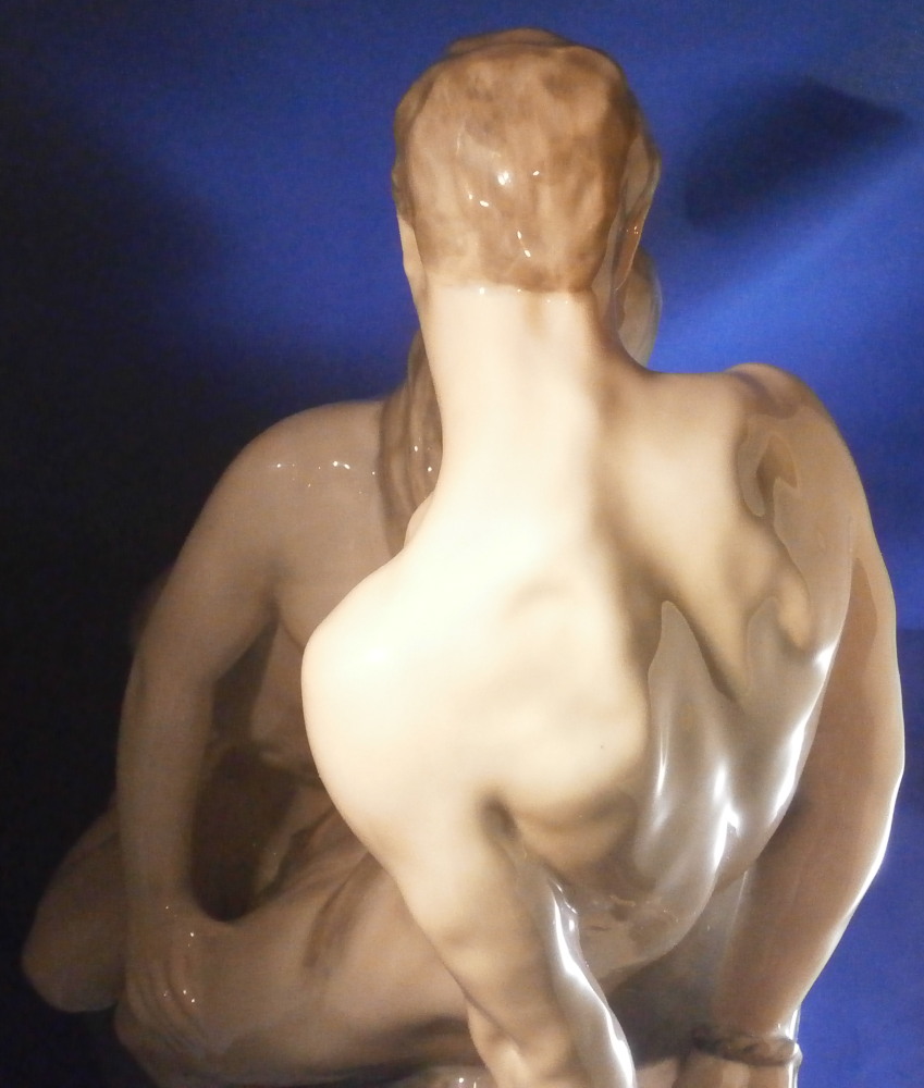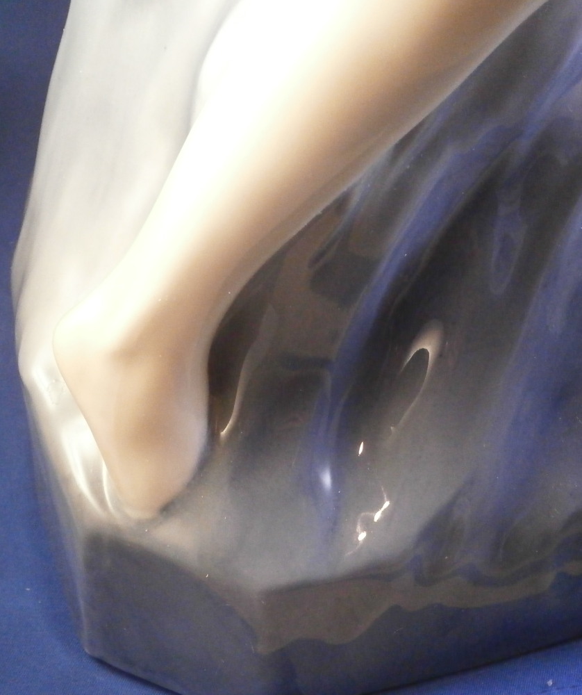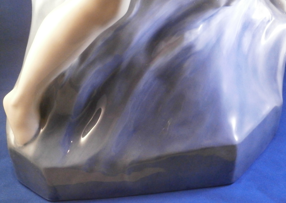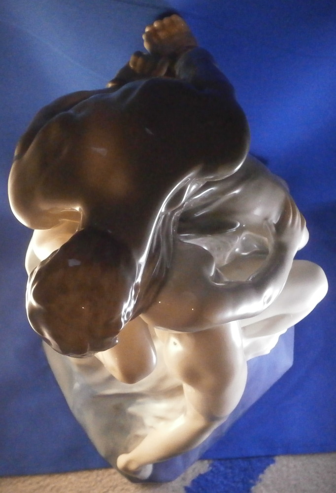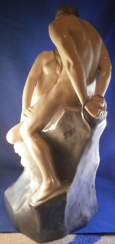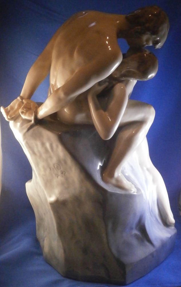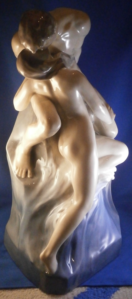 This is a superb and quite large figurine made by Royal Copenhagen in 1937 if I figured out the date code correctly. The mark is not super clear but the line does appear to be above the letter Y which would date it to 1937. The figurine is called the wave & rock figurine or the kiss or even kiss on the beach. It is of a nude lady kissing a nude gentleman that has his hands tied behind his back. It is from the story of Prometheus kissing a sea nymph. The figures are sitting on some rocks that have waves hitting the sides.The piece was first modeled by Theodor Lundberg probably in 1897 given the impressed artist mark to the back of the piece. Model #1132. A very nicely modeled figure that is of a rare size in the world of porcelain, quite heavy and and hand painted to perfection in their typical under glaze colors. The piece is in superb condition with a glaze flaw under his hards that does not show when on display. It is marked underneath with the three wavy blue lines with some letters next to it, Royal copenhagen around a crown in green with Denmark below, model numer 1132 and some impressed numbers and letters as shown. The piece is about 18.5 inches tall, 10.5 inches wide and 8.75 inches deep. Please email me for more information or other pictures.