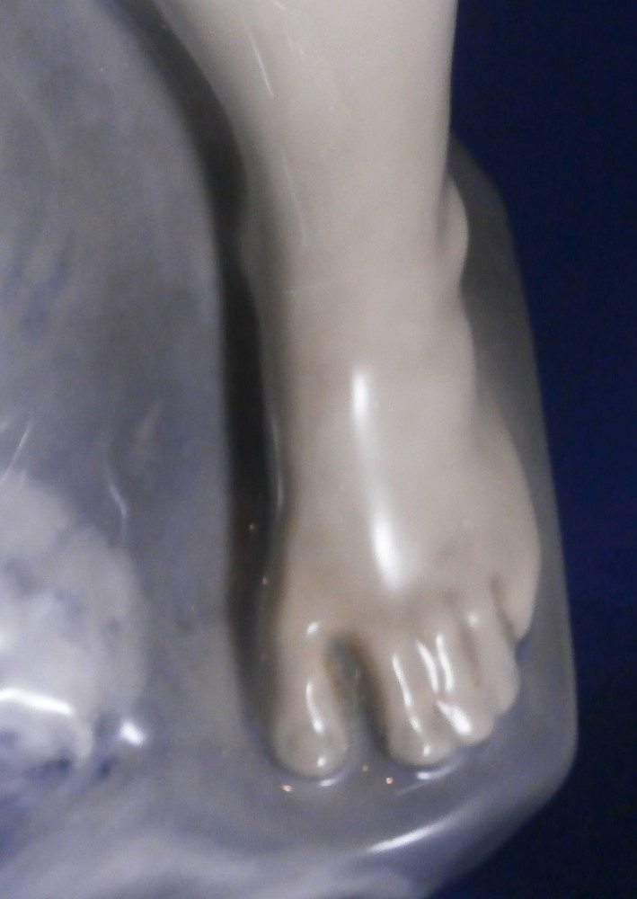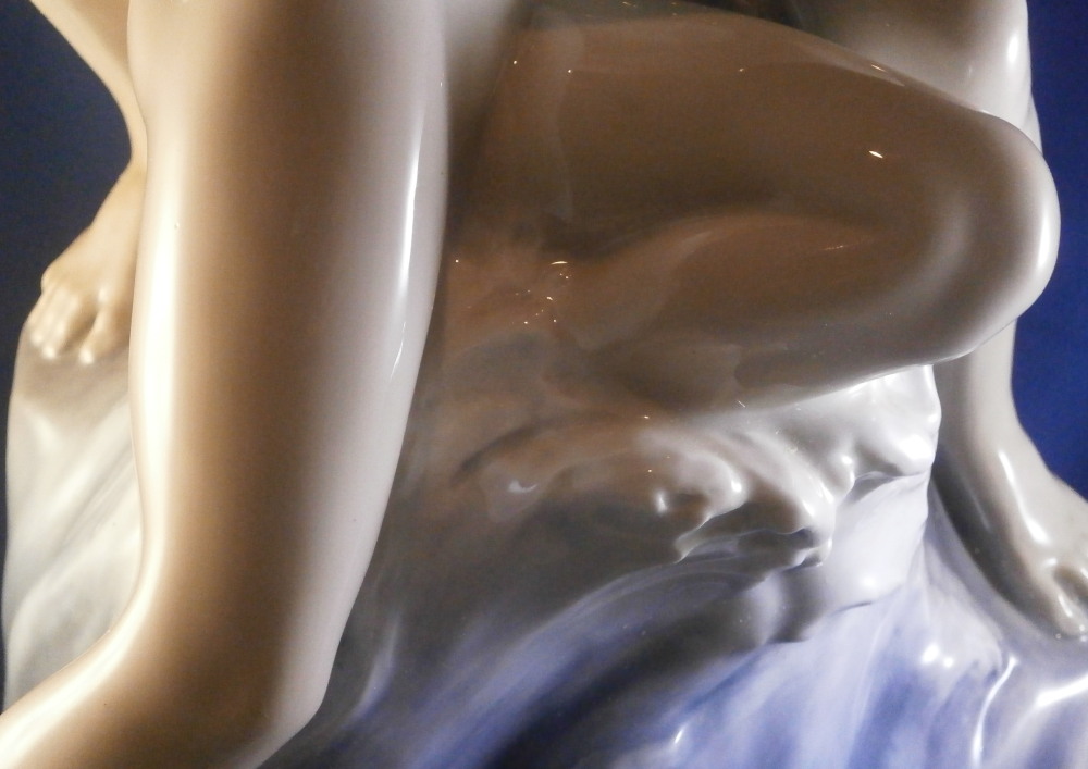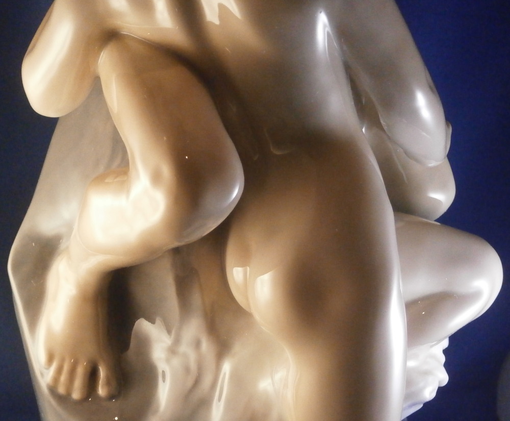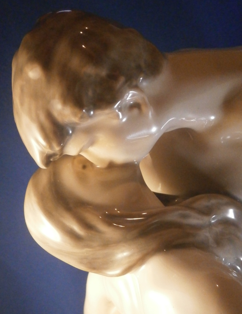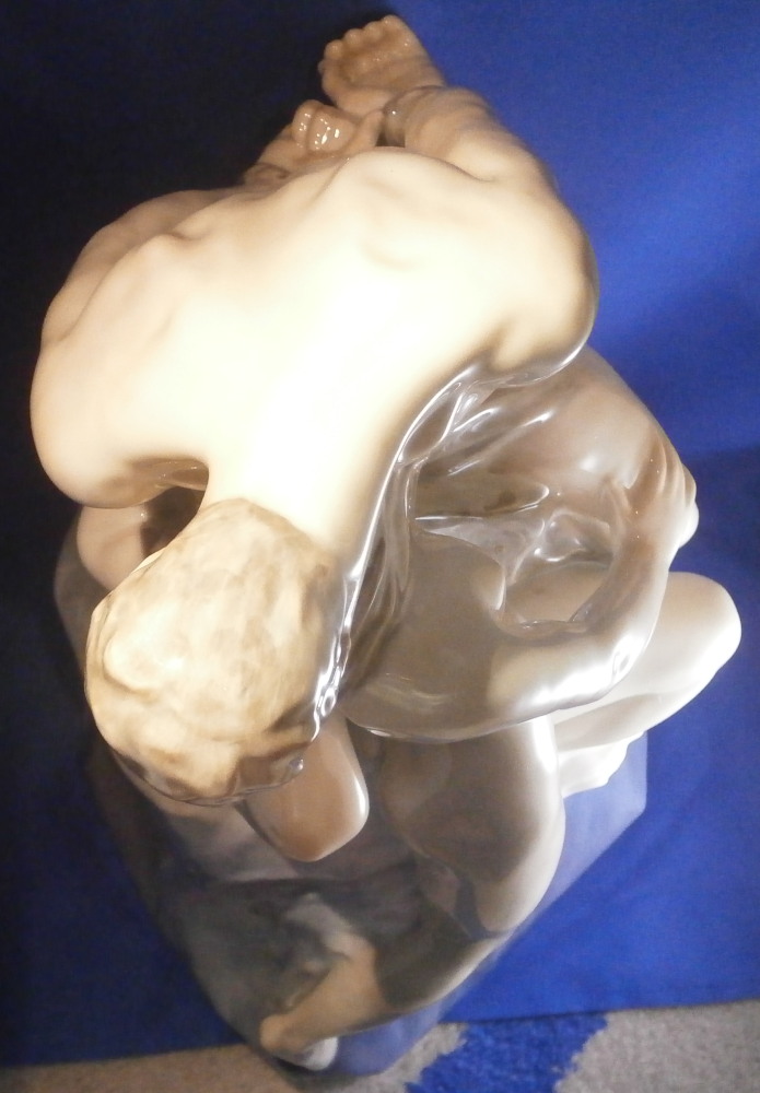 This is a superb and quite large figurine made by Royal Copenhagen in 1937 if I figured out the date code correctly. The mark is not super clear but the line does appear to be above the letter Y which would date it to 1937. The figurine is called the wave & rock figurine or the kiss or even kiss on the beach. It is of a nude lady kissing a nude gentleman that has his hands tied behind his back. It is from the story of Prometheus kissing a sea nymph. The figures are sitting on some rocks that have waves hitting the sides.The piece was first modeled by Theodor Lundberg probably in 1897 given the impressed artist mark to the back of the piece. Model #1132. A very nicely modeled figure that is of a rare size in the world of porcelain, quite heavy and and hand painted to perfection in their typical under glaze colors. The piece is in superb condition with a glaze flaw under his hards that does not show when on display. It is marked underneath with the three wavy blue lines with some letters next to it, Royal copenhagen around a crown in green with Denmark below, model numer 1132 and some impressed numbers and letters as shown. The piece is about 18.5 inches tall, 10.5 inches wide and 8.75 inches deep. Please email me for more information or other pictures.