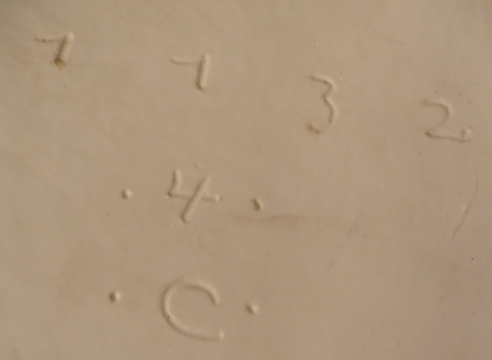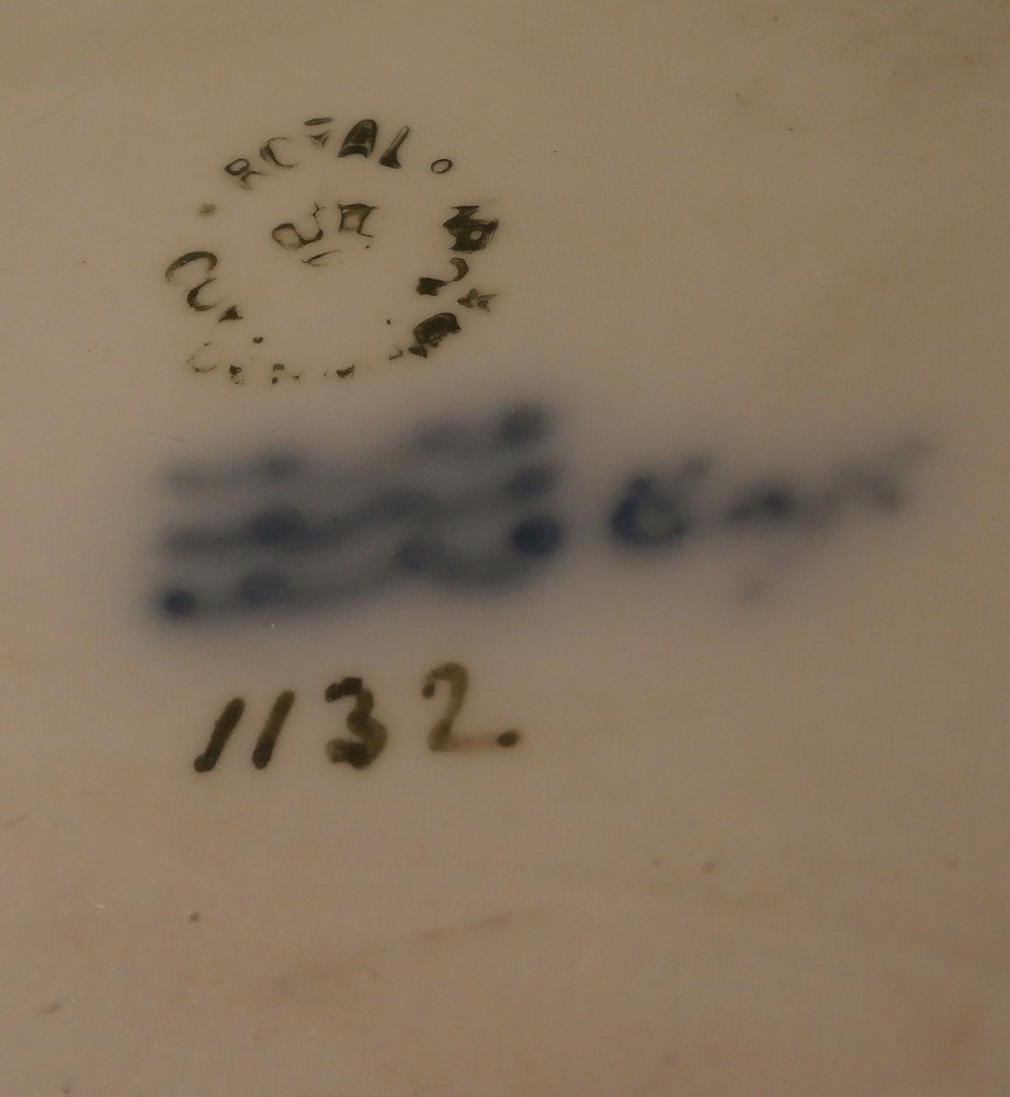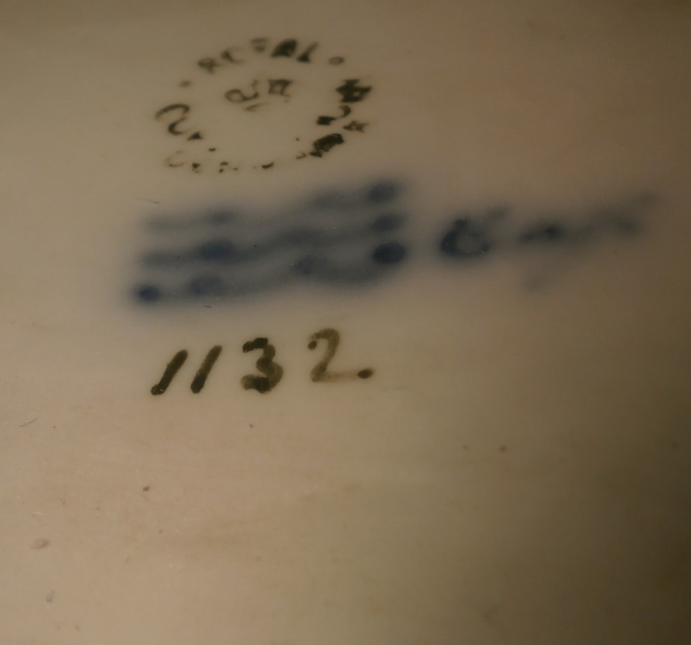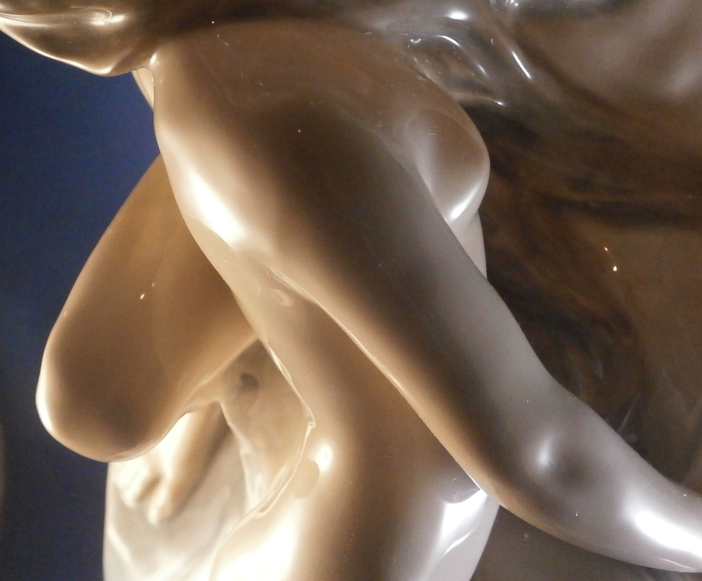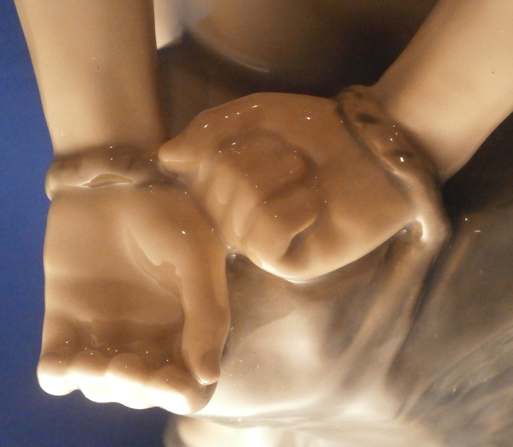 This is a superb and quite large figurine made by Royal Copenhagen in 1937 if I figured out the date code correctly. The mark is not super clear but the line does appear to be above the letter Y which would date it to 1937. The figurine is called the wave & rock figurine or the kiss or even kiss on the beach. It is of a nude lady kissing a nude gentleman that has his hands tied behind his back. It is from the story of Prometheus kissing a sea nymph. The figures are sitting on some rocks that have waves hitting the sides.The piece was first modeled by Theodor Lundberg probably in 1897 given the impressed artist mark to the back of the piece. Model #1132. A very nicely modeled figure that is of a rare size in the world of porcelain, quite heavy and and hand painted to perfection in their typical under glaze colors. The piece is in superb condition with a glaze flaw under his hards that does not show when on display. It is marked underneath with the three wavy blue lines with some letters next to it, Royal copenhagen around a crown in green with Denmark below, model numer 1132 and some impressed numbers and letters as shown. The piece is about 18.5 inches tall, 10.5 inches wide and 8.75 inches deep. Please email me for more information or other pictures.