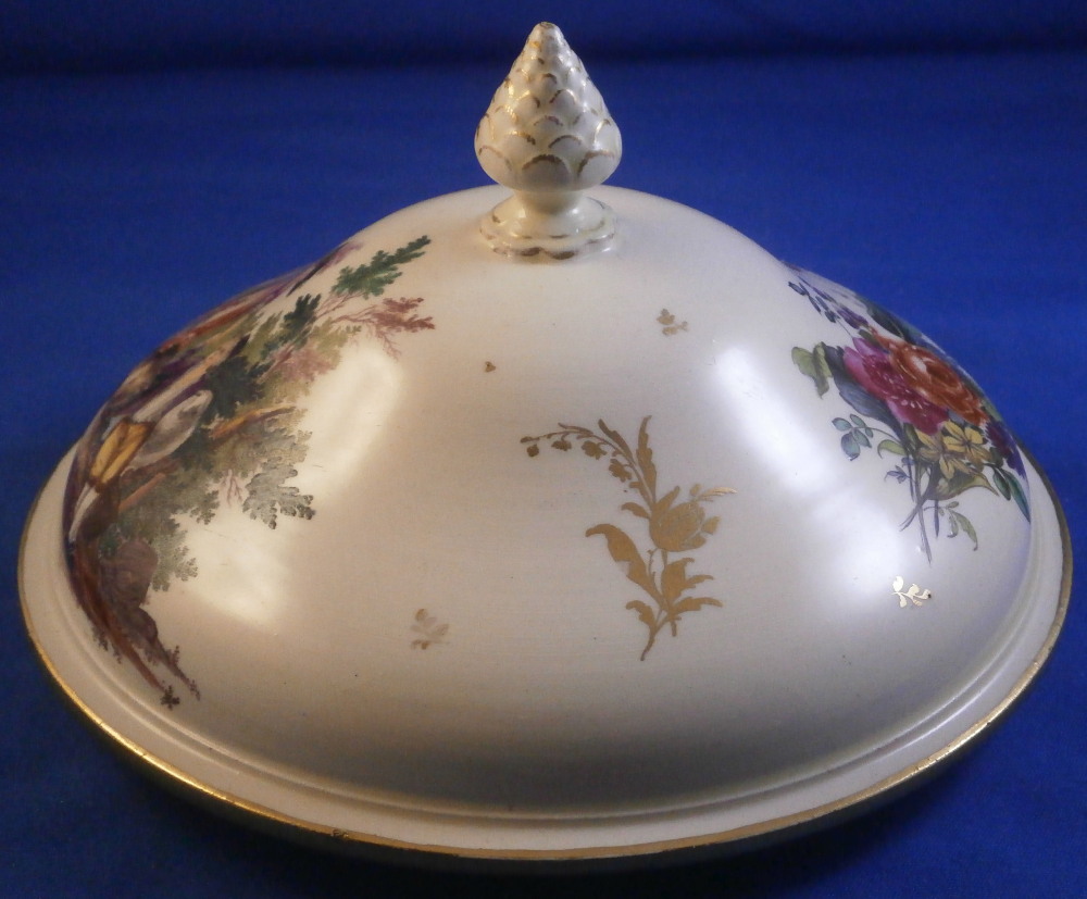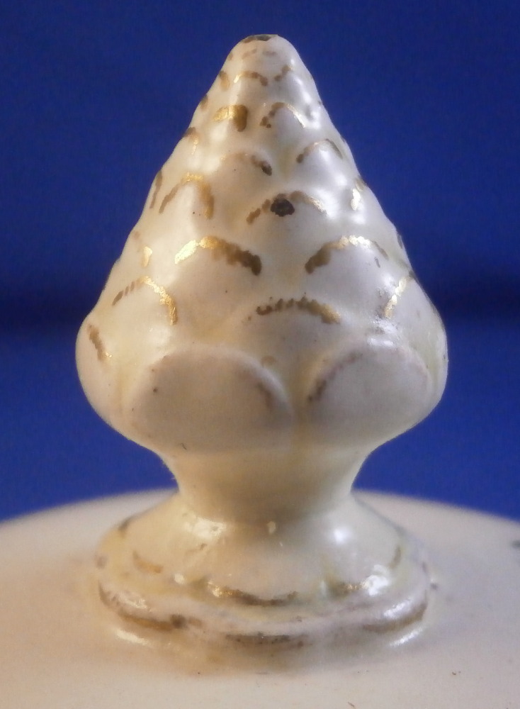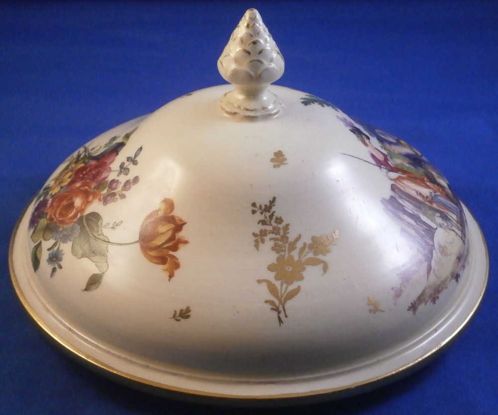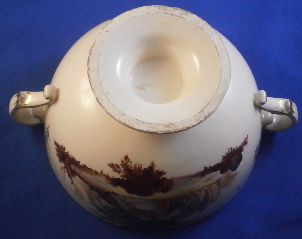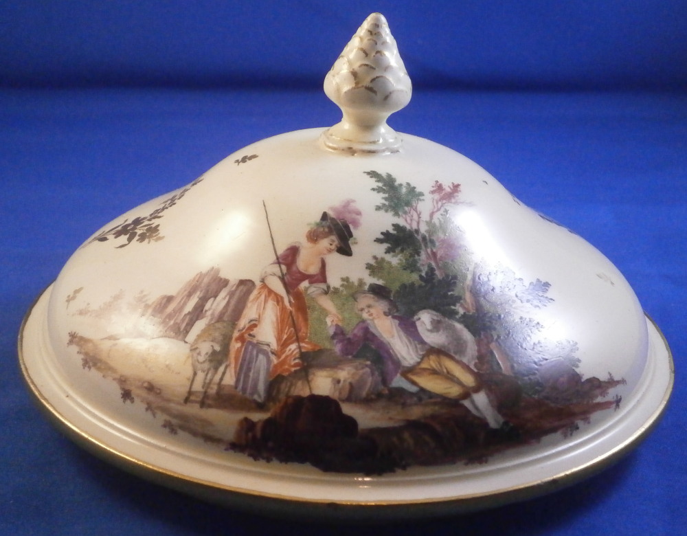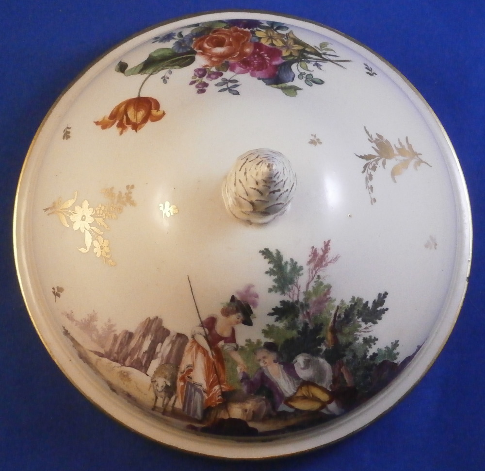This is a really nice lidded ecuelle / large soup cup / small terrine / tureen made of creamware by an unknown maker in the 18th century. A terrific piece for sure! The main body has a nicely shaped handle to each side with some gilt highlights to them and gold trim to the top and bottom edges. The best part however is the decoration! One side has a top notch hand painted polychrome floral arrangement to it while the other side has a top notch hand painted scene to it including a lady in a landscape surrounding, Some gold twigs and flowers next to the handles. The lid has the same type of decoration with another flower arrangement as well as a scene including a shepherdess and a shepherd with their sheep in a landscape surrounding. Pine cone finial highlighted with gilding and gold trim to the edge. The scenes are the nicest I have ever come across on creamware. Wish I knew the maker but no idea. Definitely not English. The lady wearing that hat on the main body reminds me of Dutch decorated pieces but I don't think that is it either. Maybe someone out there has an idea. The scenes reval some of the best on Eruopean porcelain that is for sure. The entire piece is about 6.25 inches tall (including the finial) and 6 inches in diameter. The handles stick out a bit from the main body. The set is in superb condition with the finial having been broken off and restored back on. Invisible unless you really look for it. There is a small chip to the edge of the foot as shown from two different angles. As nice a creamware piece as they come! There is an incised mark to the underside but I cannot make anything out. Maybe a number 6 or letter G. No clue. Any help would certainly be appreciated! Please email me for more information or other pictures.