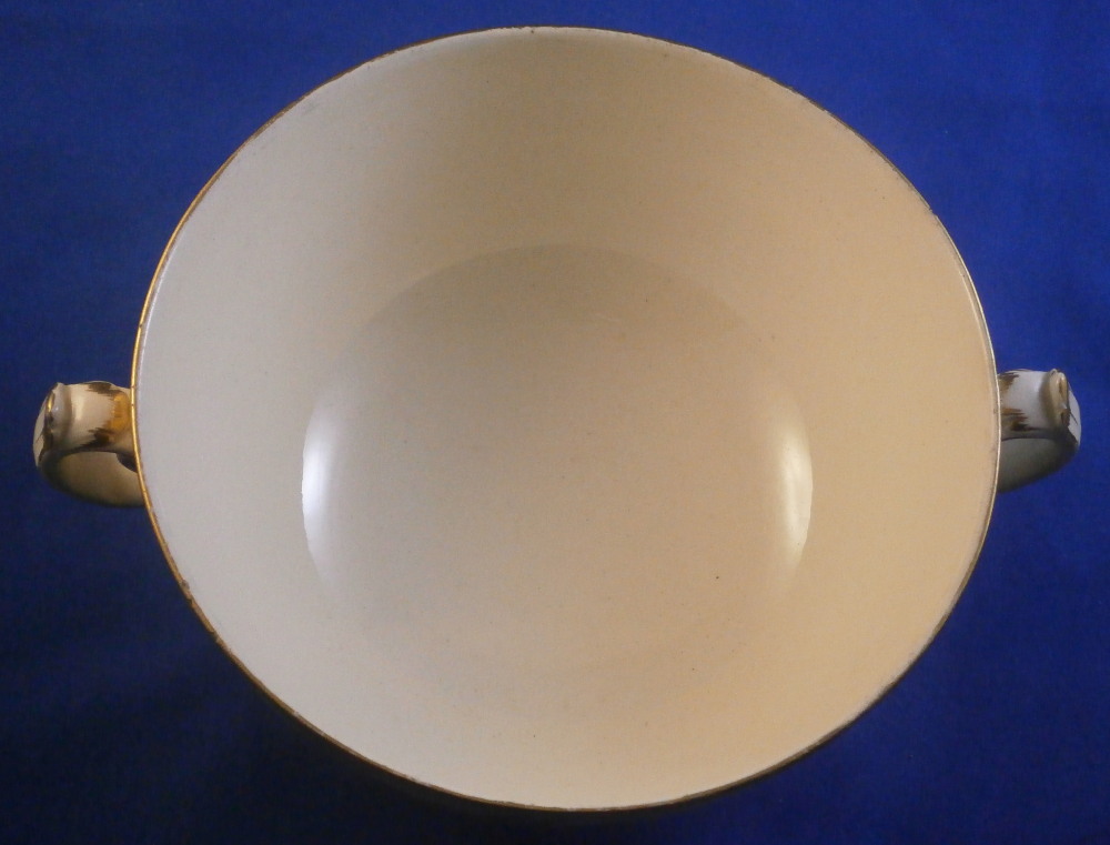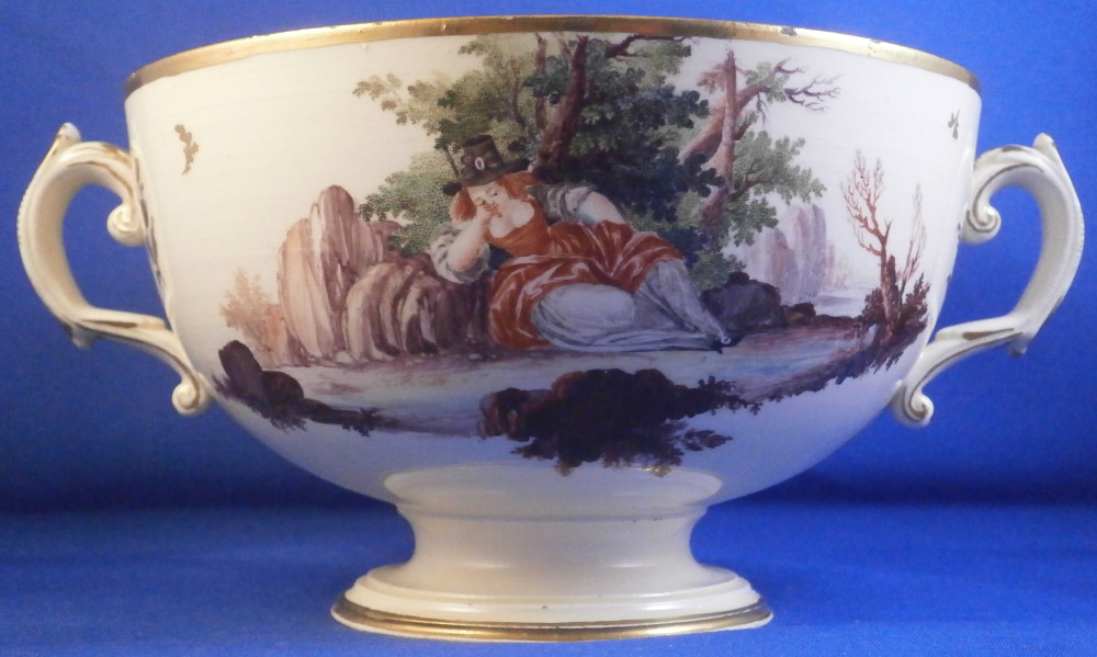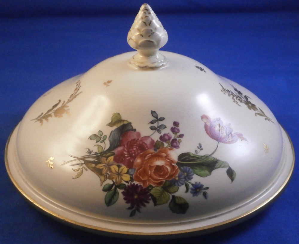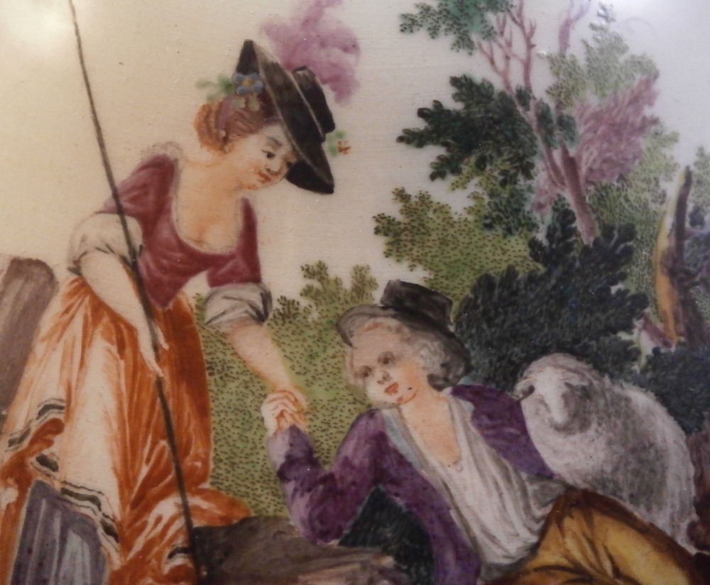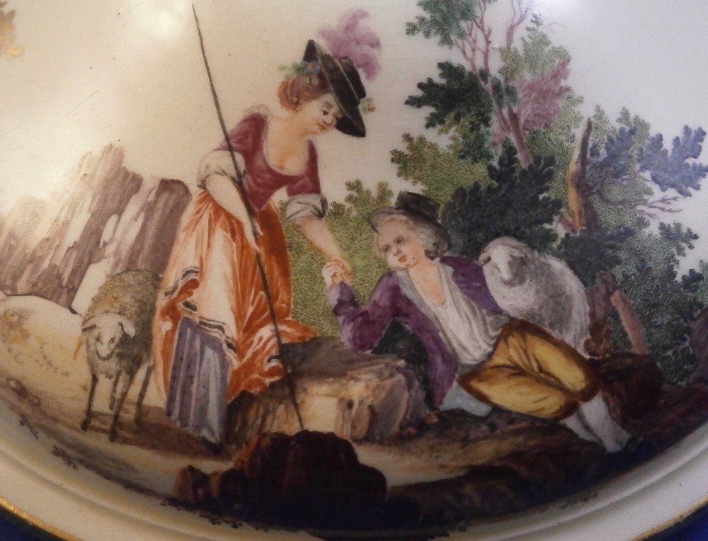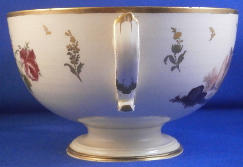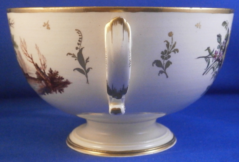 This is a really nice lidded ecuelle / large soup cup / small terrine / tureen made of creamware by an unknown maker in the 18th century. A terrific piece for sure! The main body has a nicely shaped handle to each side with some gilt highlights to them and gold trim to the top and bottom edges. The best part however is the decoration! One side has a top notch hand painted polychrome floral arrangement to it while the other side has a top notch hand painted scene to it including a lady in a landscape surrounding, Some gold twigs and flowers next to the handles. The lid has the same type of decoration with another flower arrangement as well as a scene including a shepherdess and a shepherd with their sheep in a landscape surrounding. Pine cone finial highlighted with gilding and gold trim to the edge. The scenes are the nicest I have ever come across on creamware. Wish I knew the maker but no idea. Definitely not English. The lady wearing that hat on the main body reminds me of Dutch decorated pieces but I don't think that is it either. Maybe someone out there has an idea. The scenes reval some of the best on Eruopean porcelain that is for sure. The entire piece is about 6.25 inches tall (including the finial) and 6 inches in diameter. The handles stick out a bit from the main body. The set is in superb condition with the finial having been broken off and restored back on. Invisible unless you really look for it. There is a small chip to the edge of the foot as shown from two different angles. As nice a creamware piece as they come! There is an incised mark to the underside but I cannot make anything out. Maybe a number 6 or letter G. No clue. Any help would certainly be appreciated! Please email me for more information or other pictures.