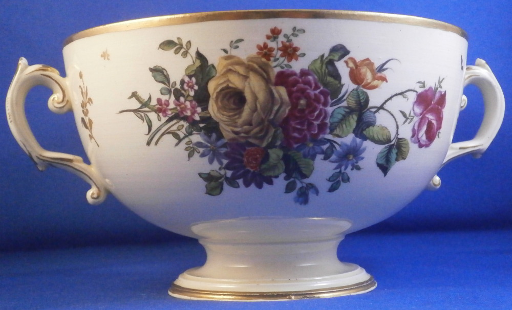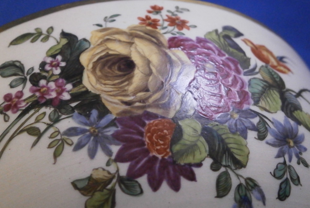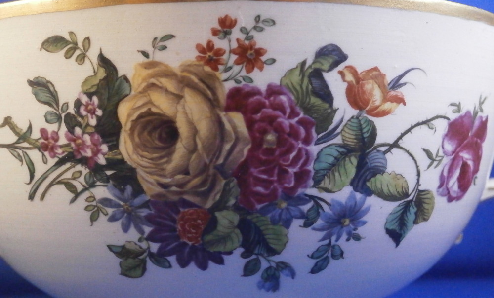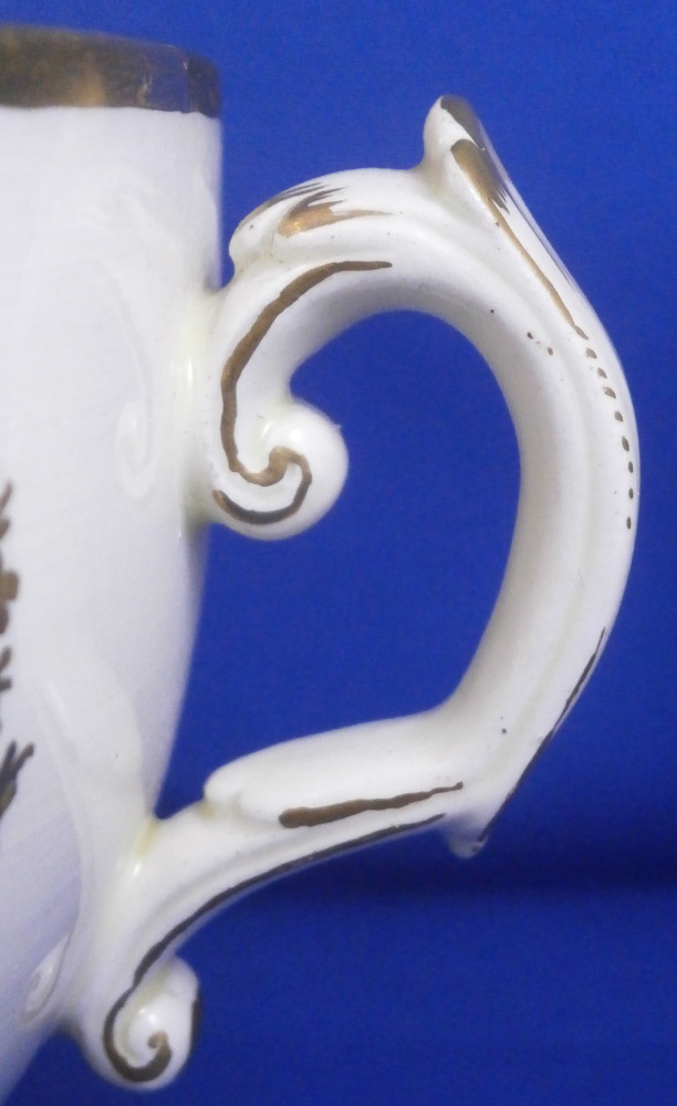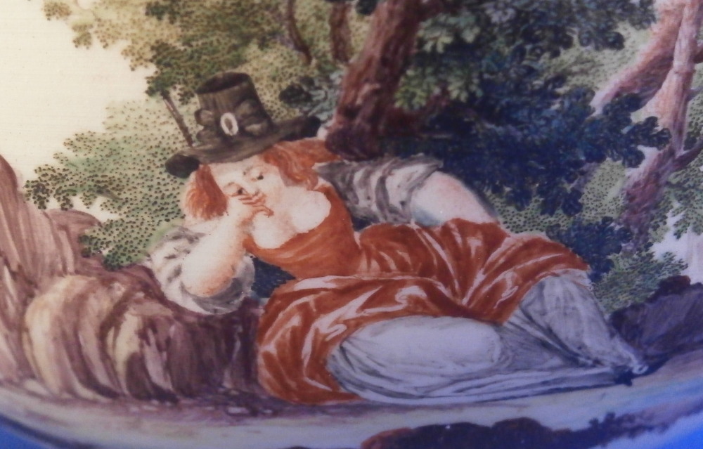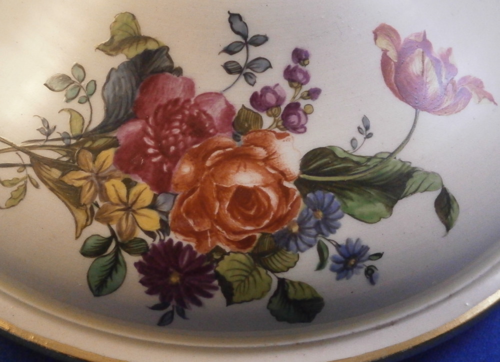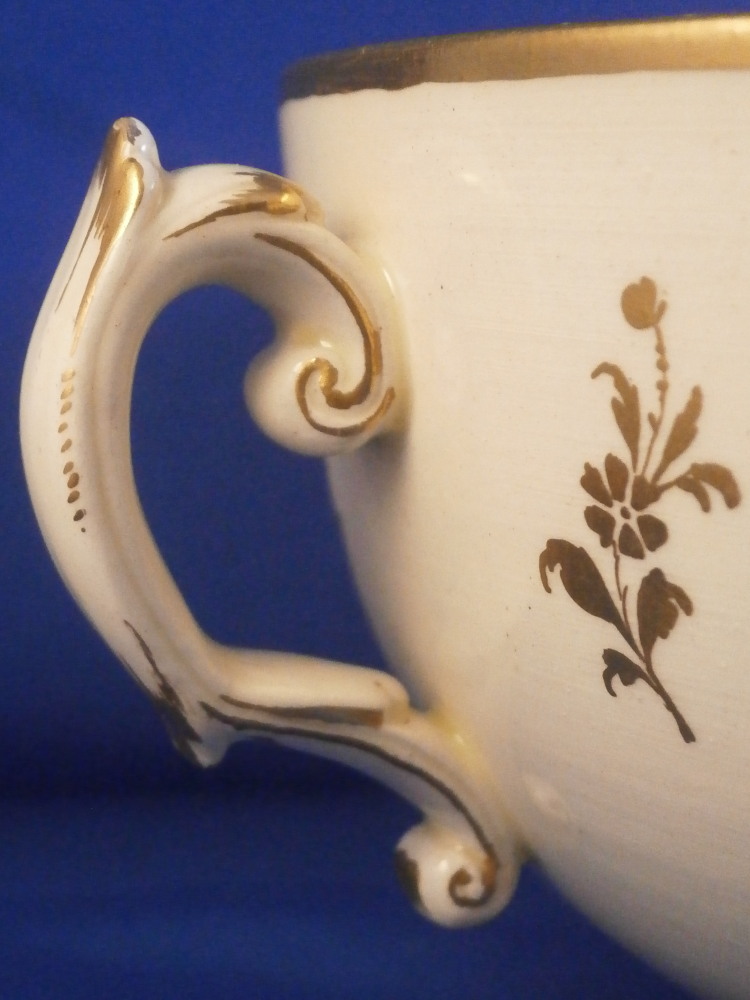 This is a really nice lidded ecuelle / large soup cup / small terrine / tureen made of creamware by an unknown maker in the 18th century. A terrific piece for sure! The main body has a nicely shaped handle to each side with some gilt highlights to them and gold trim to the top and bottom edges. The best part however is the decoration! One side has a top notch hand painted polychrome floral arrangement to it while the other side has a top notch hand painted scene to it including a lady in a landscape surrounding, Some gold twigs and flowers next to the handles. The lid has the same type of decoration with another flower arrangement as well as a scene including a shepherdess and a shepherd with their sheep in a landscape surrounding. Pine cone finial highlighted with gilding and gold trim to the edge. The scenes are the nicest I have ever come across on creamware. Wish I knew the maker but no idea. Definitely not English. The lady wearing that hat on the main body reminds me of Dutch decorated pieces but I don't think that is it either. Maybe someone out there has an idea. The scenes reval some of the best on Eruopean porcelain that is for sure. The entire piece is about 6.25 inches tall (including the finial) and 6 inches in diameter. The handles stick out a bit from the main body. The set is in superb condition with the finial having been broken off and restored back on. Invisible unless you really look for it. There is a small chip to the edge of the foot as shown from two different angles. As nice a creamware piece as they come! There is an incised mark to the underside but I cannot make anything out. Maybe a number 6 or letter G. No clue. Any help would certainly be appreciated! Please email me for more information or other pictures.