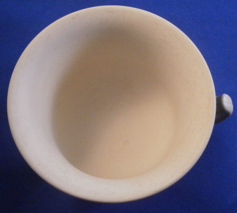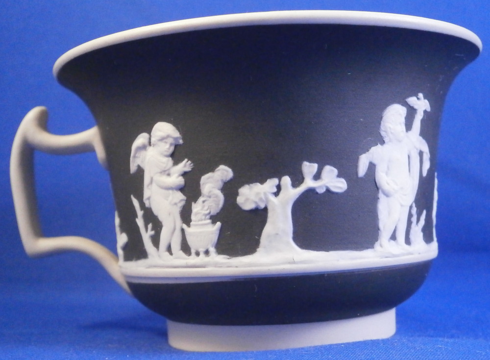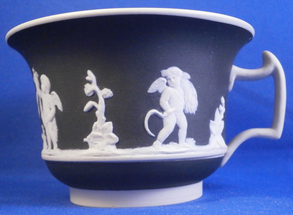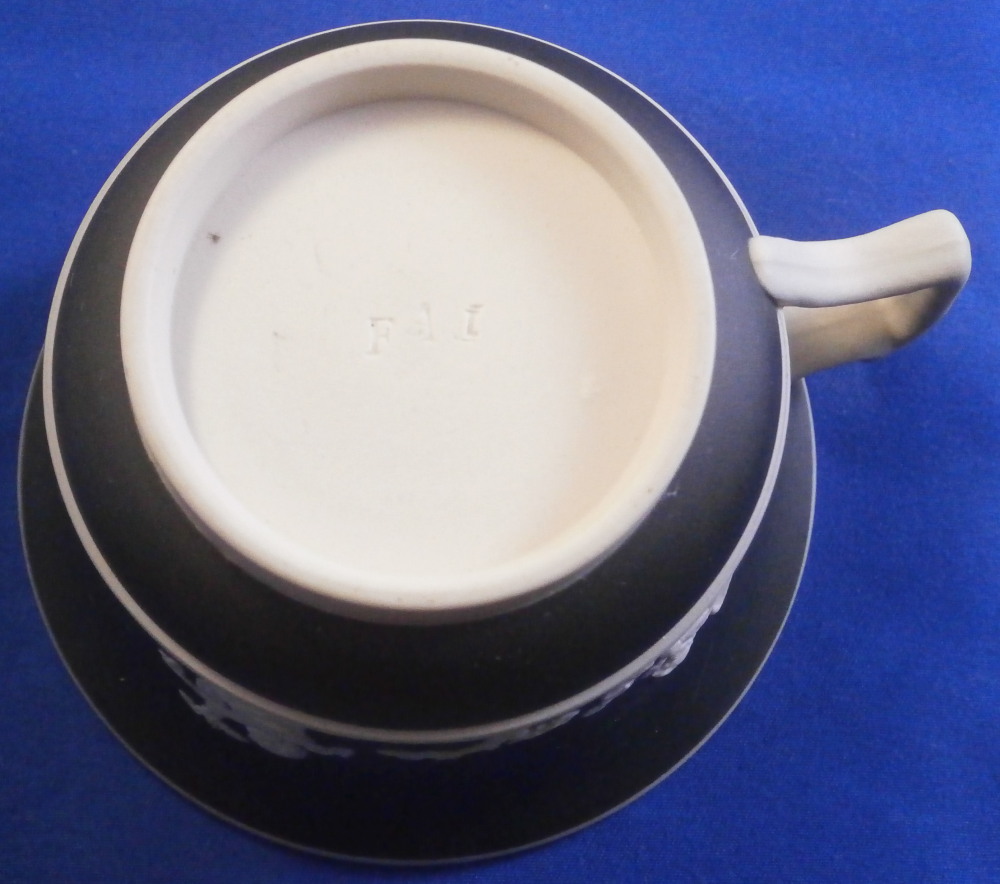This is an interesting cup and saucer made at the Sarreguemines - Utzschneider factory in France in the 1820s. It was made to imitate the more famous Wedgwood black Jasperware and is decorated with the four seasons in white relief on black ground all around the cup. The saucer has a white relief design on black ground around the well. There is a thin raised ring around the well that almost acts like a trembleuse for the cup. Really a nice looking set and it even has the handle shape typical of English piece called London shape around this time period.The set is in great condition with a few minor manufacturing flaws but as ice as they come. No chips, repairs, etc. The cup is just over 2.25 inches tall and 3.5 inches in diameter. The saucer is 1.125 inches tall with a diameter of 6 inches. So a nice sized cup and saucer set. The set is marked underneath with an impressed F A 1 as shown. Please email me for more information or other pictures.