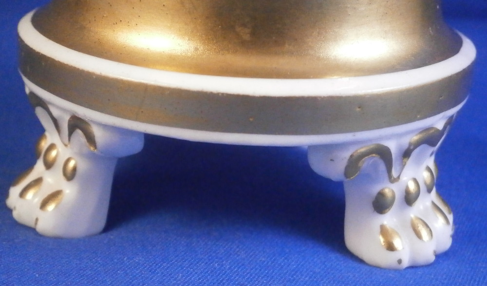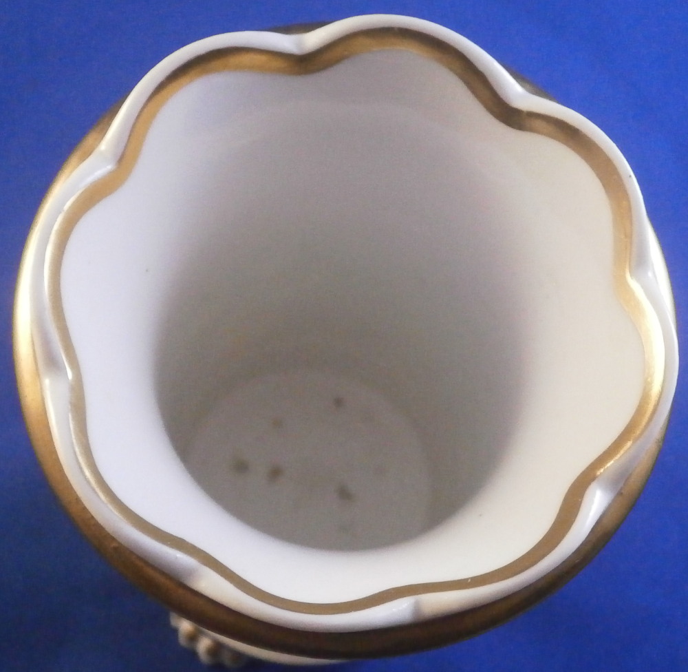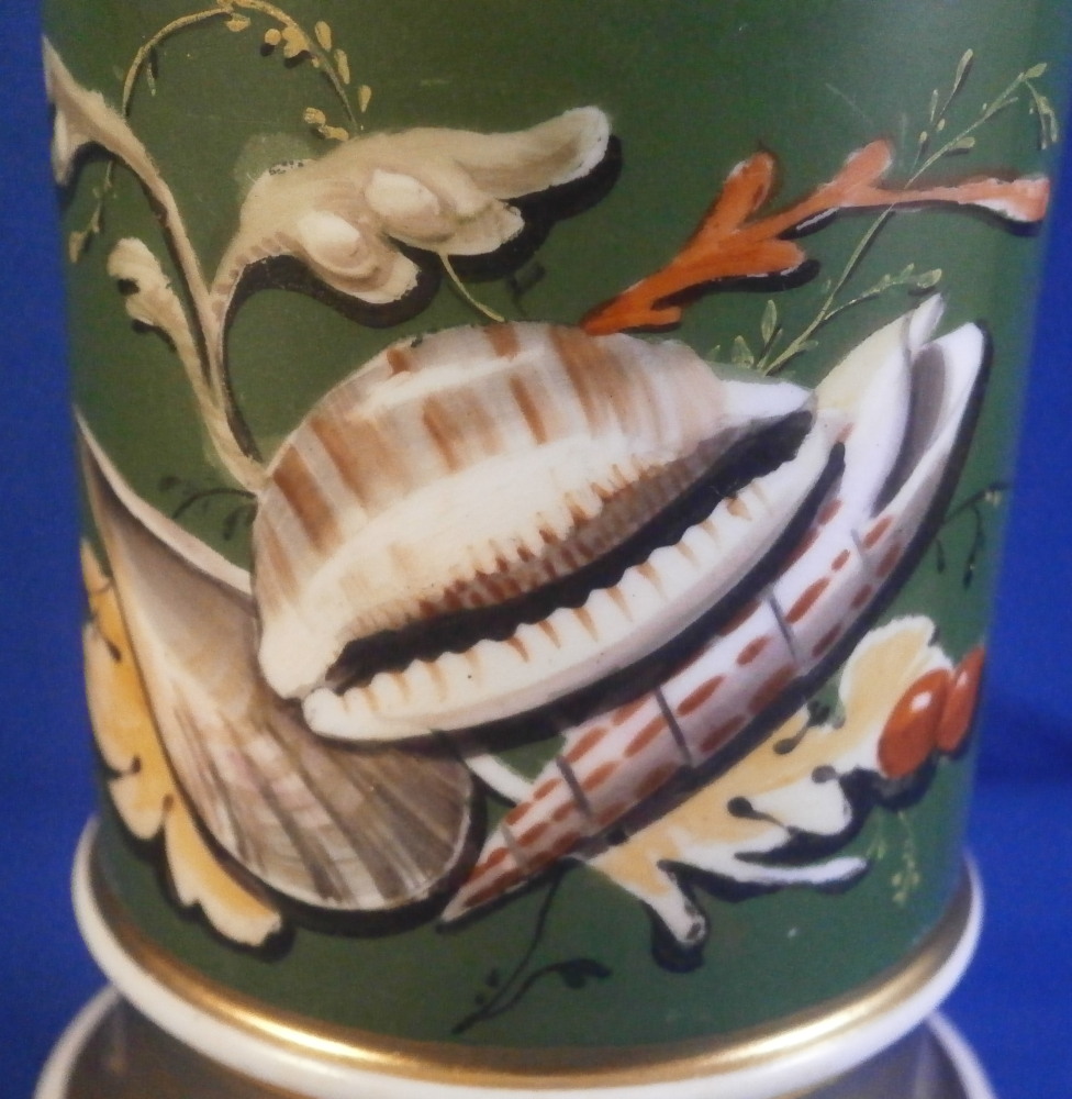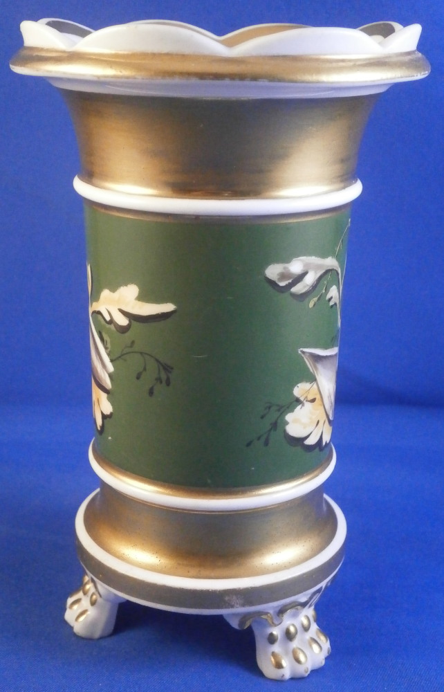This is a really fun spill vase made in England around the early 19th century. I am unsure as to an exact maker as I could not find this exact shape anywhere but it is definitely English from this period. A spill vase / holder is a small traditional or wall-hanging vase for containing small pieces of wood for transferring fire to use to light a candle or pipe from a lit fire. This example here is probably from the Staffordshire region. It has a nice shape to it with a wonderful top rim and is sitting on three claw feet. The center is a bit unusual as it is hand painted with a sea shell design including seashells as well as seaweed all on an olive green ground color. Lots of gilding throughout! A really nice example and this is the smaller one with another matching larger one up for sale as well on the site. The piece is in great condition with two or three tiny scratches and manufacturing flaws in terms of tiny black firing spots as well as some inclusions to the paste to the bottom inside. A touch of gold wear to the top very outer rim edge and some very hard to spot light crazing to the top underside rim. Displays perfectly and looks amazing! The piece is not marked which is fairly normal on English wares from this period! It is 5.125 inches tall with a top diameter of 3.125 inches. Please email me for more information or other pictures.