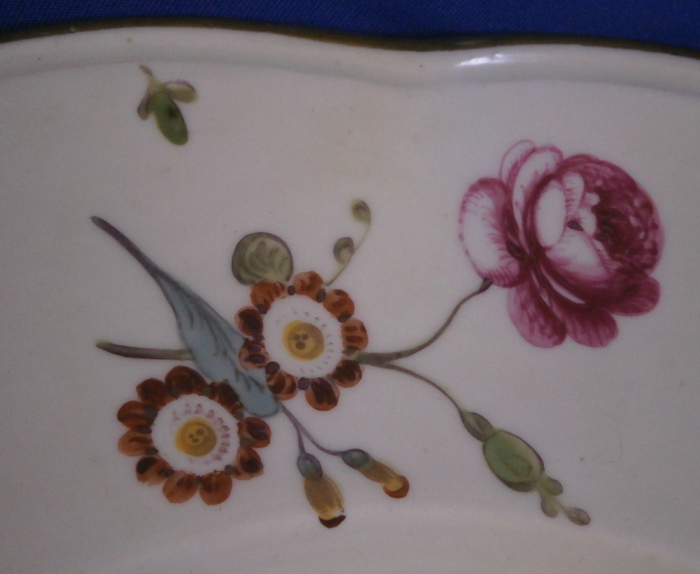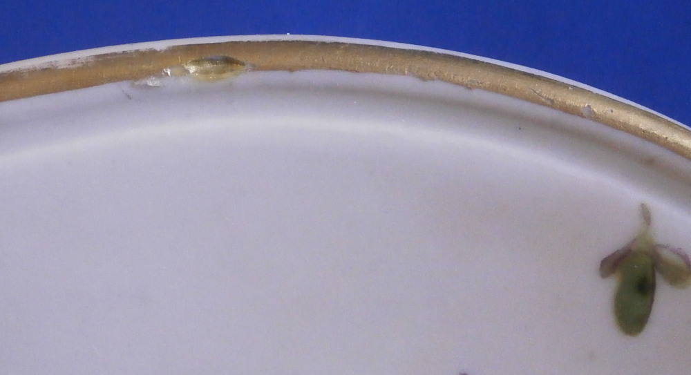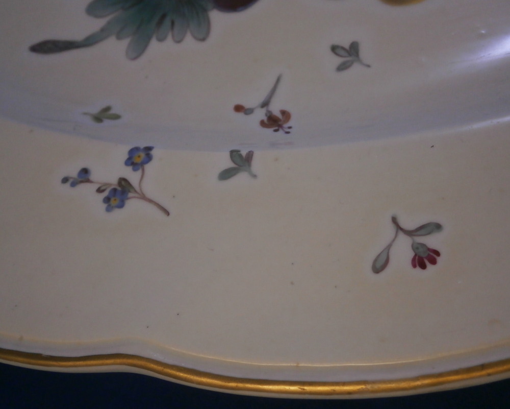 This is a nice oval platter / serving dish made by Frankenthal in the 18th century. It is hand painted with a large scene in the center of two different color bunches of grapes including some leaves. There are two floral arrangements along the rim and a whole lot of small single flowers scattered throughout the dish. The edge has a bit of a relief design to the paste and a gold trim. Its a nice piece and not something you find too often at all. I ahve not come across one with grapes as the central design before! The plate is marked with the CT mark under the crown in under glaze blue with a number 7 below it as well as some incised marks as shown. The platter is 1.75 inches tall, about 14 inches wide and 10.25 inches deep. The piece is in great condition with a few minor manufacturing flaws common to these early wares. There is a small chip or flaw near the edge that was gilded in to hide it better. Quite minor. The glaze is off white in areas throughout the dish but the areas around some flowers is lighter in color. Not sure why but it has not been restored. It displays perfectly and looks amazing. Would look great in a tuscan style kitchen! Please email me for more information or other pictures.