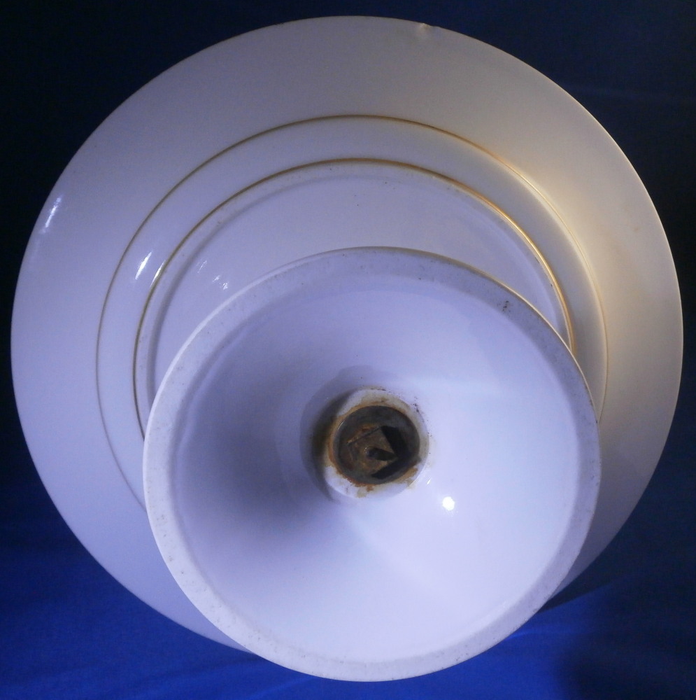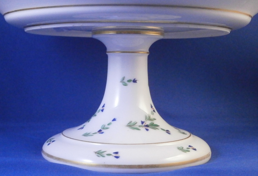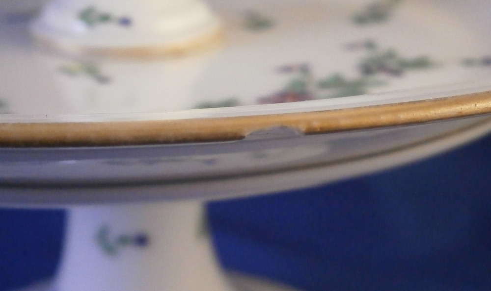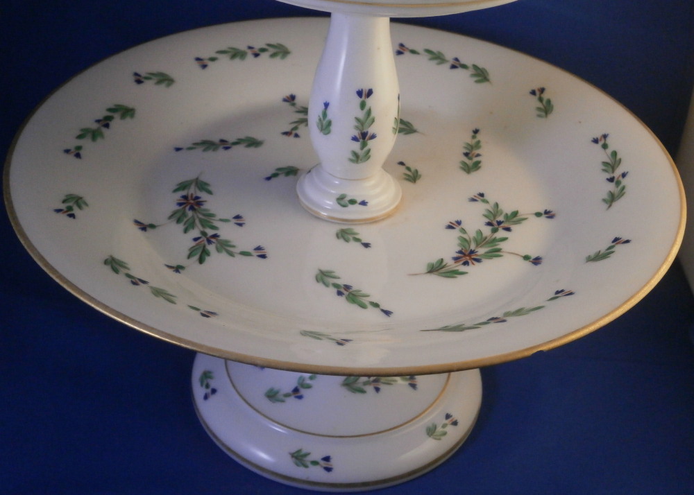 This is a really neat three tired serving dish / tazza made in France in the late 18th or early 19th century. Blue cornflowers were a favorite of Marie Antoinette and thus became very popular during this time period. The paste of this piece is really nice and white quite typical of French makers of the Paris region during this period . Definitely one of the better makers but without a mark I cannot attribute it to any one specific maker! I have never come across a serving dish with this decoration before so it was a must have! It consists of three plates each getting bigger as you go down with little columns in between, a nice base and a handle to the top. Gold trim to the edges and the handle. Each piece except the handle is hand painted with some blue corn flowers scattered all around. The dish is great condition with a touch of wear to the gilding which one would expect after 200 plus years and a chip to the udnerside edge of the largest plate as shown from both the udnerside and the side view. The piece is not marked underneath but is definitely French from this period! It is about 14.5 inches tall with the top plate having a diameter of 5.25 inches, the middle one of 6.5 inches and the bottom one of 9.25 inches. The piece is held together by a metal rod from the bottom that screws into the handle. Please email me for more information or other pictures.
