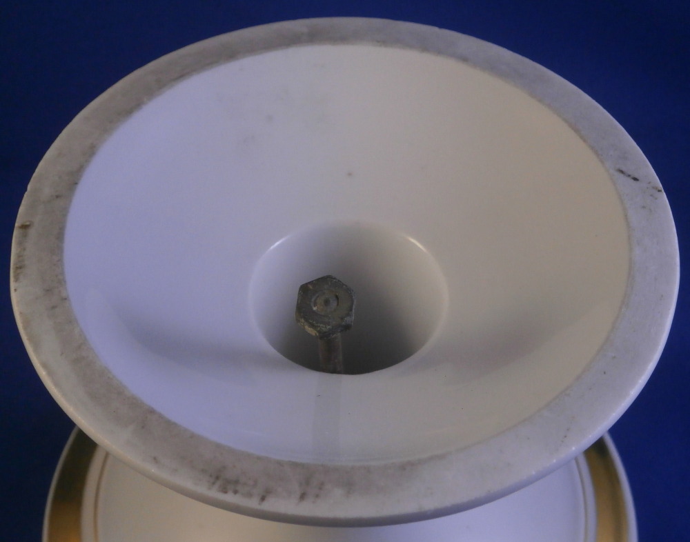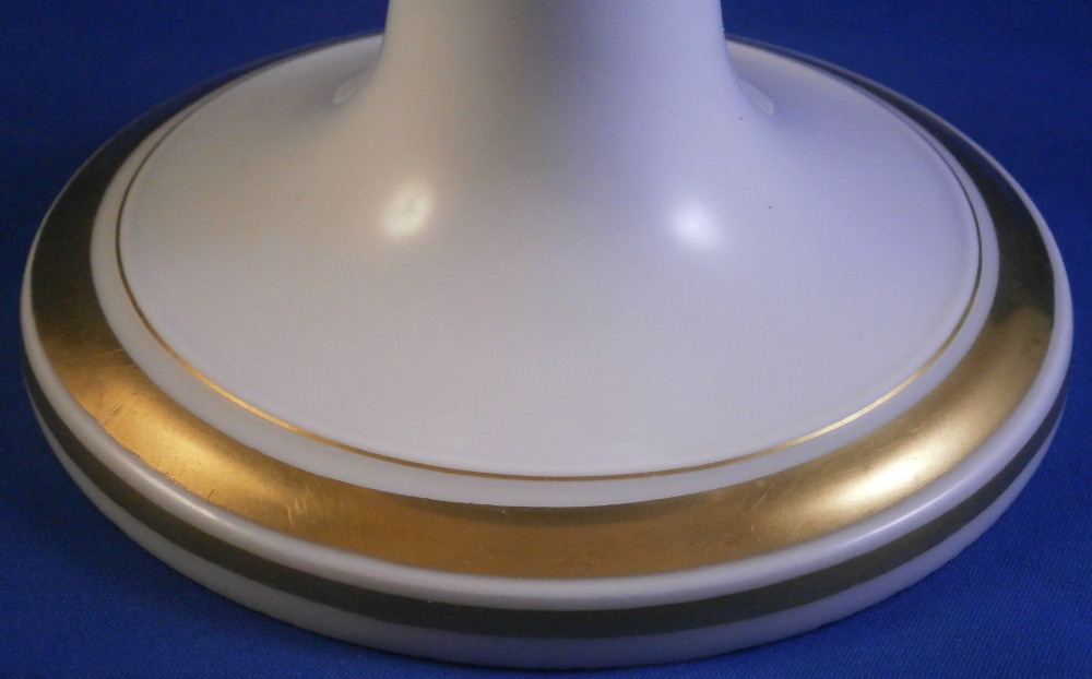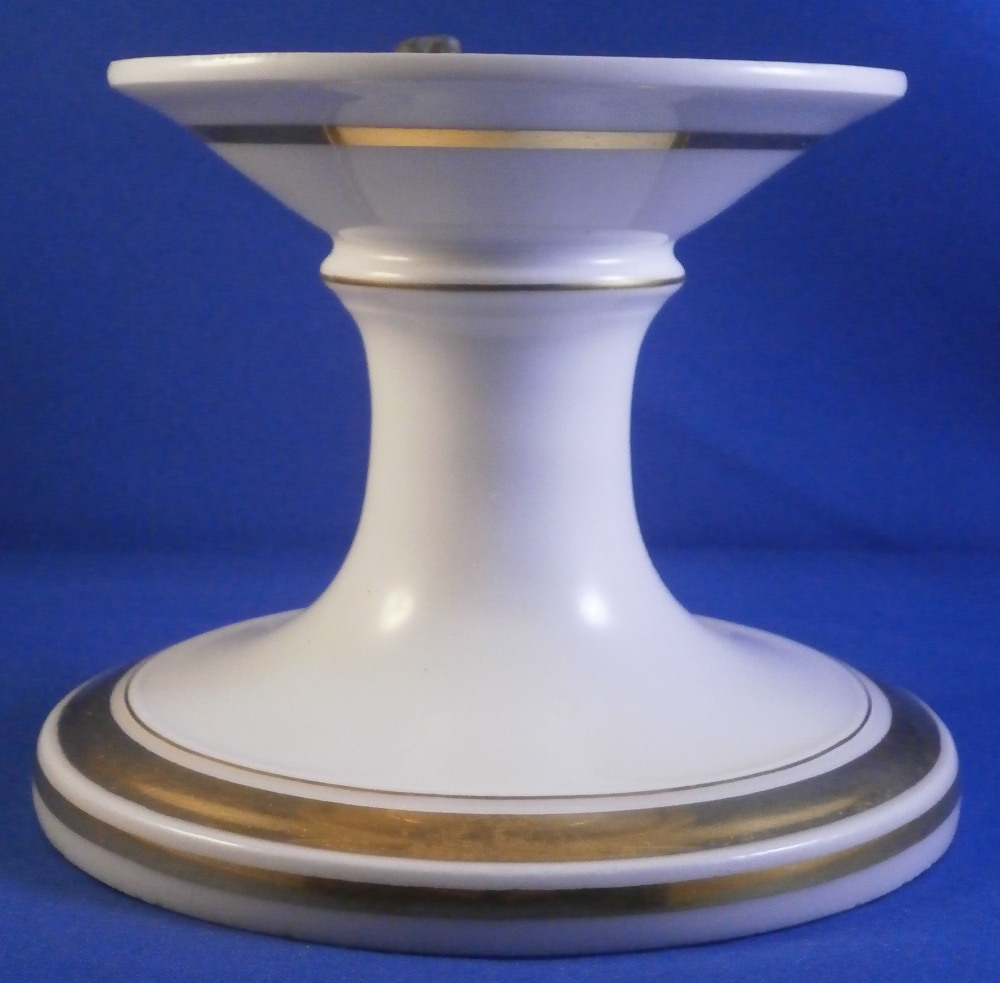 This is a pedestal base made in France in the mid 19th century. It has a simple shape to it with some nice gold highlights. Could be used for a reticulated basket, a plate, or possibly even a vase. The piece is 3.875 inches tall and 5 inches in diameter at the bottom. The top outer diameter is a tiny bit over 4 inches. Unmarked but definitely French from this period. It does come with the old metal hardware to hold the new plate or basket in place. That is a bit rusted. The porcelain is in great condition and the gilding is great. Some minor age related marks but no damage or obvious wear spots. I have a second piece if anyone is interested in a hard to find pair. Please email me for more information or other pictures.