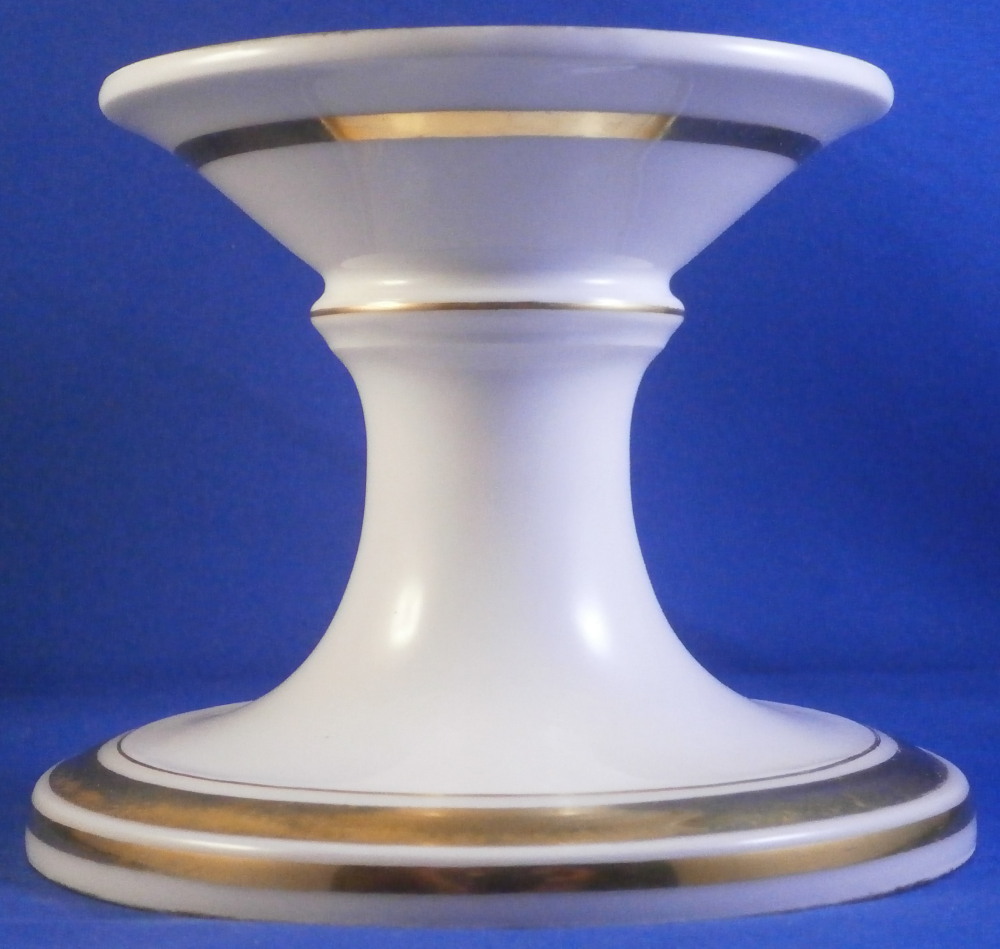 This is a pedestal base made in France in the mid 19th century. It has a simple shape to it with some nice gold highlights. Could be used for a reticulated basket, a plate, or possibly even a vase. The piece is 3.875 inches tall and 5 inches in diameter at the bottom. The top outer diameter is a tiny bit over 4 inches. Unmarked except for an incised 2 but definitely French from this period. It does come with the old metal hardware to hold the new plate or basket in place. That is a bit rusted. The porcelain is in great condition and the gilding is great. Some minor age related marks but no damage or obvious wear spots. I have a second piece if anyone is interested in a hard to find pair. Please email me for more information or other pictures.