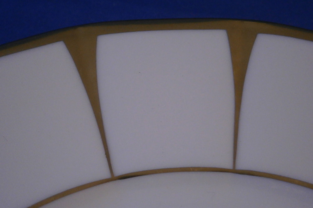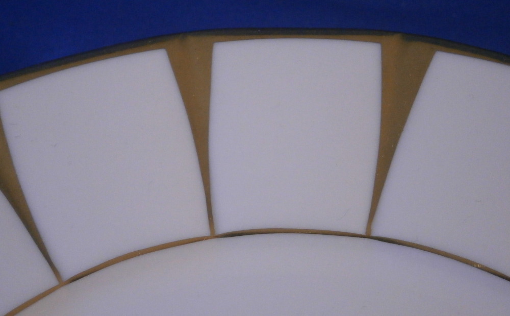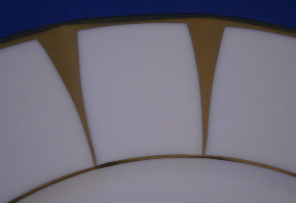 This is a set of six dessert plates made by Fuerstenberg around 1970 I believe. This is probably their most popular modern service these days but it is based in a Biedermeier service created in the mid 19th century. Nice design that is just white and gold. Very elegant. Each plate has a gold trim to the edge and another gold trim around the well. Between these there are thin triangular shapes jutting from the edge where they are wider to the inner gold trim where they are thin. Looks great and is one of those timeless designs. Each piece is marked with the underglaze blue F mark underneath as shown. They also all have Seit 1747 (since 1747) and some red letters and numbers as shown. Each in great condition and about 0.875 inches tall and 7.5 inches in diameter. Please email me for more information or photos.
