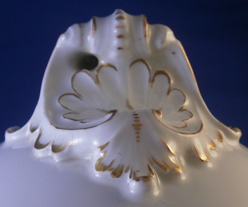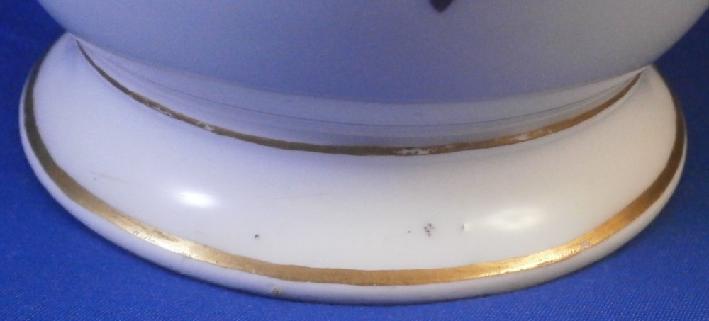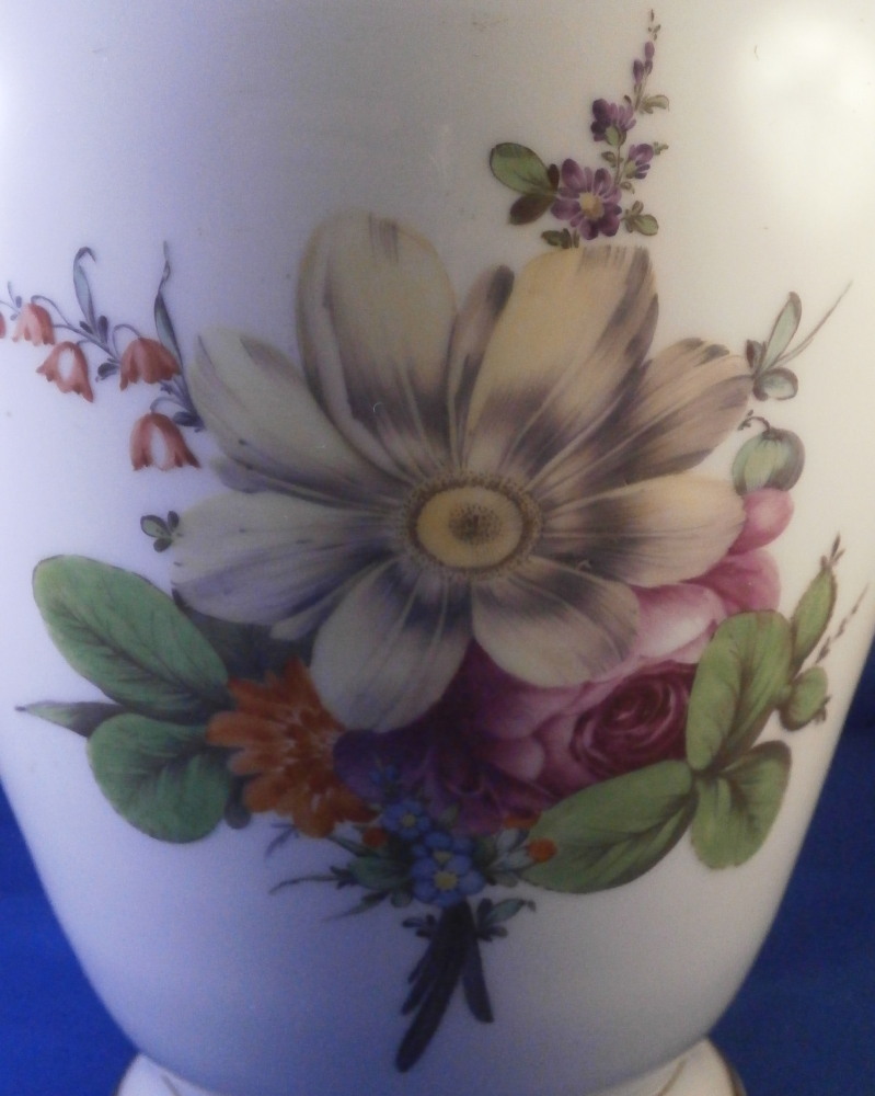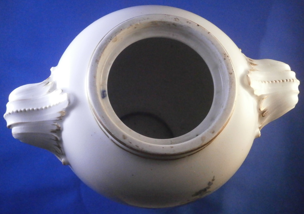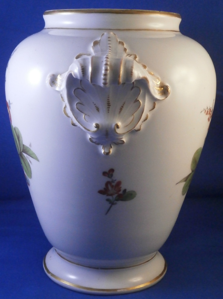 This is a very nice vase made by Furstenberg in the 18th century. It is hand painted with a superb large floral arrangement on the front and back with a small single flower on each side below the handles. Nicely shaped handles highlighted with gilding as well as some gold trim to the top and bottom. The piece is lacking the lid which would have been dome shaped. I have a yellow ground larger version of this piece if you want to see the shape of it.The piece is in great condition with a few minor use marks but no chips, restorations, etc. It is 7.75 inches tall, about 8.5 inches wide and about 6 inches in diameter. I think this is the smallest version for this shape. Vases were the most important product of Fuerstenberg during this period and this piece shows us why - quite stunning! It is marked with the under glaze blue F mark on the inside top rim of the main body and impressed No.1 underneath as shown. The underside handles each have an air hole for the firing process as shown. Please email me for more information or photos.