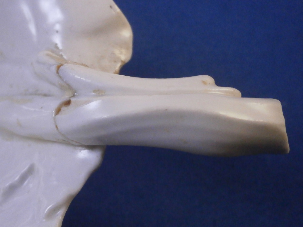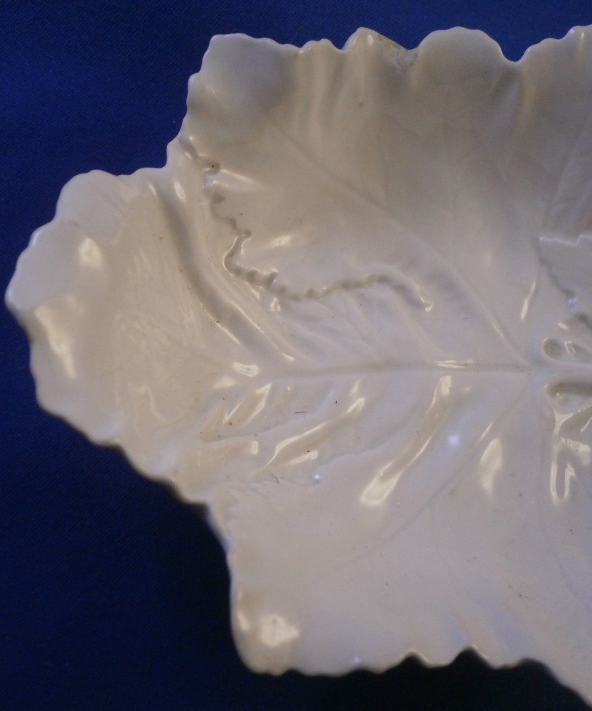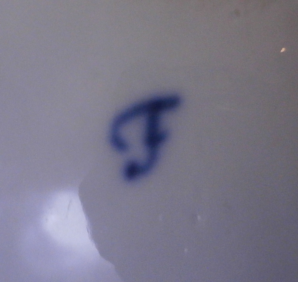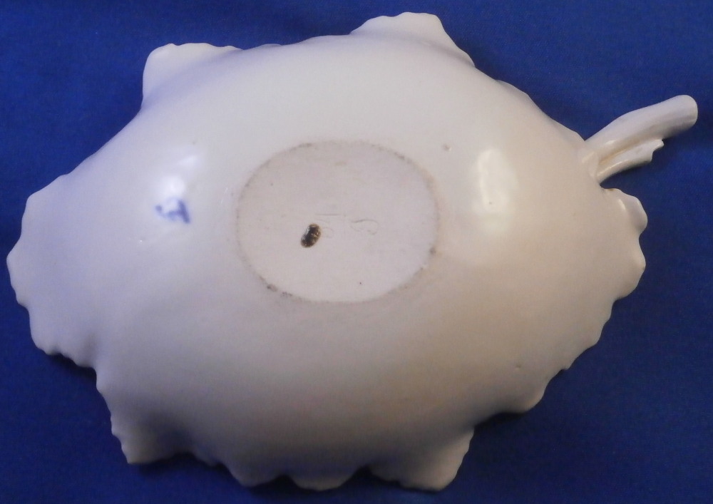 This is a very early leaf dish made by Furstenberg during the very beginning of their existence pre 1760. It has a nice deep shape and has lots of molded details to it. There is a smaller leaf towards the terminal that overlaps the larger leaf. In pretty decent condition considering the fragile nature and age. Could not find anything like it in my books or online. There is a flat chip to the edge as shown that does not affect the shape and the branch handle has been broken off and reglued. Nothing missing so an easy fix for a decent restorer. The dish is marked udnerneath with the under glaze blue script F mark as shown as well as the number 54 over an incised script F mark which I have never seen before. Definitely an unusual and early piece! It is about 1.375 inches tall (at the handle), 5.375 inches from handle end to tip of leaf and 3.635 inches deep. Please email me for more information or photos.