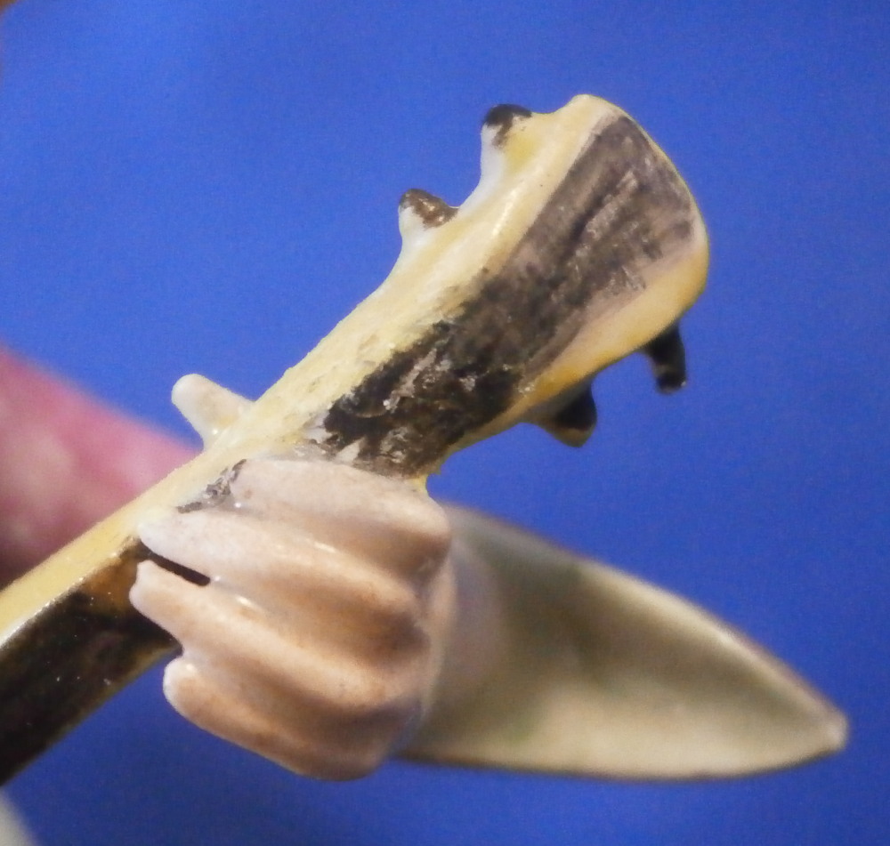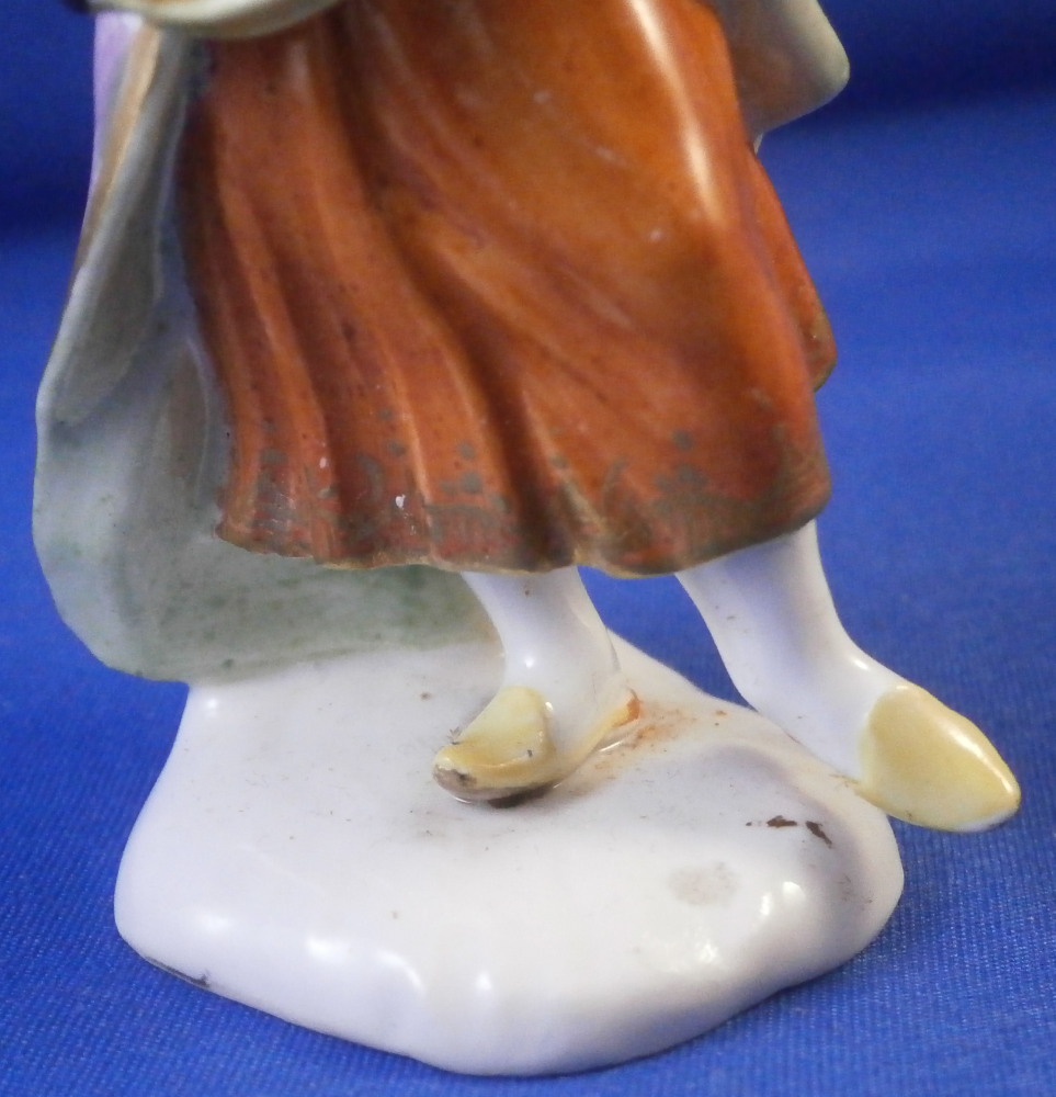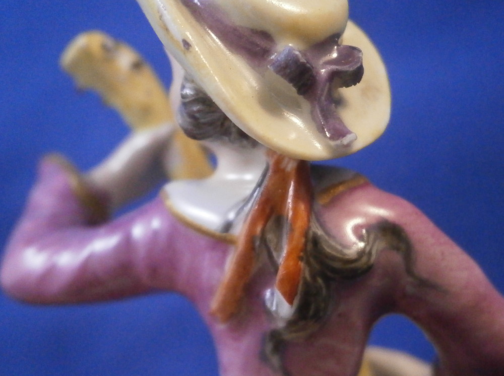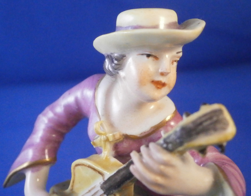This is a cute little figurine of a lady playing the guitar made by Fuerstenberg around 1765. I could not find this model but did find a male violin player of the same size that was modeled by Anton Carl Luplau so I assume there is probably a whole set of these out there though rare for sure. The lady is nicely modeled with an orange skirt with nice gilding along the bottom edge, a pink long robe covering most of the rest of her. She is wearing a nice hat with a bow to it, has a yellow bow to the front and back and off course is holding the guitar. Typical early base. The figure is marked to the back of the base with the under glaze blue script F mark used from 1760 until 1770. The figure is superbly hand painted and is in great condition with some minor damage to a string end of the bow on her hat, similar damge to the orangestring in her hair and the end of the guitar has been restored as shown. None of this is obvious and she displays superbly! The figure is 3.5 inches tall, about 2.125 inches wide and 1.5 inches deep. Please email me for more information or photos.