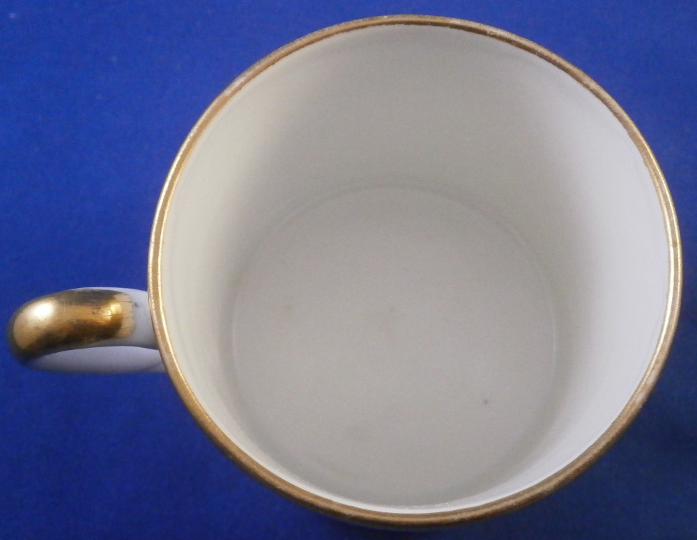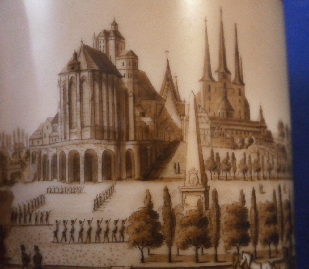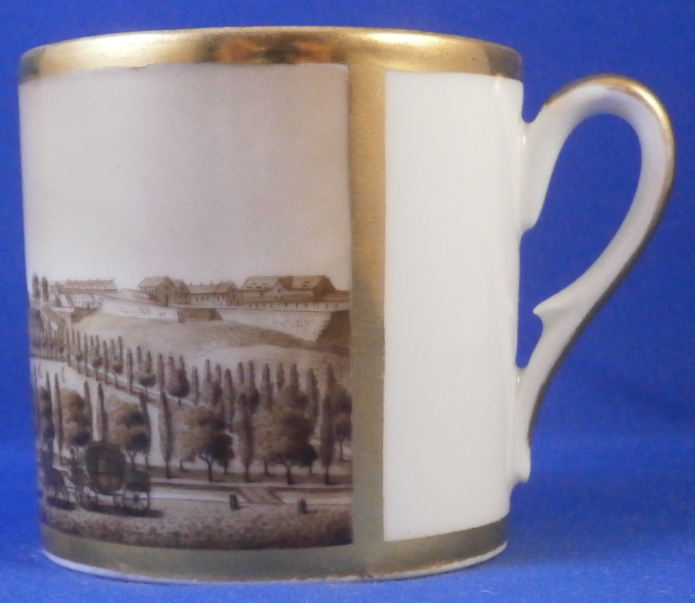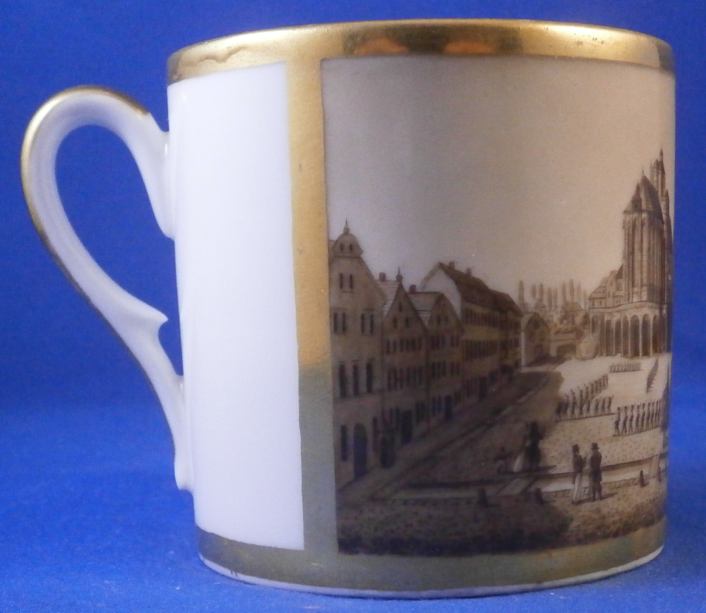 This is a great scenic cup made in Germany in the early 19th century. In terms of the shape of the handle it could also have been made in the Paris region of France. Either way is is hand painted with an amazing scene in sepia colros that covers more than half of the cup of the city of Erfurt ( a city in the Thuringia region of Germany) including the Dom (a type of church). A very detailed high quality scene including the church plus many other buildings plus the space in front with lots of soldiers marching and a superb horse drawn coack riding in the front. The scene is surrounded by a simple gold frame with more gilding to the top and bottom fo the cup as well as the handle. The scene is named in the bottom part of the gold frame with the tooled words - Der Dom in Erfurt. The cup is in excellent condition as shown. No issues other than some super minor age related marks. The peice is not marked except for some sort of impressed mark impossible to make out - as shown. The cup is 2.375 inches tall and 2.375 inches in diameter. Please email me for more information or photos.