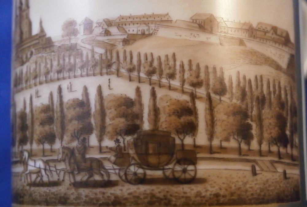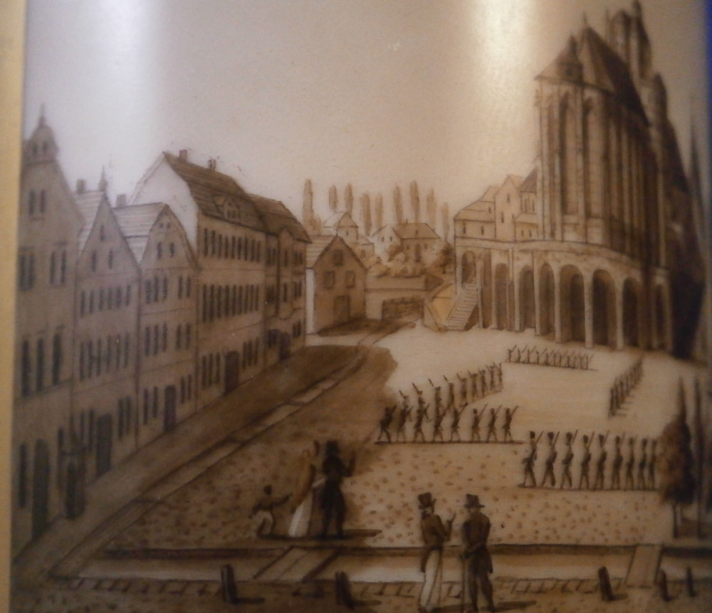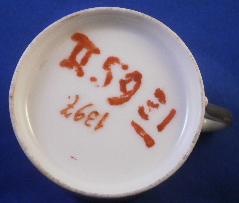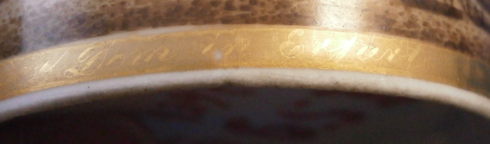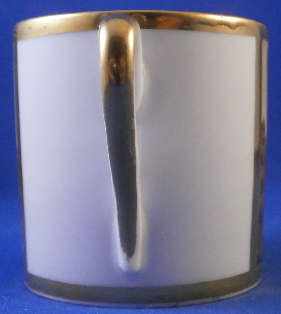 This is a great scenic cup made in Germany in the early 19th century. In terms of the shape of the handle it could also have been made in the Paris region of France. Either way is is hand painted with an amazing scene in sepia colros that covers more than half of the cup of the city of Erfurt ( a city in the Thuringia region of Germany) including the Dom (a type of church). A very detailed high quality scene including the church plus many other buildings plus the space in front with lots of soldiers marching and a superb horse drawn coack riding in the front. The scene is surrounded by a simple gold frame with more gilding to the top and bottom fo the cup as well as the handle. The scene is named in the bottom part of the gold frame with the tooled words - Der Dom in Erfurt. The cup is in excellent condition as shown. No issues other than some super minor age related marks. The peice is not marked except for some sort of impressed mark impossible to make out - as shown. The cup is 2.375 inches tall and 2.375 inches in diameter. Please email me for more information or photos.