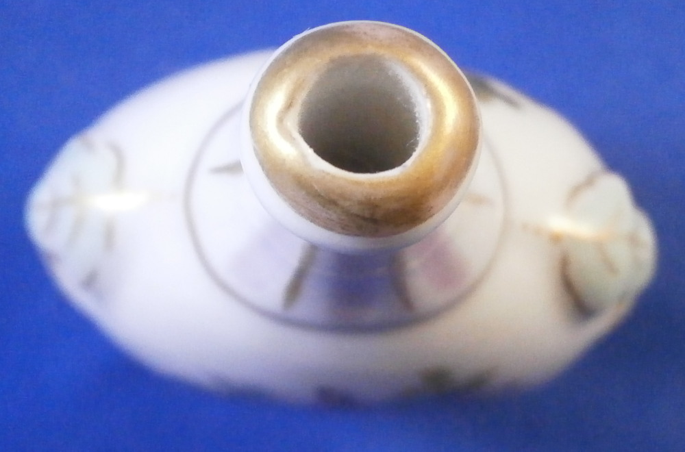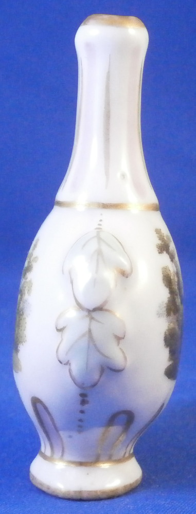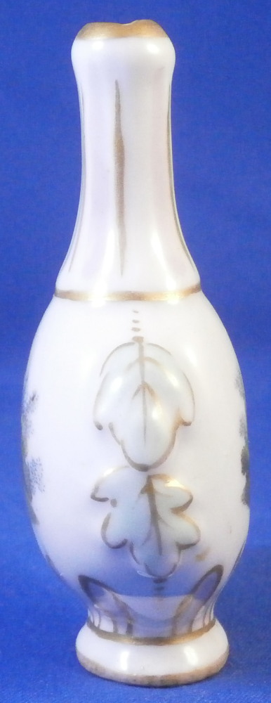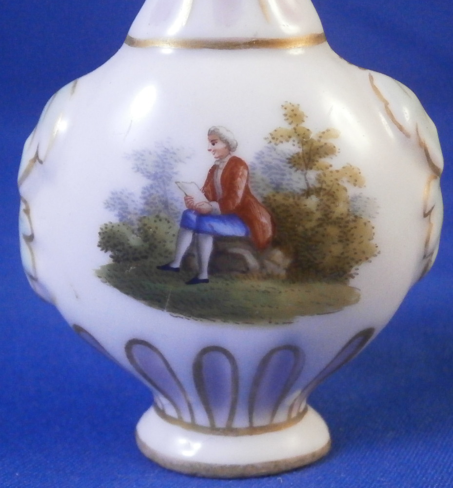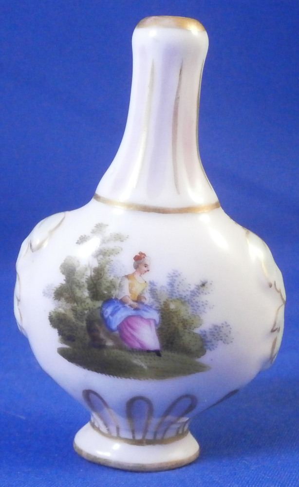 This is a cute miniature scent bottle that could be used as a tiny vase made in Germany in the later 19th century. The piece has a bottle like shape to it with a raised leaf design to either side and a ribbed design to the neck that is hand painted in pink and gold trim. The front and back side have a hand painted scene to them of either a gentleman or a lady in a landscape surrounding. More pink and gold trim on a ribbed design to the bottom part of the flask and a bit of gold trim around the foot. The piece is not marked underneath but definitely German in terms of a maker and from this period. It is 2.75 inches tall, 1.625 inches wide and 1 inch deep. It is in perfect condition but presumably had a stopper at some point. Please email me for more information or photos.