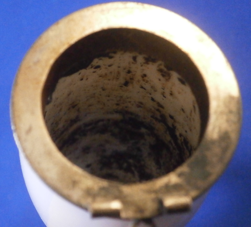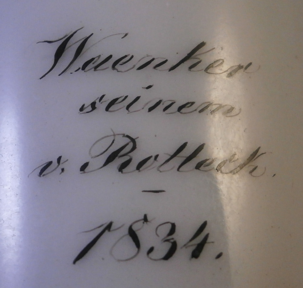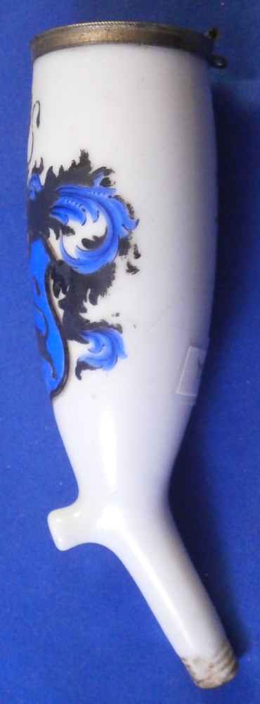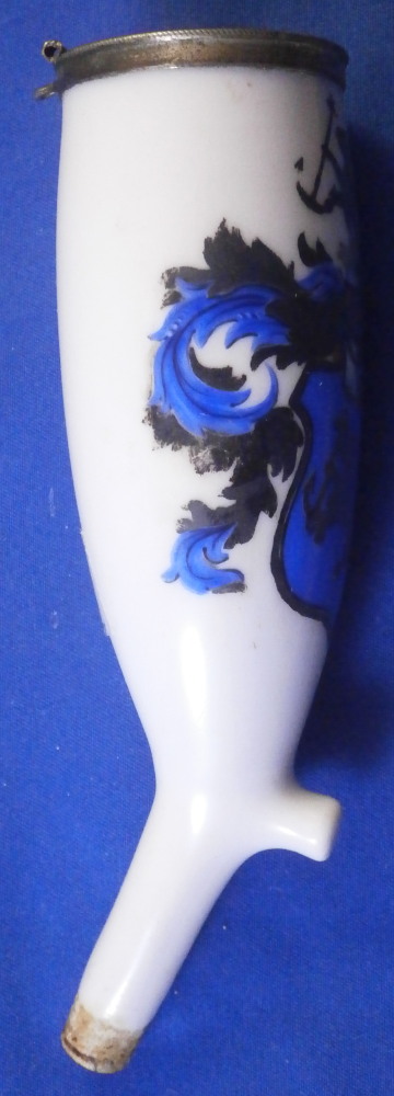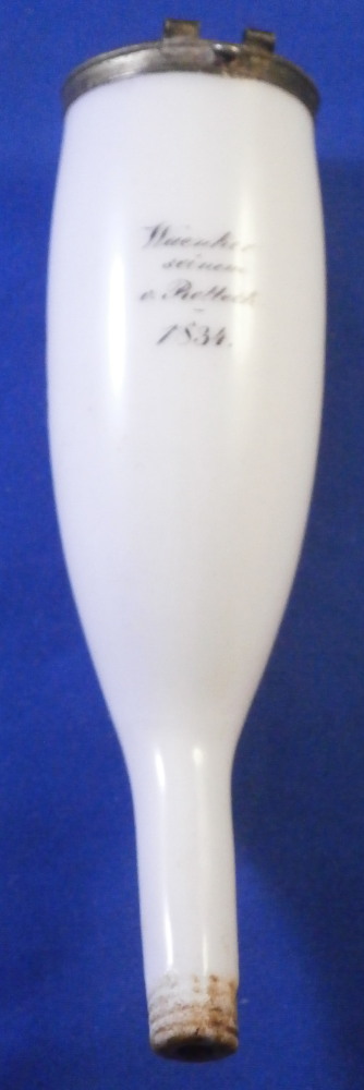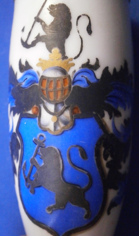 This is a porcelain pipe bowl made in Germany in the 19th century - 1834 to be exact. More than likely made by Nathusius / Althaldensleben and a piece of studentika that was given from one person to another as a gift. It has Waencker seinem v. Rotteck and 1834 written on the back in black script. The front has this amazing hand painted armorial / coat of arms design to it. Probably a family coat of arms of the receiver of the pipe. The design is quite nice in mainly blue and now black which was probably silver at some point that has oxidized. The design has a knight's helmet in the top center with a lion holding an anchor above it with another lion holding an anchor in the shield part of the design. The pipe is in great condition but it was used and is a bit dirty inside and on the bottom stem. It used to have a lid and the mounts are still there but the actual lid is missing as shown. It is 4.75 inches tall and just under 1.375 inches in diameter. It is marked with the impressed number 8 which I believe is a size reference as well as the blue line across the bottom end known to be the mark for Nathusius. Please e-mail me for more information or photos.