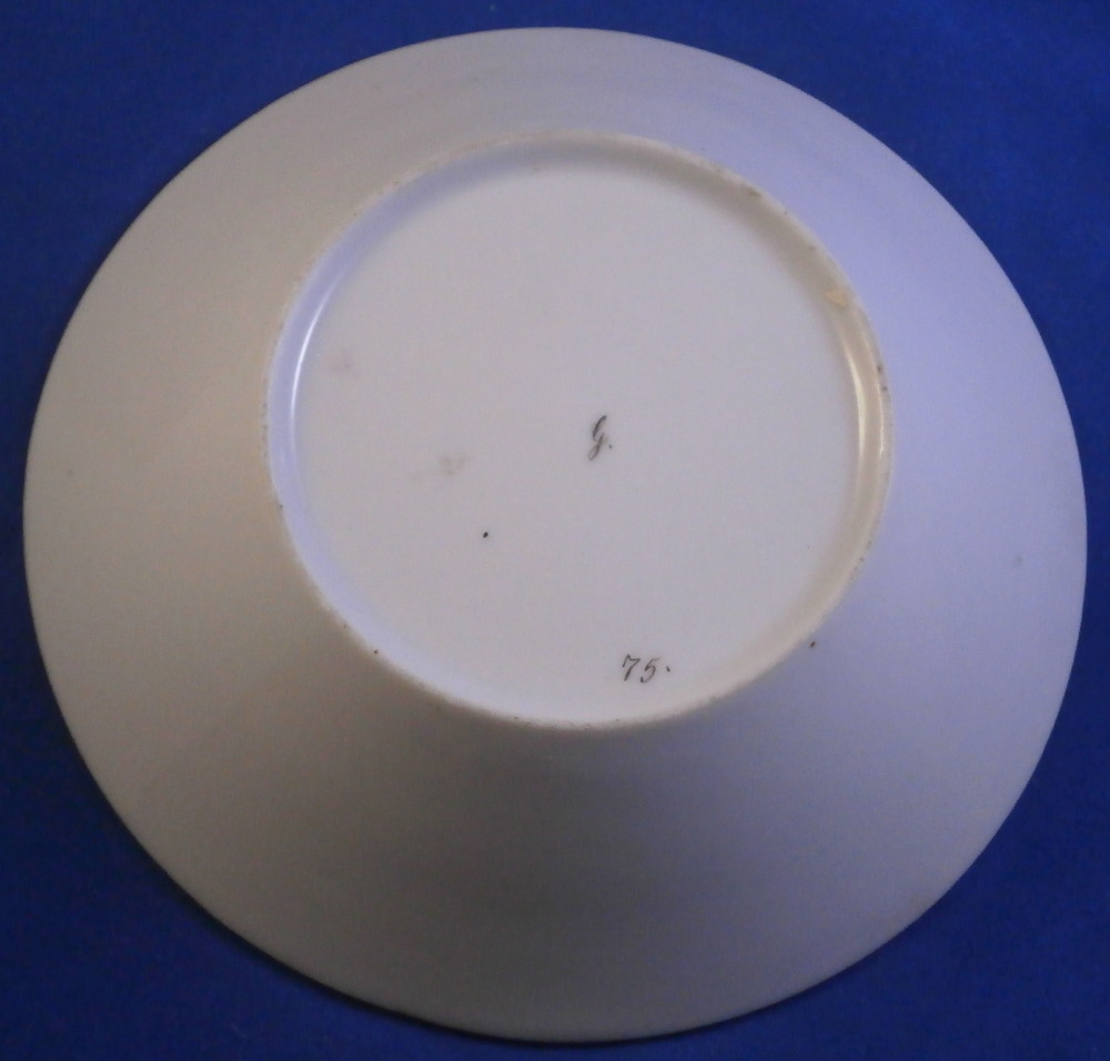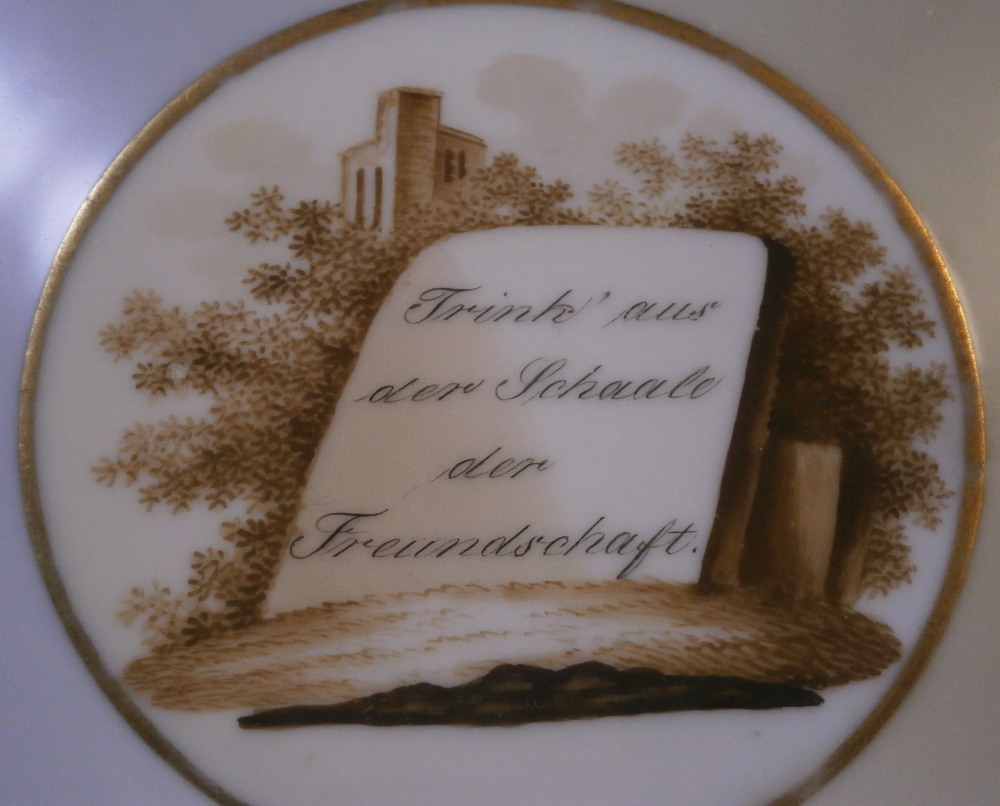 This is a saucer made by Gotha around 1815. It is another superb example of Gotha's work - it is in the classicism style and has a hand painted ruin landscape scene in sepia (brown tones) on the inside of the saucer. It includes a ruin in the background, some bushes and a large stone with the inscription: Trink aus der Schaale der Freundschaft which translates to: Drink from this bowl of friendship. Simple gold trim around the well edge and rim edge. A nice piece with a mark one does not see often. The piece is in great condition with the most minimal of wear. The dish is marked underneath with the over glaze black script G. mark as well as the number 75. as shown. The piece is 5 inches in diameter and 1.125 inches tall. Please email me for more information or photos.