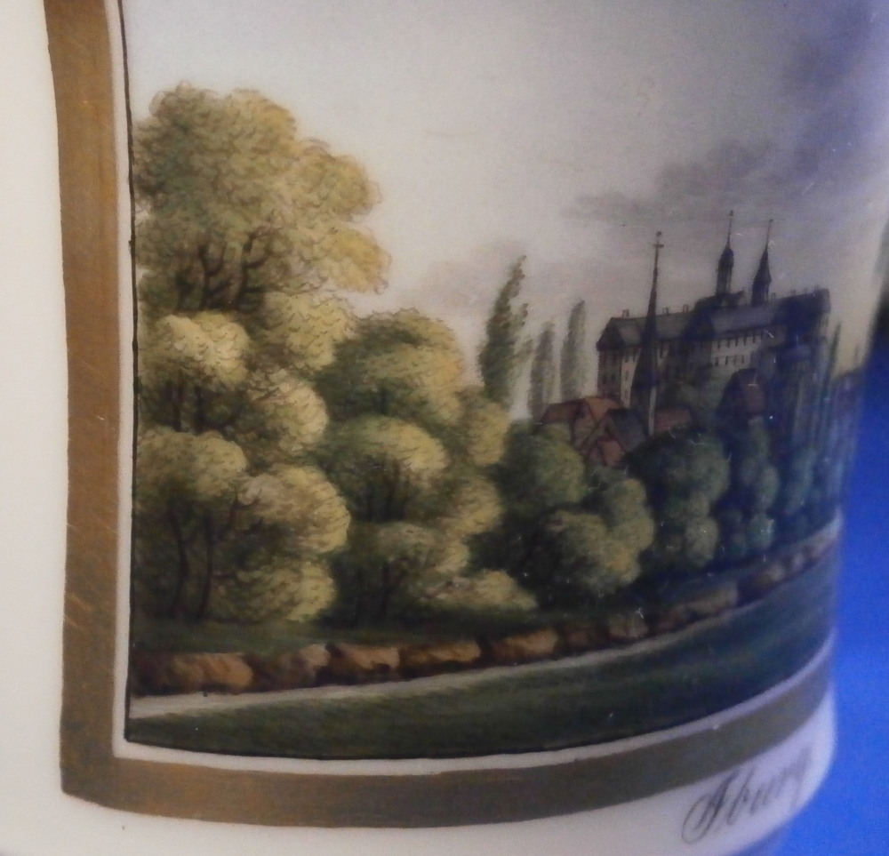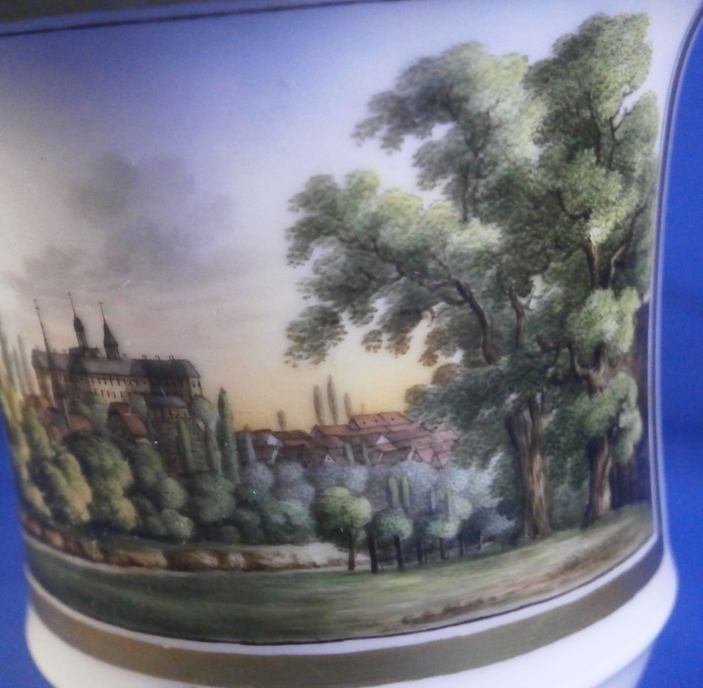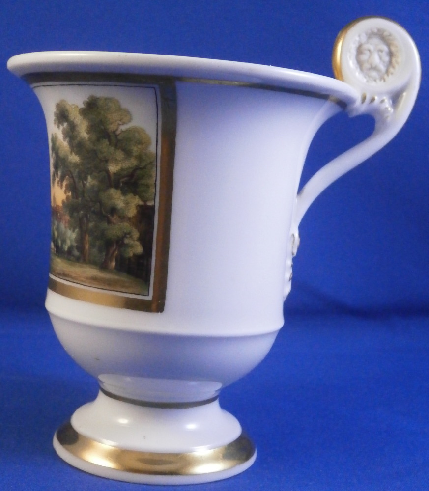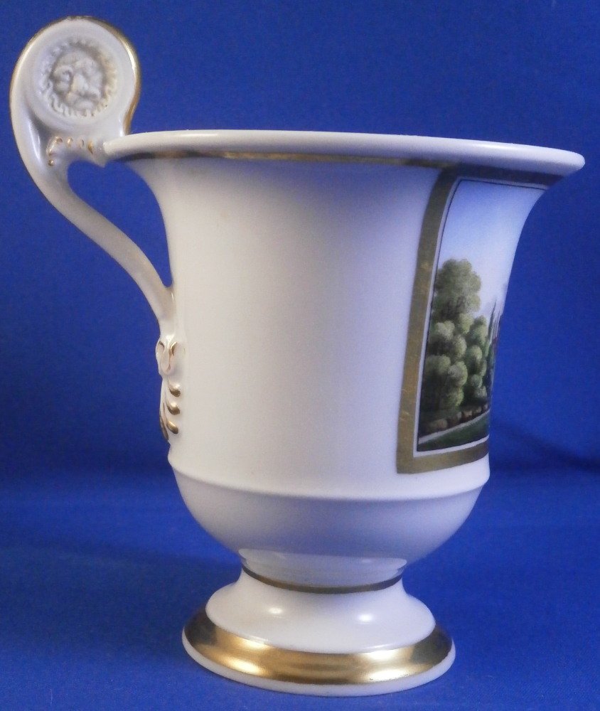 This is a really nice Biedermeier cup made by Gotha in the early 19th century between 1805 and 1834. It is marked with the fairly rare script Gotha mark in black. Gotha is probably the best of the Thuringia makers in terms of quality of the paste and painting. They existed from 1757 until 1937 in one form or another. This cup is superbly hand painted with a topographical scene of the city of Bad Iburg, by Osnabrück in the Lower Saxony state of Germany, with the castle in the center of the scene surrounded by some smaller building and lots of greenery. The scene has a gold frame around it and there is lots more gilding throughout the cup as shown. Nice handle shape with a lion face in the center of the top part as shown. The piece is in great condition with a small chip that is mostly underneath the base as shown and some gold missing in an area of the inside rim of the top. Otherwise in great shape and it displays superbly! The cup is 3.625 inches tall with the handle sticking up another 0.75 inches from there and 3.25 inches in diameter. Please email me for more information or photos.
