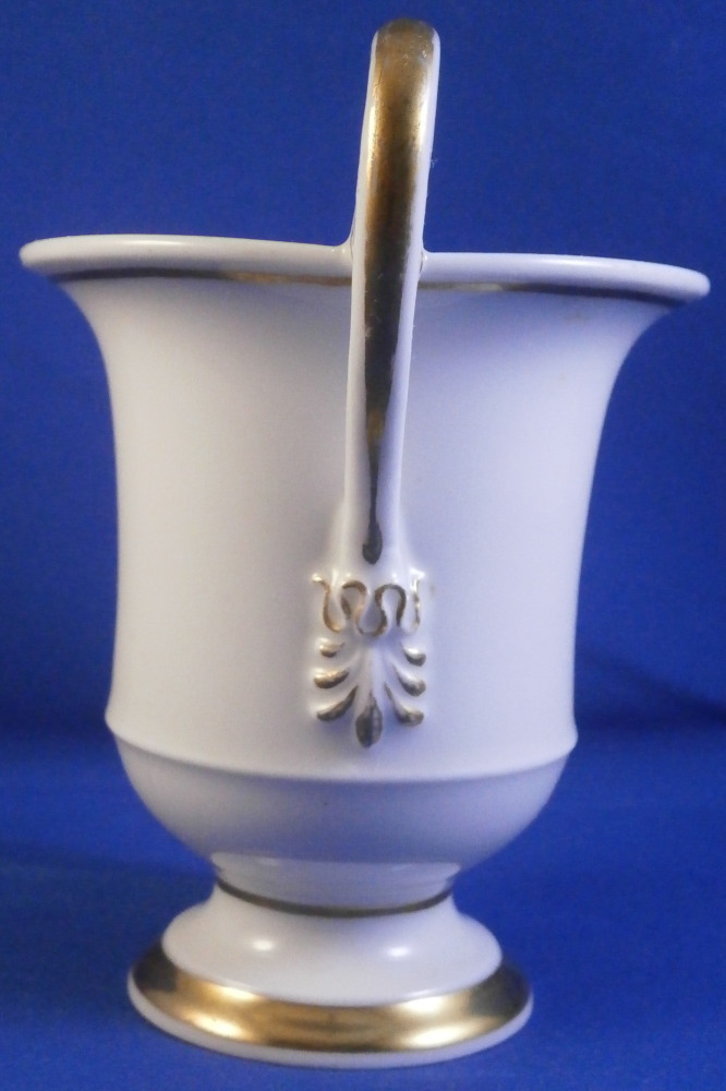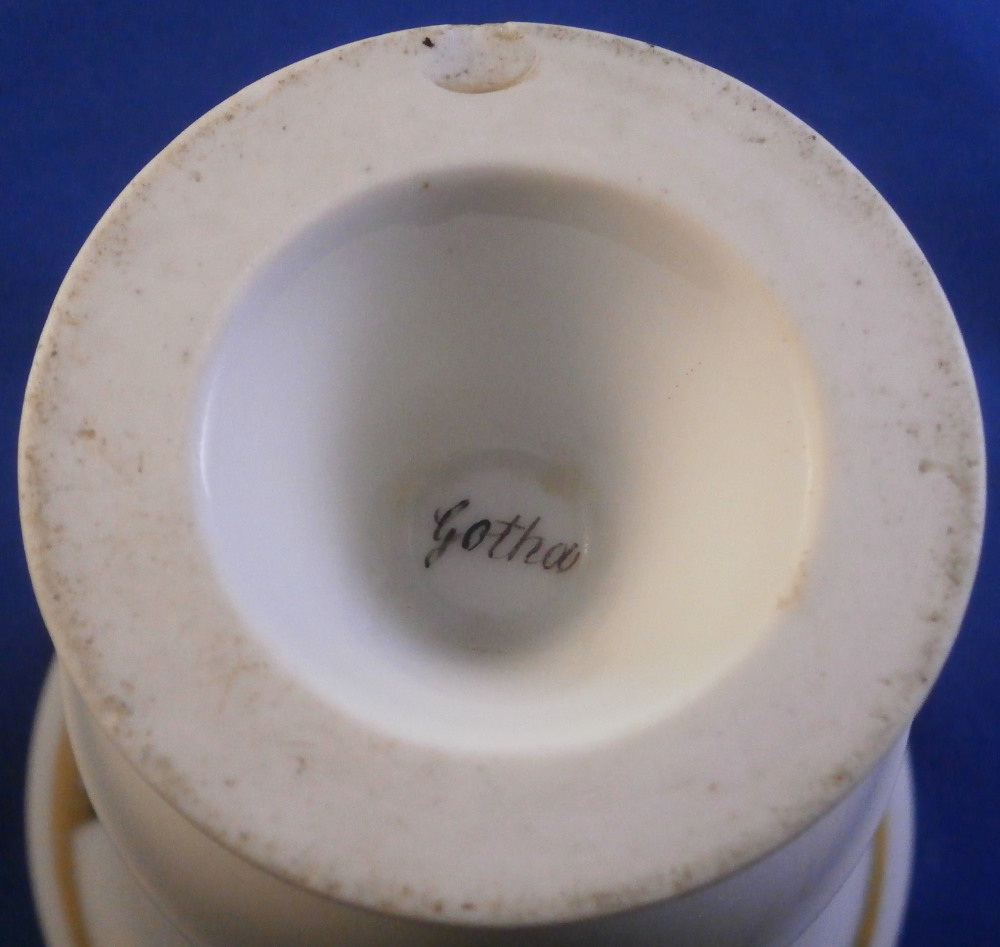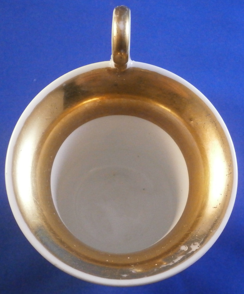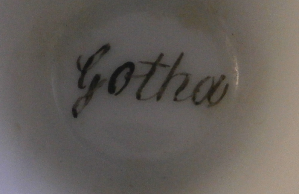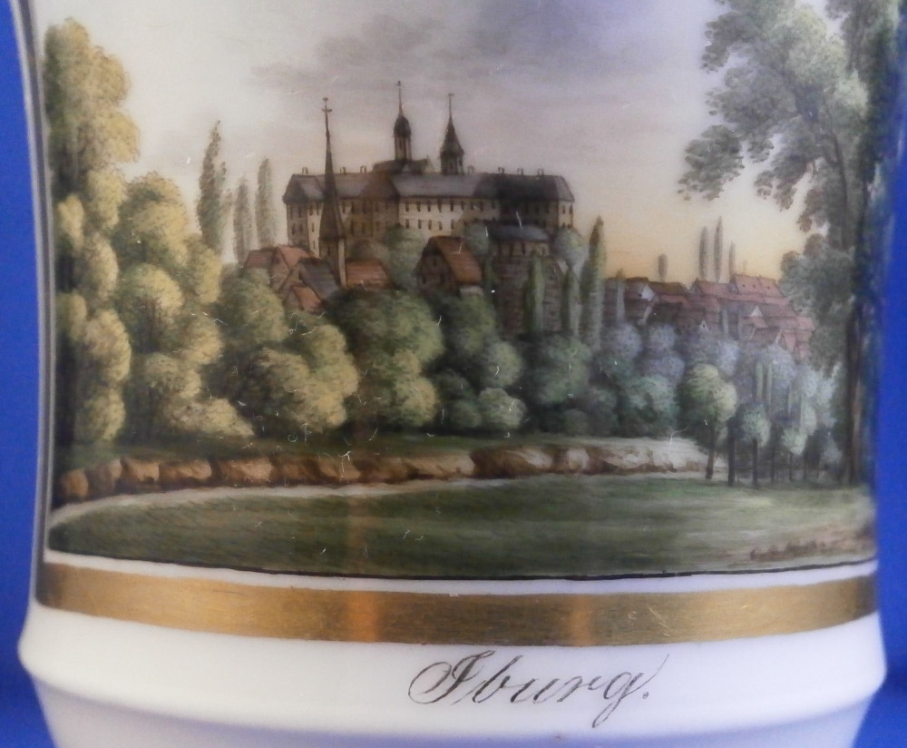 This is a really nice Biedermeier cup made by Gotha in the early 19th century between 1805 and 1834. It is marked with the fairly rare script Gotha mark in black. Gotha is probably the best of the Thuringia makers in terms of quality of the paste and painting. They existed from 1757 until 1937 in one form or another. This cup is superbly hand painted with a topographical scene of the city of Bad Iburg, by Osnabrück in the Lower Saxony state of Germany, with the castle in the center of the scene surrounded by some smaller building and lots of greenery. The scene has a gold frame around it and there is lots more gilding throughout the cup as shown. Nice handle shape with a lion face in the center of the top part as shown. The piece is in great condition with a small chip that is mostly underneath the base as shown and some gold missing in an area of the inside rim of the top. Otherwise in great shape and it displays superbly! The cup is 3.625 inches tall with the handle sticking up another 0.75 inches from there and 3.25 inches in diameter. Please email me for more information or photos.