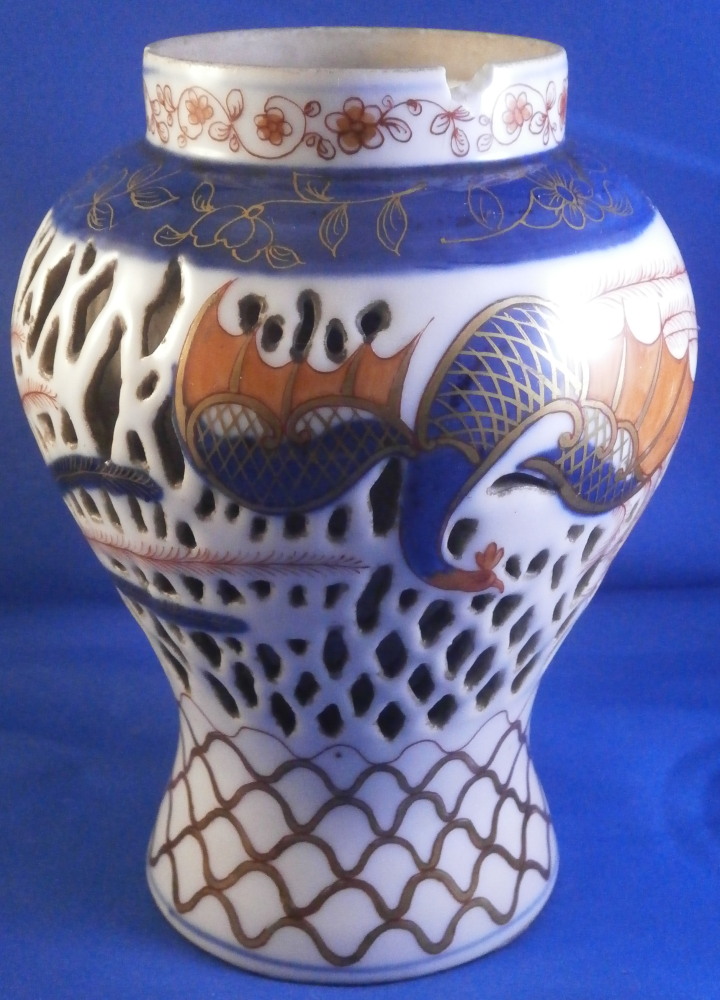 This is a really neat early reticulated vase with its lid made by Herend in the mid 19th century. These early pieces by them are very hard to find - I did find one modern example with a different pattern. I have not seen this pattern before either! The vase is double walled which was probably copied from much earlier Chinese examples. The outside wall is reticulated and the inside wall solid so it can be used properly as a vase. The lid only has an outside reticulated wall with the bottom being solid. Both pieces are hand painted with a red, gold and blue design based on Imari colrs. It is of Phoenix bird or dragonwith long red feathers. Really a great looking design that goes all around. The vase is in good condition with two chips to the top rim of the main body and a couple of minor hairlines/ glaze lines along the top rim. There is one section of the reticulated part that has been factory repaired and a tail feather painted over that. Shows that they still had production issues back then! The underside must have had a flaw as well and it was painted over with liquid porcelain slip and then marked on top of that. Each cut out has the edges very dirty and it could use a careful cleaning. The edges are not glazed and thus the issue of dirt sticking to it. Either way a really interesting and rare piece! It looks stunning and is unlike any other piece by any maker in terms of design. They truly did some amazing work early on! The vase is marked underneath with the blue shield mark as well as a letter S. The piece is 9.5 inches tall and 4.5 inches in diameter. Please email me for more information or other pictures.