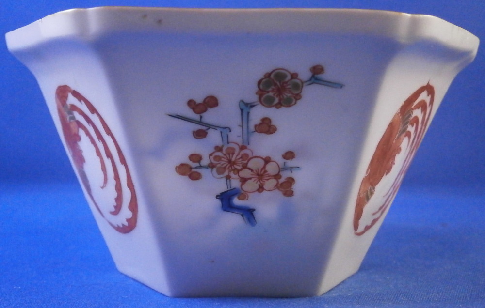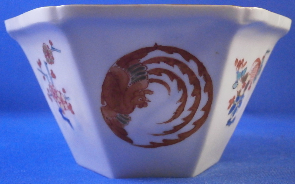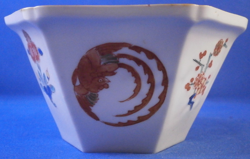 This is a really superb hexagonal bowl dish made in Japan in the late 17th century. Likely from the Arita area so they are today known as Arita ware or Hizen ware though this is used more for blue and white pieces. The wares with added color are known as Imari , with Kakiemon being a sub group of that. Kutani wares also come from this area but are different yet again. This little dish is a really nice early piece dating around 1680 so before European porcelain was around which is what I usually collect. If you look at the design you can see that the top German maker and others copied quite a few of them onto their wares in the 18th century. The bowl is hand painted in the Kakiemon style with an early phoenix bird / ho-ho bird in red and gold on three of the outside panels. In between are panels of different variations of Kakiemon flowers. The inside has two different designs to it in the same amazing colors and a single blossom to the very bottom. One of the designs is a flowering chrysanthemum branch I believe and the other some sort of pine tree growing on some rocks. Brown trim to the top edge. What you don't see easily is an attention to detail that is just incredible. There is a relief design to the porcelain paste around the top rim of clouds and some sort of other design I cannot quit make out. I tried to show this in some pictures but it's hard to see. A really incredible little bowl that looks amazing and is older than all my other things. And to top it all of it is in amazing condition with just two flea bites to the top edge. Invisible when on display so it looks absolutely perfect on display.The paste has a really nice white color to it. This dish just screams quality - it is the perfect piece to show off both the quality of the porcelain and the decoration. The bowl is 2.25 inch tall and about 4.375 inches at the widest point. It is unmarked which is normal. I do have a second bowl if anyone is interested in a very rare pair. Please email me for more information or other pictures.