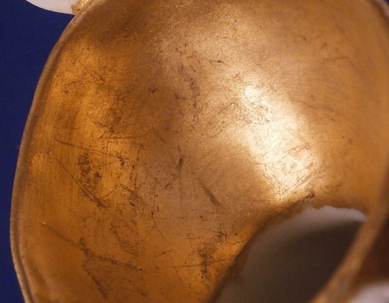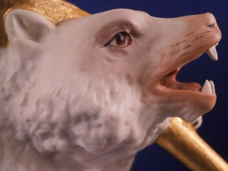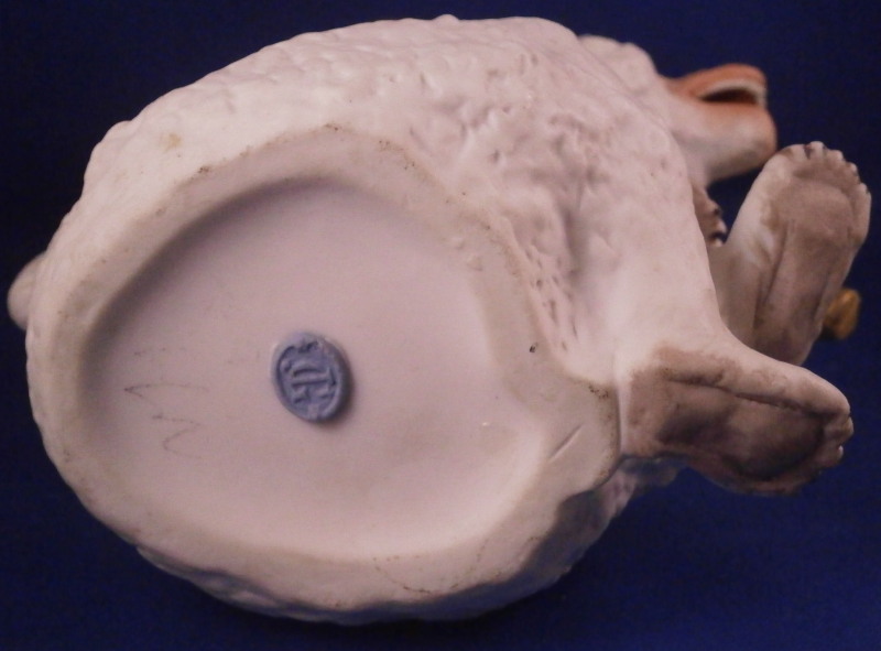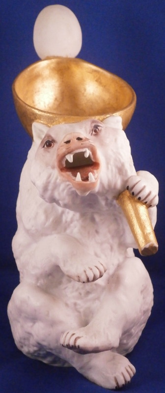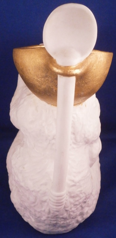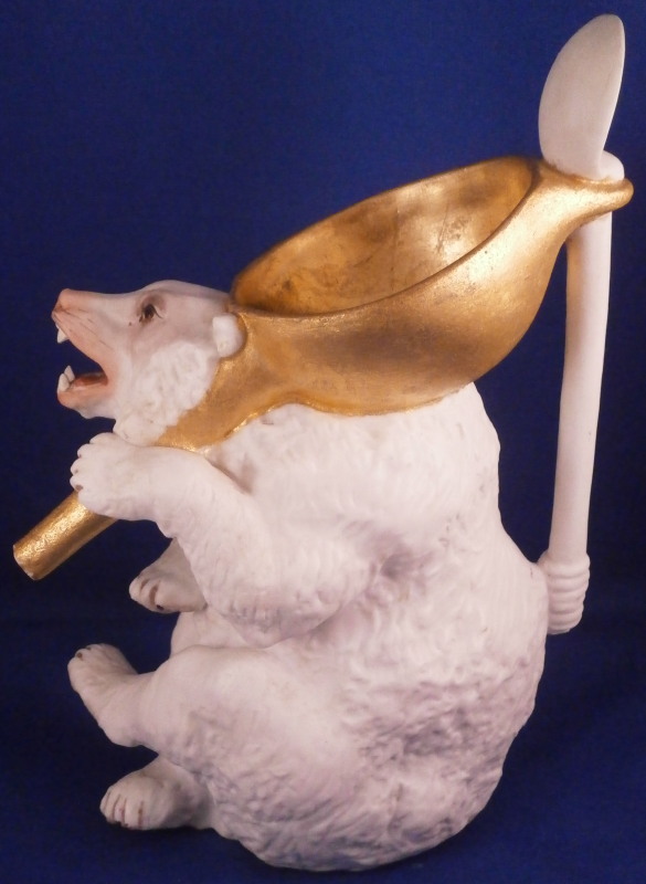 This is a a really fun figural pitcher / creamer / milk jug made by Jean Gille in the mid 19th century. Jean Gille was for me the best and one of the earliest makers of these unglazed pieces and he had a superb imagination and talent. The quality oif his wares is always top notch and this is another good example of his work. The attention to detail on this creamer is amazing - probably the most fun creamer I have seen in a long time. The piece is in the shape of a wear with his mouth open which forms the spout. The bear is holding a golden funnel of sorts which is held up with a white spoon in the back. The top opening is in the bottom of the golden colored funnel. This would actually be usable and still fairly easy to clean. The bear is mostly white except for the face and paws. The piece is about 7.75 inches tall including the white spoon, 3 inches wide and 5 inches deep. In great condition with use marks and some wear to the gilding but otherwise perfect. The piece displays very nicely. It is marked with the raised JG on an oval pad mark in blue as shown. Please email me for more information or other pictures.