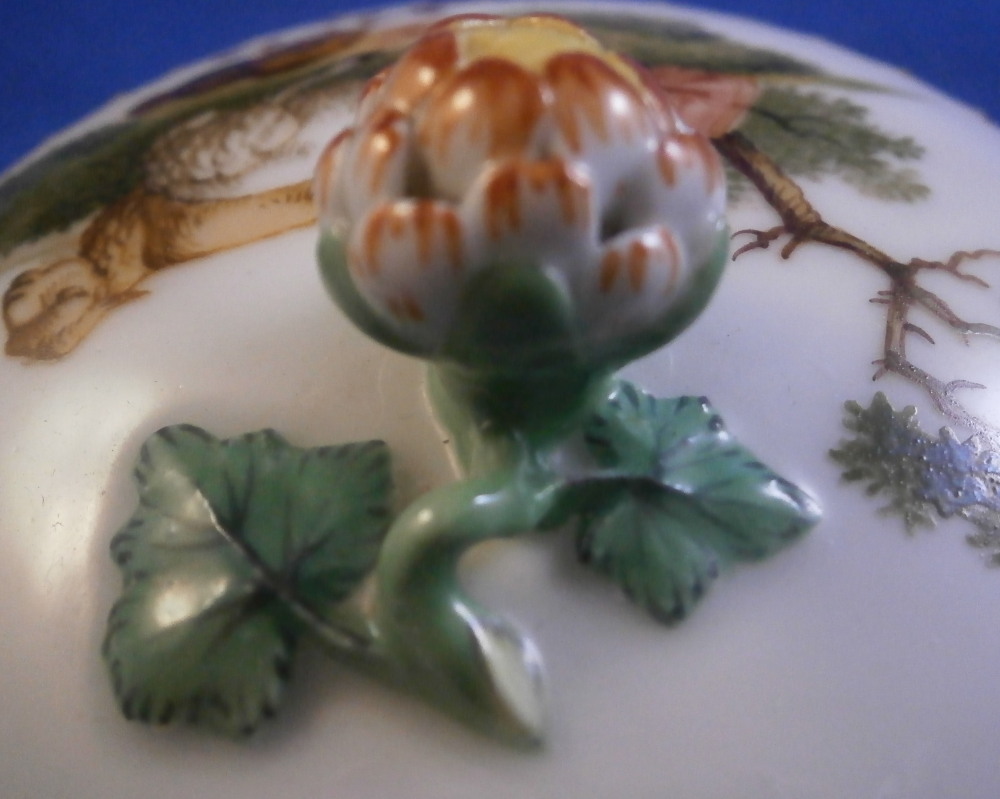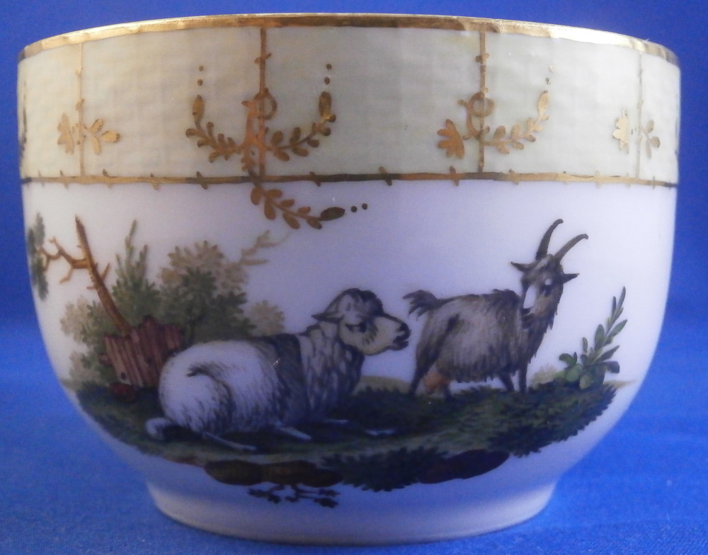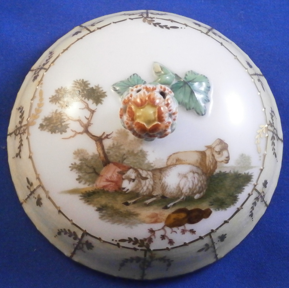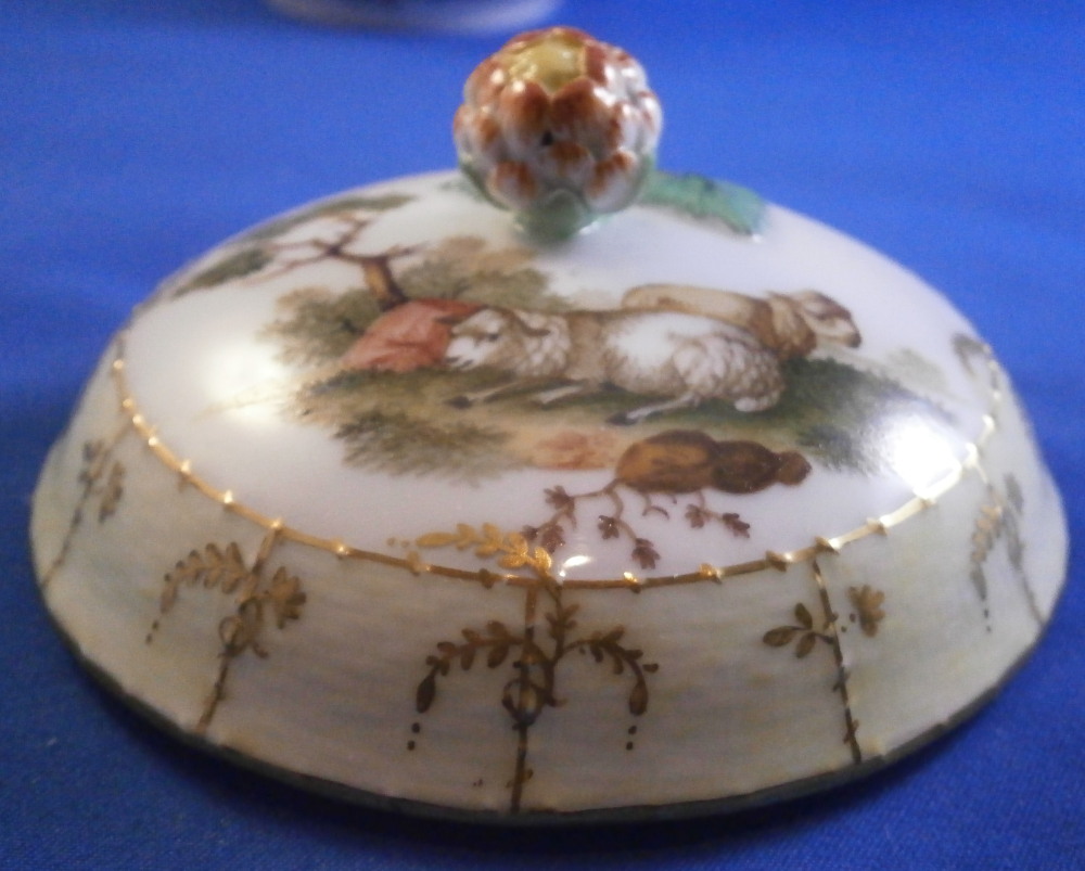 This is a lidded sugar dish made by KPM in the 18th century. KPM used no painters mark like the red orb yet during this period thus you only have the blue scepter and impressed marks most of the time. The main body is hand painted with an animal scene on either side including goats and a sheep in landscape surroundings. A smaller matching scene including two sheep can be found on the lid. Animal scenes are much harder to find than most so this is a welcome change from the more usual examples. The top rim of the pot and outer rim of the lid have a great basket weave design to the paste painted in yellow with gold designs over that. The lid has a nice floral finial to it with two leaves. The set is in perfect condition with just one small spot of gold wear to the very edge of the lid which is amazing given its age. The piece is 3.625 inches tall with the lid and 3.375 inches in diameter. It is marked underneath with the under glaze blue scepter mark as shown. Please email me for more information or other pictures.
