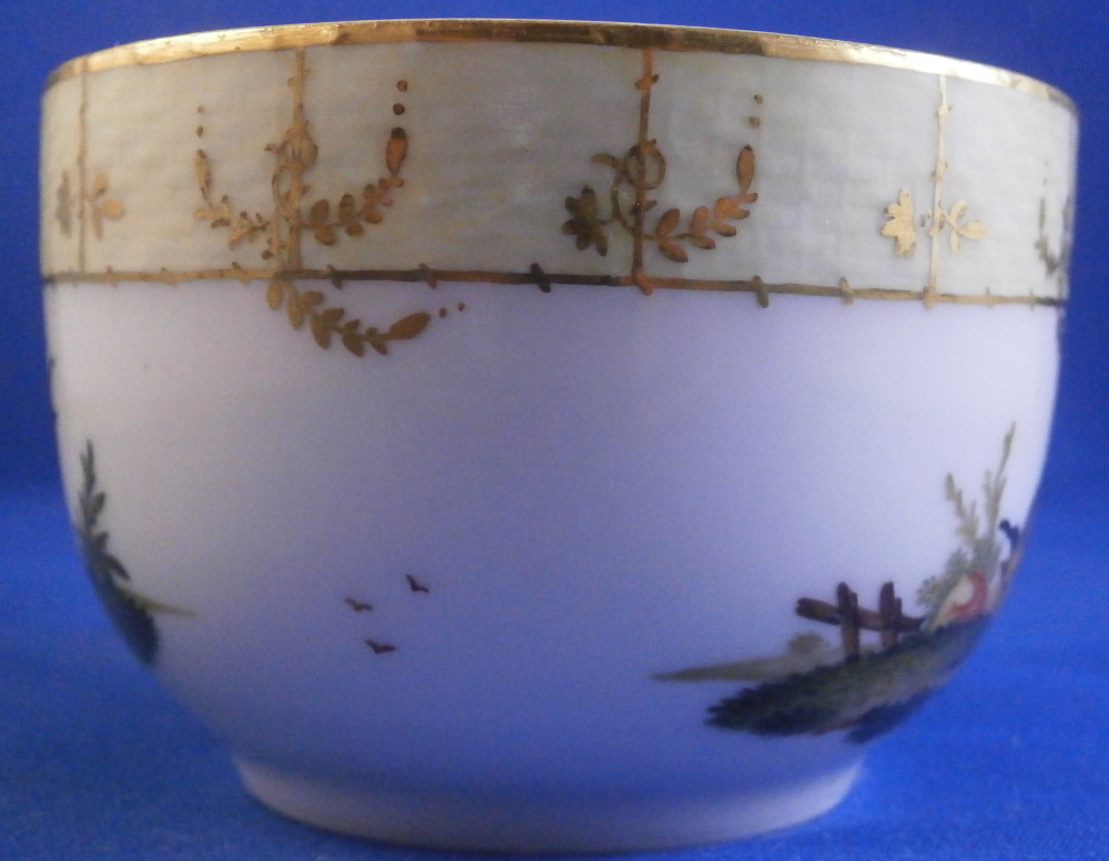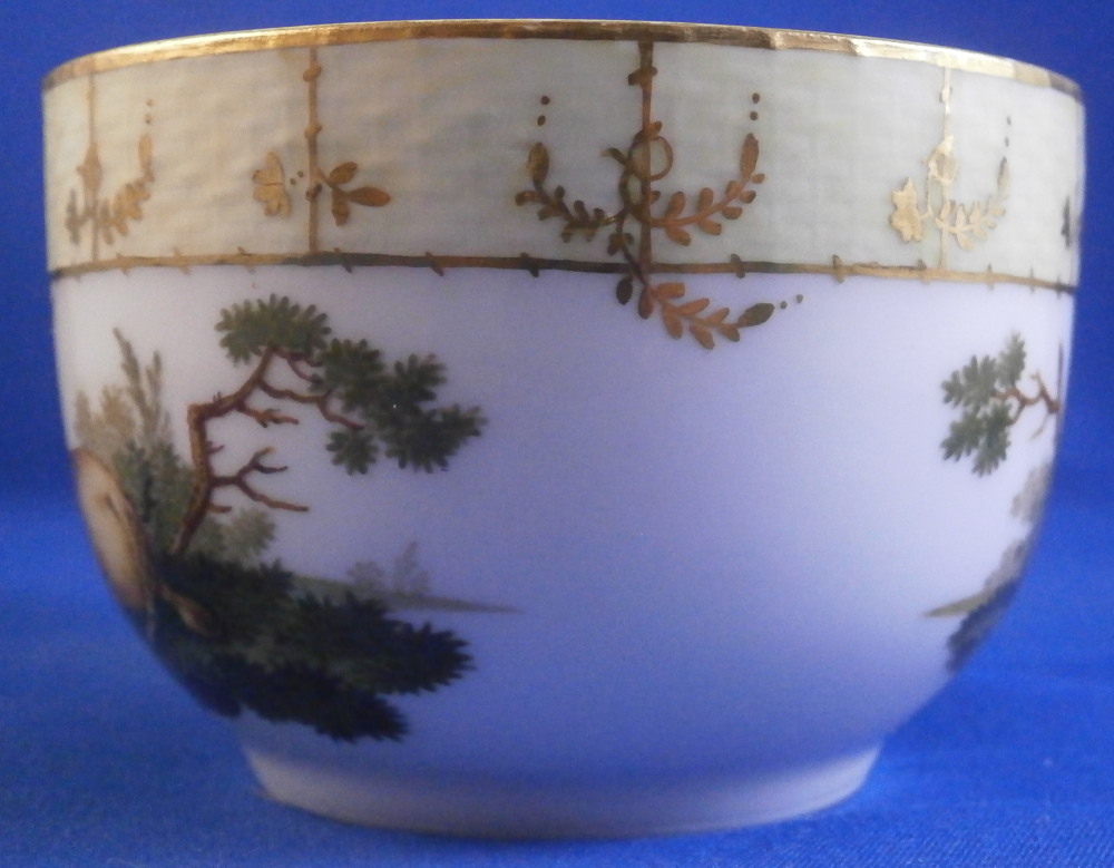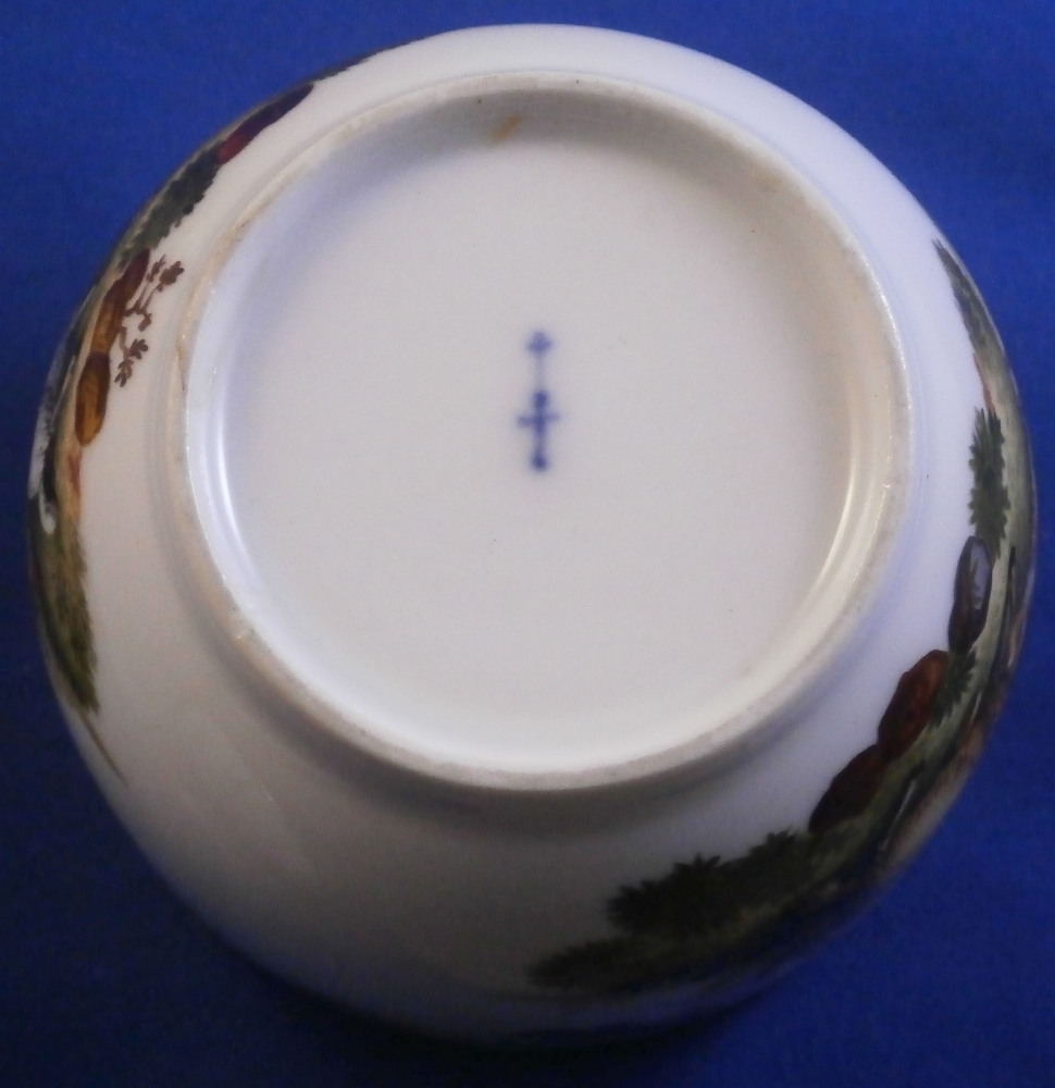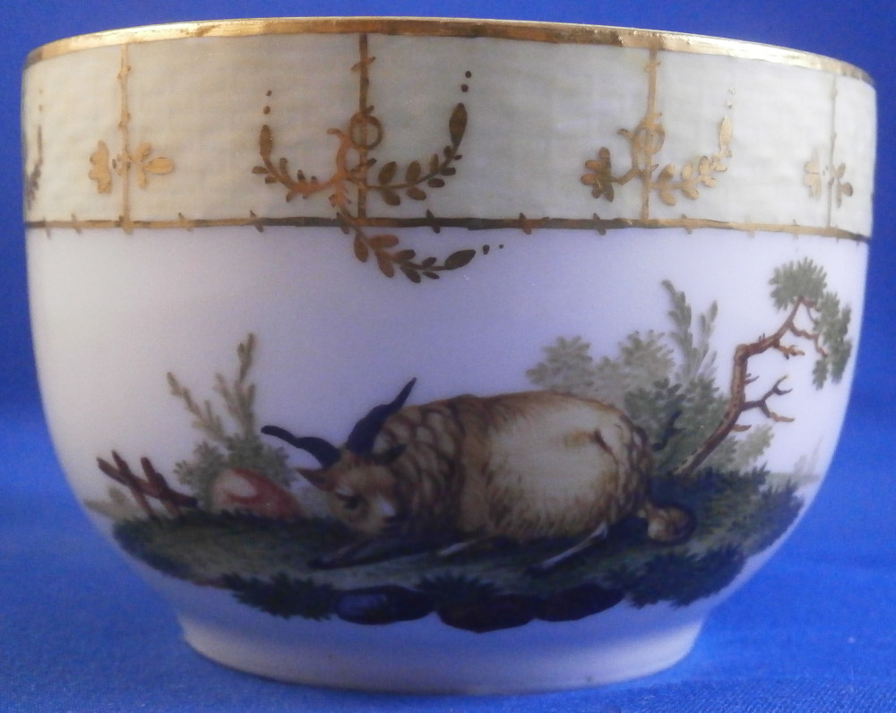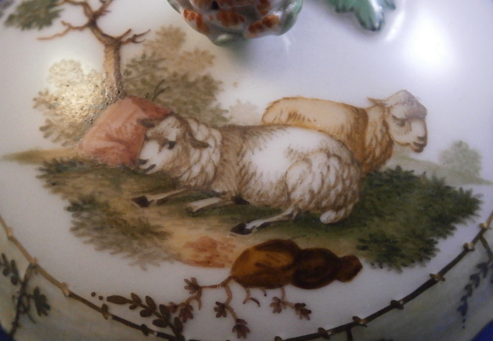 This is a lidded sugar dish made by KPM in the 18th century. KPM used no painters mark like the red orb yet during this period thus you only have the blue scepter and impressed marks most of the time. The main body is hand painted with an animal scene on either side including goats and a sheep in landscape surroundings. A smaller matching scene including two sheep can be found on the lid. Animal scenes are much harder to find than most so this is a welcome change from the more usual examples. The top rim of the pot and outer rim of the lid have a great basket weave design to the paste painted in yellow with gold designs over that. The lid has a nice floral finial to it with two leaves. The set is in perfect condition with just one small spot of gold wear to the very edge of the lid which is amazing given its age. The piece is 3.625 inches tall with the lid and 3.375 inches in diameter. It is marked underneath with the under glaze blue scepter mark as shown. Please email me for more information or other pictures.