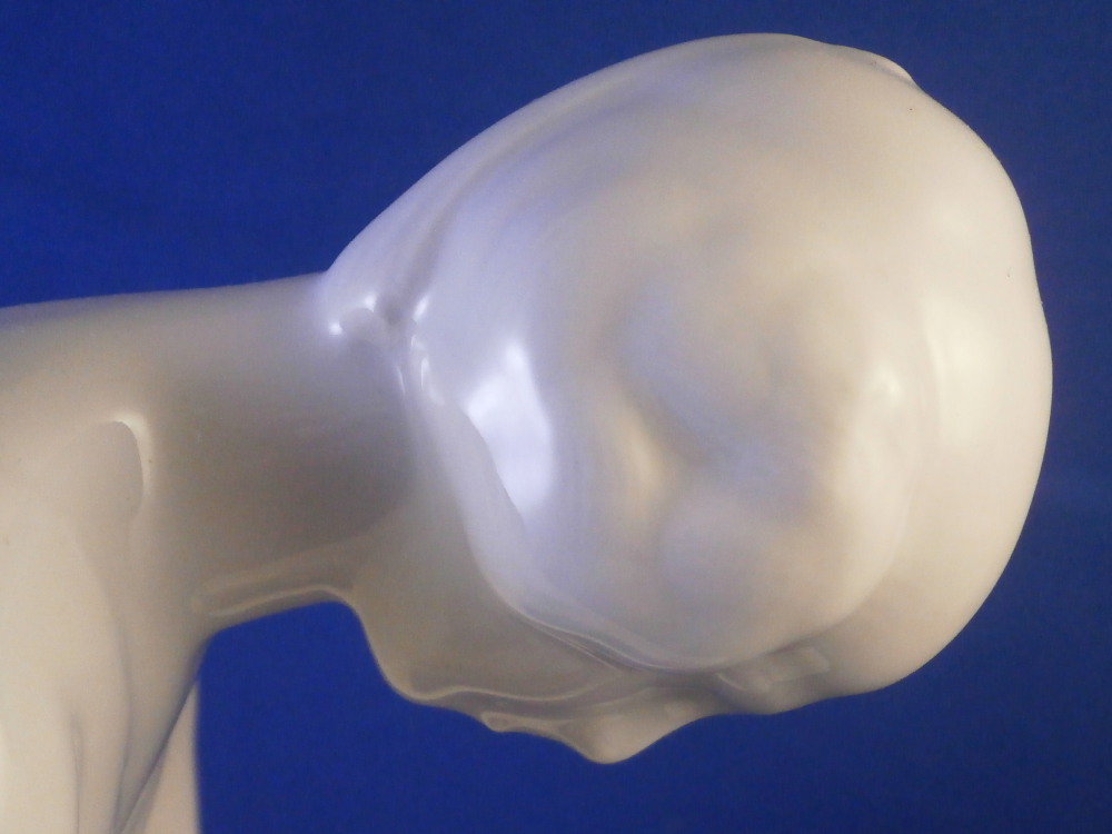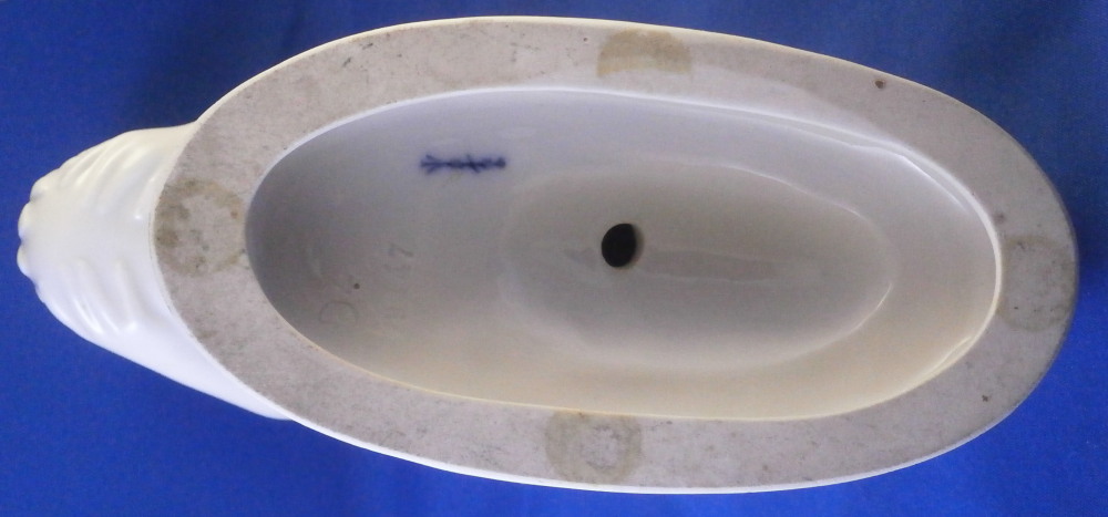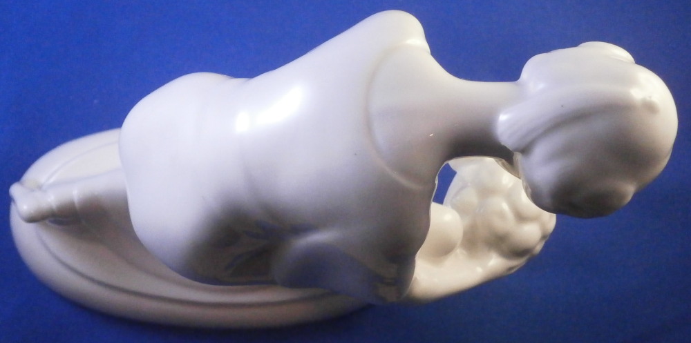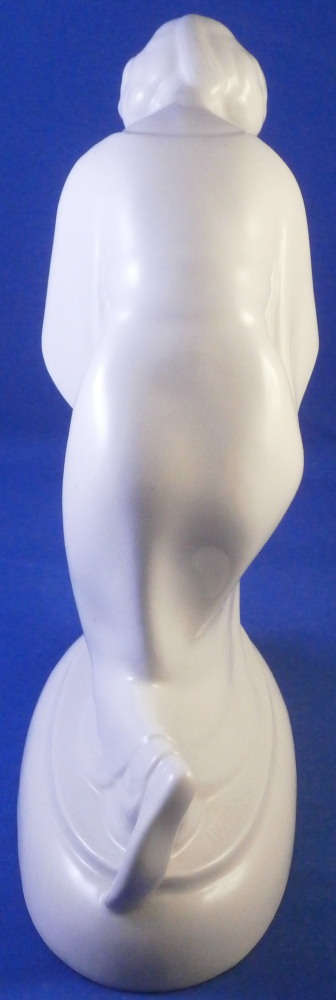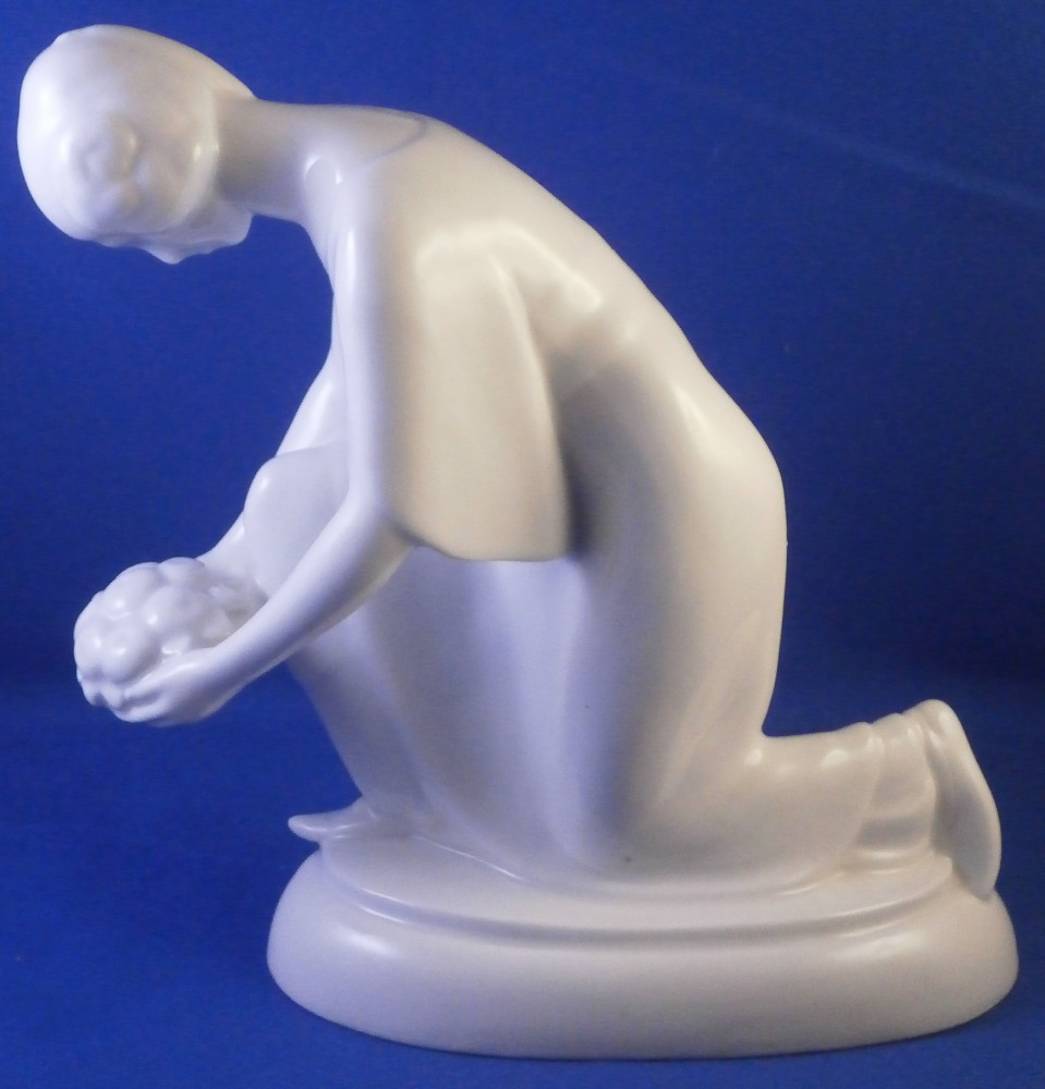 This is a very nice figurine made by KPM in the early 20th century during the original period. One of the rarer models and quite difficult to find in white from this period and in perfect condition on top of that! It is a Turkish lady that is kneeling and presenting a bowl of fruit. She is wearing a flowing robe and has a simple yet elegant base. This figurine was part of the crown prince's wedding procession designed by Adolf Amberg and extremely popular among collectors even today though most one sees are newer models! One can see why - a well modeled figurine that is super elegant and left in the white brings this out even more I think! The figurine is in perfect condition with a few tiny brown firing spots as shown. She displays perfectly and is 6.875 inches tall, 2.75 inches wide and 6.5 inches deep. The figure is marked underneath with the older under glaze blue scepter mark as well as the usual impressed marks one finds on older KPM pieces as shown. Z is the year mark for 1925. The scepter has a scratch mark in the glaze denoting a second choice due to the brown firing spots. Please email me for more information or other pictures.