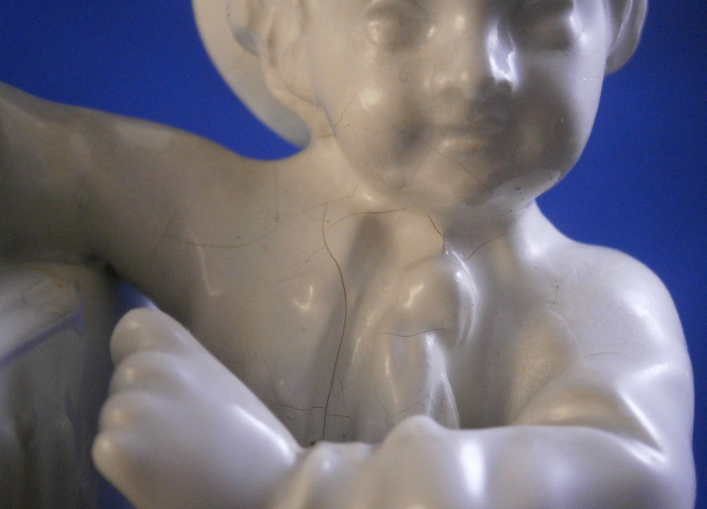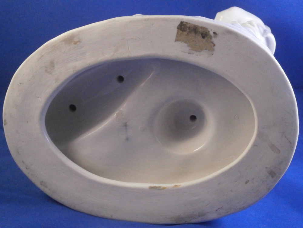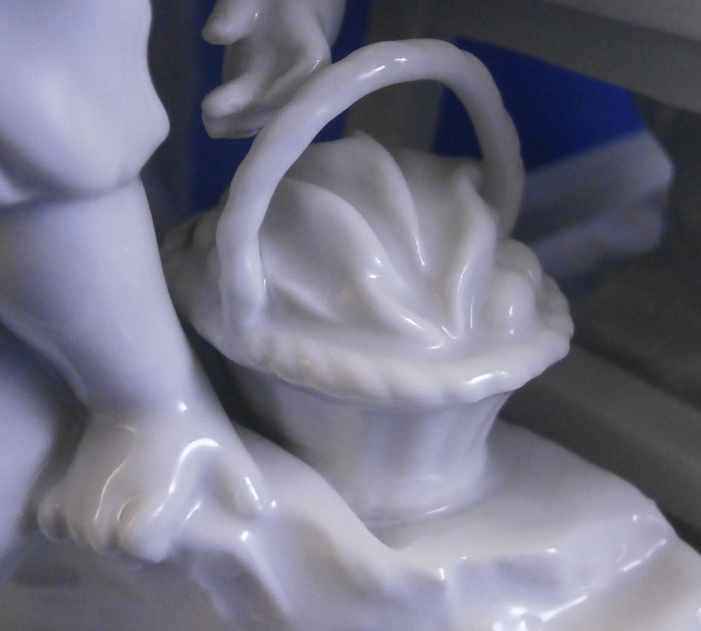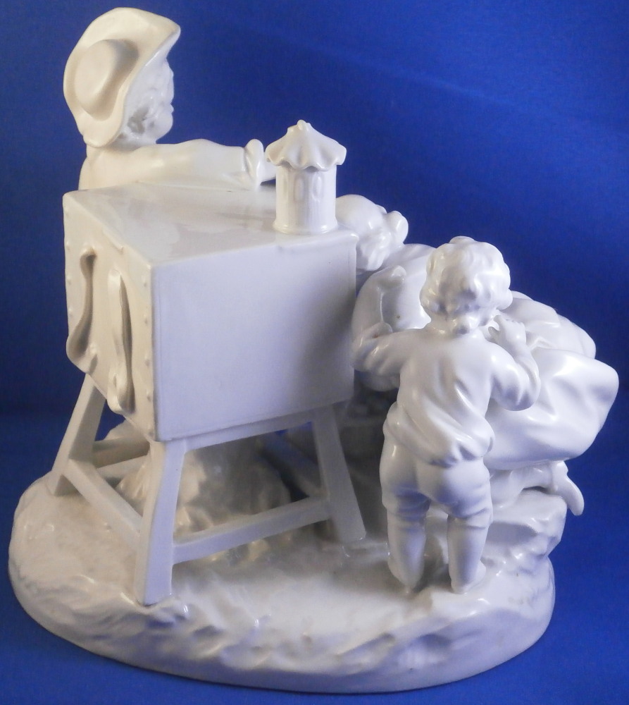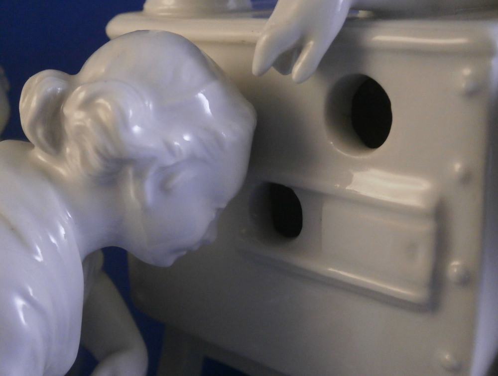 This is a superb figurine of an interesting subject made by KPM in the early 20th century. A very rare model to find but this same figure was also made by Chelsea / Derby and Sevres but I am not sure if they copied them from each other or it was done from an engraving. I assume it is the latter. This is the version left in the white but I also own the hand painted version. The subject is of a lady looking into a laterna magica devise which is sort of the earliest precursor to our modern day movies. There is a gentleman to the side and a child next to her. The piece is nicely modeled with lots of details. The figure is in decent condition and displays nicely but the gentleman's head has been off and repaired and one of the straps by which he would carry the devide has also been worked on. The edge of his hat have also been worked on by the look of it. Not obious when on display but the restoration has aged and could be redone to improve it and make it invisible. The figurine is 6.75 inches tall, 7 inches wide and 5 inches deep. It is marked underneath with the under glaze blue scepter that was ground down to hide a second choice line I presume. Also an impressed letter D as shown. Not a piece you will see again anytime soon! Please email me for more information or other pictures.