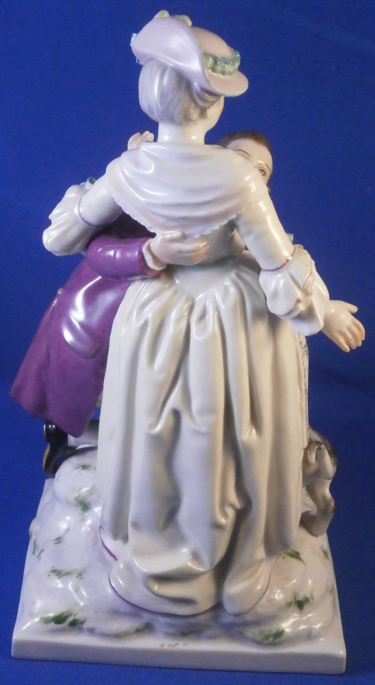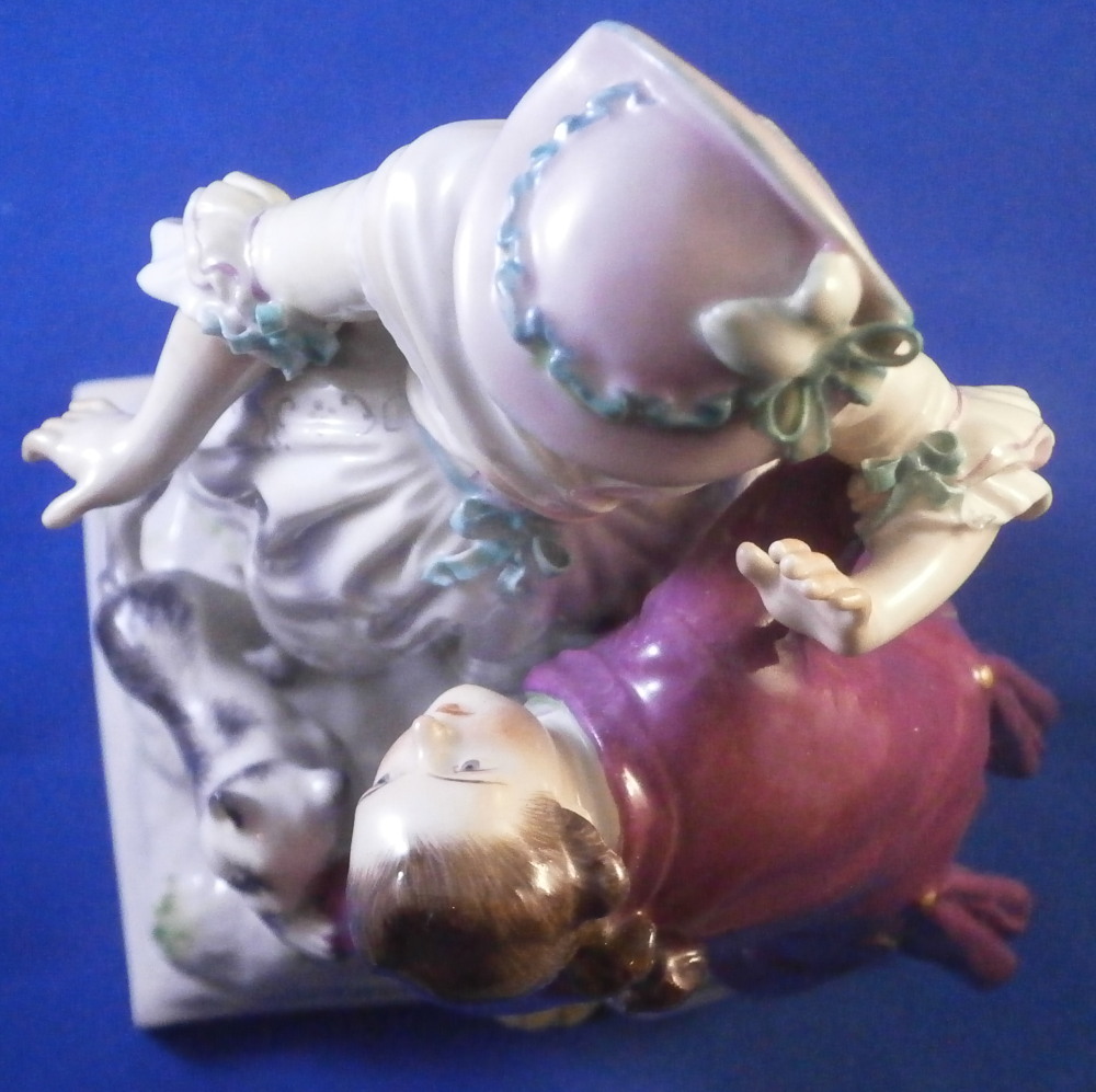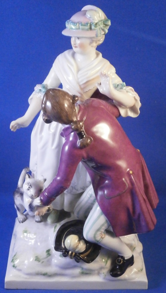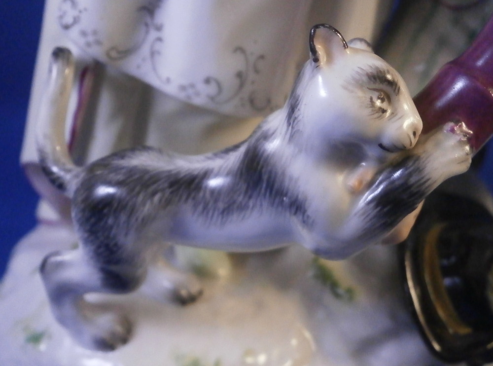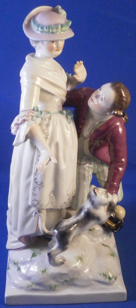 This is a superb figurine made by KPM in the mid 20th century. It is of a lady and a gentleman as well as a cat. The lady is nicely dressed and standing on a rectangular base with some rockwork to it and painted greenery. The gentleman is kneeling beside her and playing with the cat. His hat is laying on the ground. He is also dressed quite nicely. The figure is superbly modeled and hand painted with lots of details!The piece is in perfect condition! It is 6.75 inches tall, 4 inches wide and 3 inches deep. The figurine is marked underneath with the under glaze blue scepter (first choice), the red orb as well as the usual impressed marks and an artist mark as shown. A really nice figurine! Please email me for more information or other pictures.