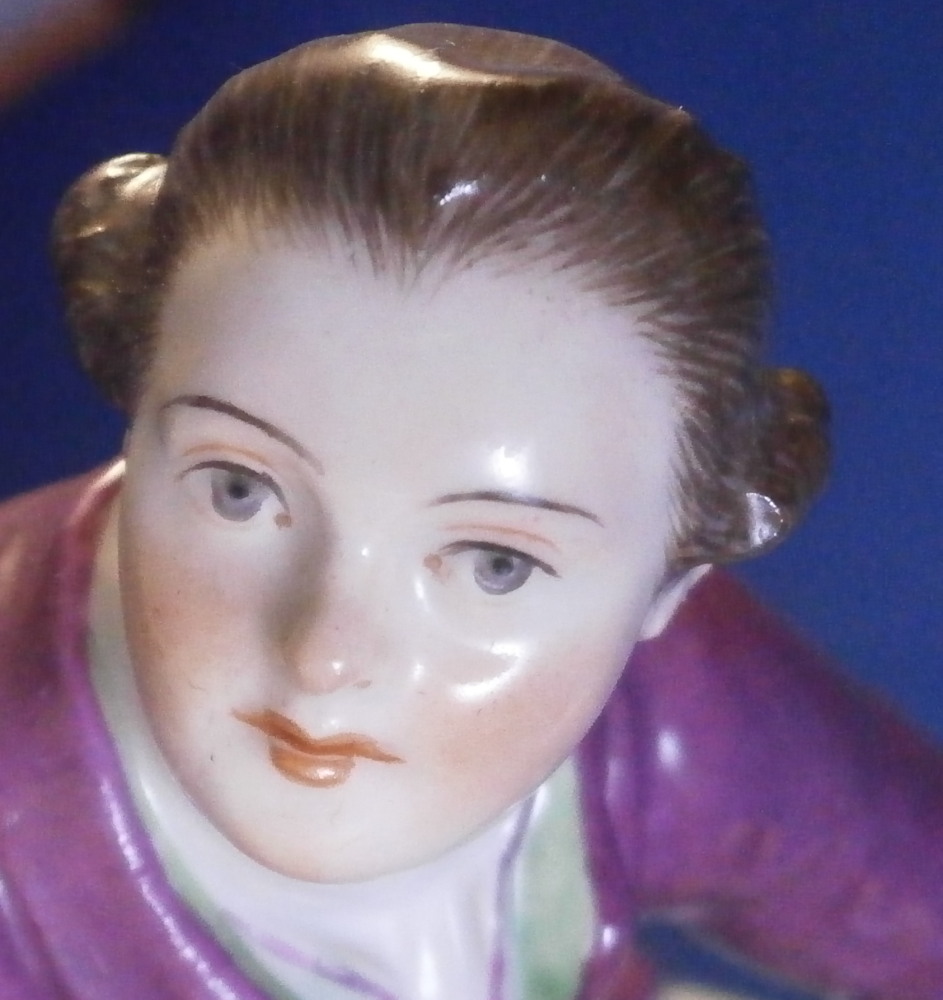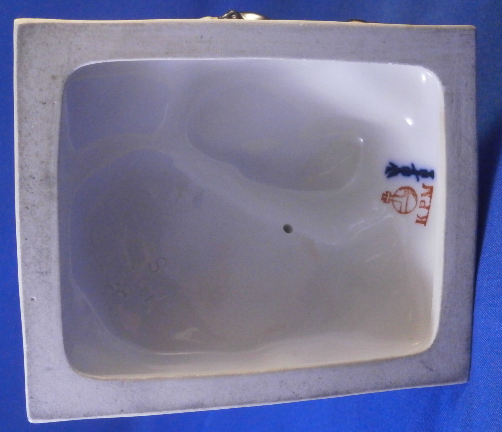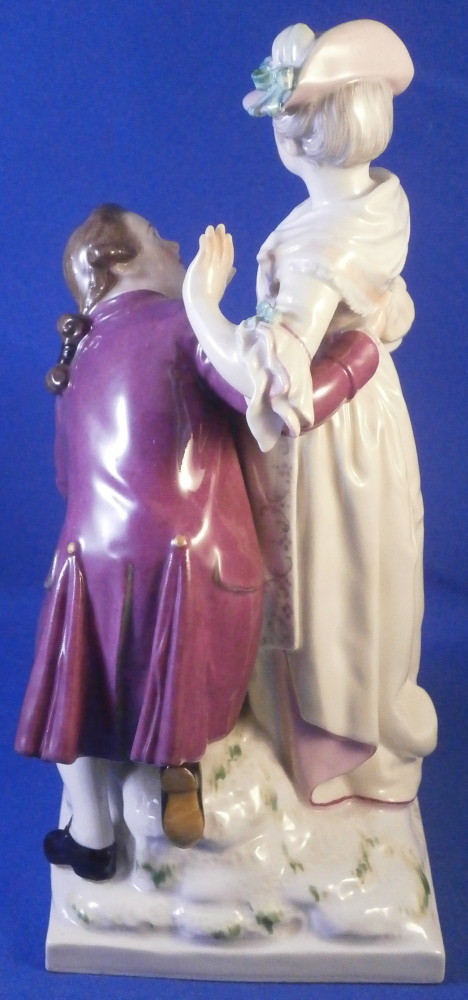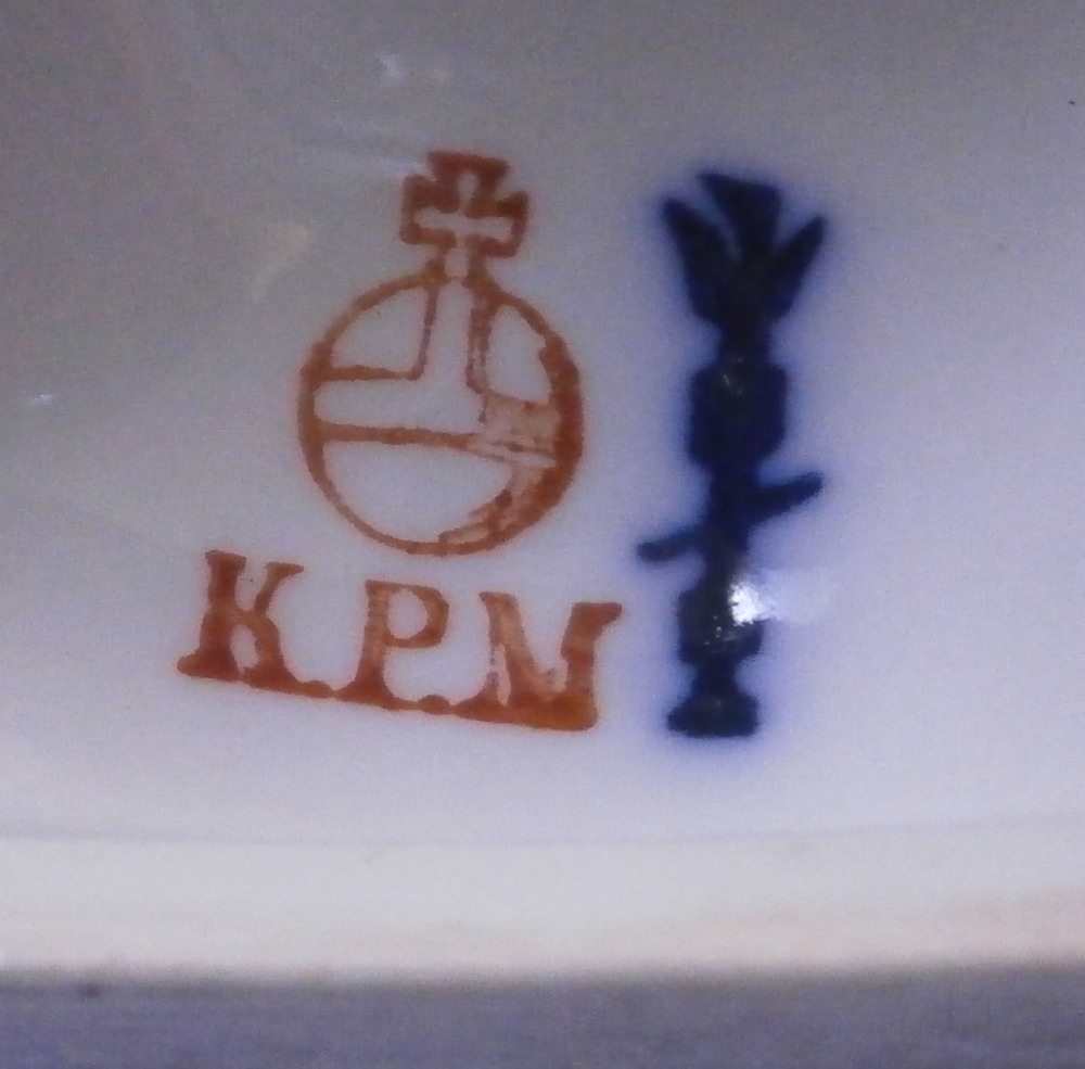 This is a superb figurine made by KPM in the mid 20th century. It is of a lady and a gentleman as well as a cat. The lady is nicely dressed and standing on a rectangular base with some rockwork to it and painted greenery. The gentleman is kneeling beside her and playing with the cat. His hat is laying on the ground. He is also dressed quite nicely. The figure is superbly modeled and hand painted with lots of details!The piece is in perfect condition! It is 6.75 inches tall, 4 inches wide and 3 inches deep. The figurine is marked underneath with the under glaze blue scepter (first choice), the red orb as well as the usual impressed marks and an artist mark as shown. A really nice figurine! Please email me for more information or other pictures.