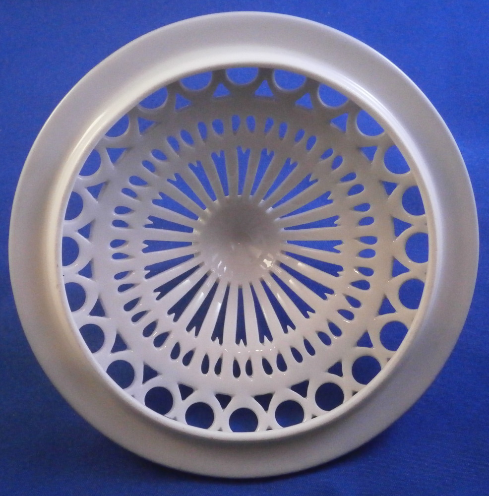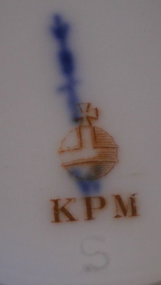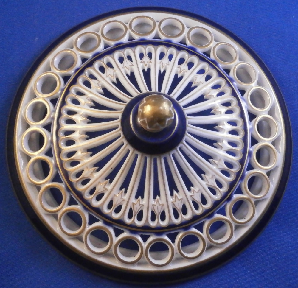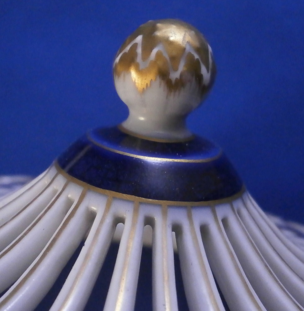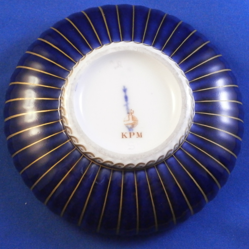 This is a nice little potpourri dish made by KPM in the early 20th century. I have seen this shape before but never decorated always in white so it was a nice treat to find this version here. The lid is heavily reticulated with a nice design of circular openings around the edge and a more fancy design towards the central finial. The bottom is solid so it could hold something nice smelling like floral petals or even some soft of liquid. The dish is decorated with this nice cobalt blue with some gold trim. It's always a great combination in terms of colors but looks amazing on this piece with the openwork on the lid. A great looking example! The piece is in perfect condition and is marked underneath with the under glaze blue scepter mark, the red orb as well as the usual impressed marks of this period as shown. It is about 2.875 inches tall including the finial and has a diameter of about 4.625 inches. Please email me for more information or other pictures.