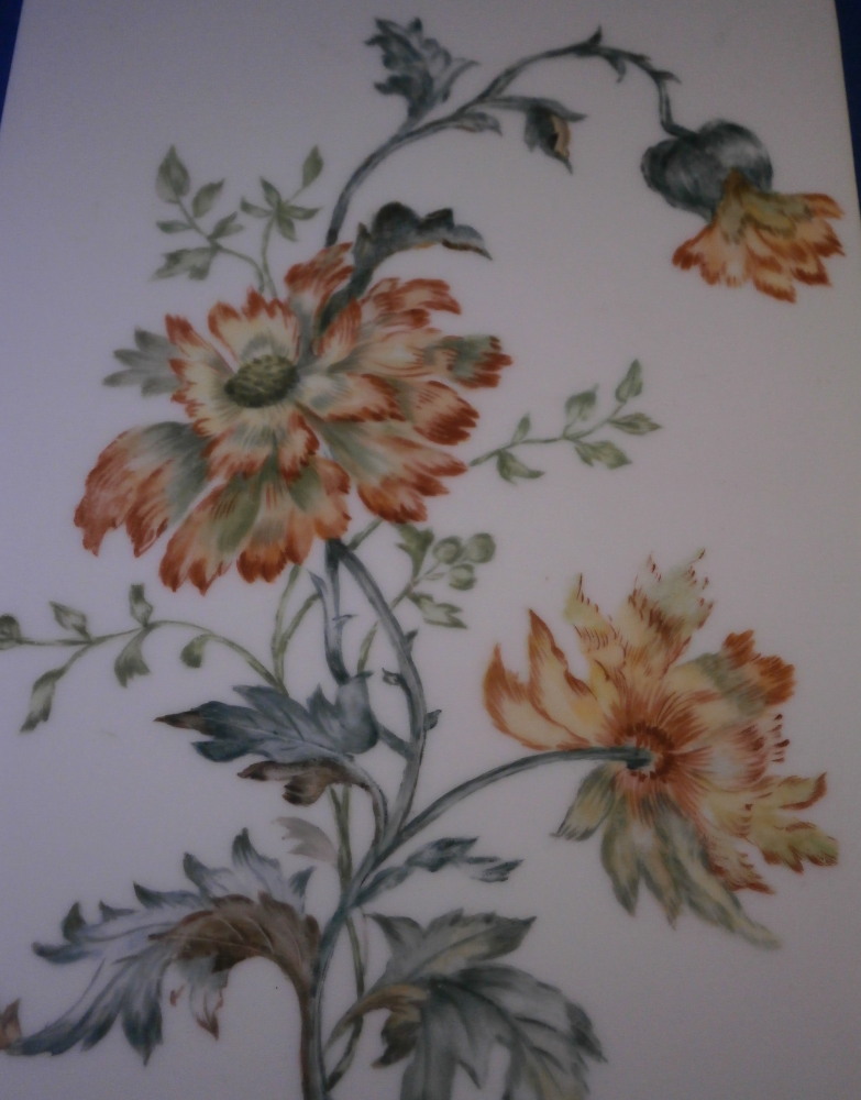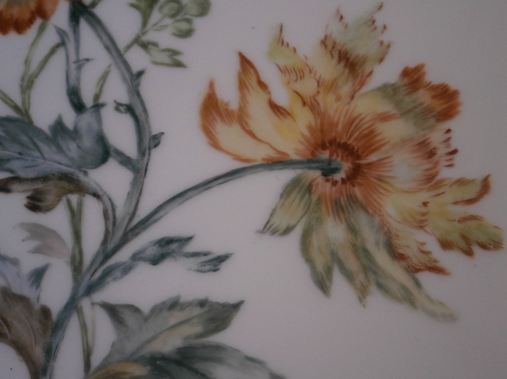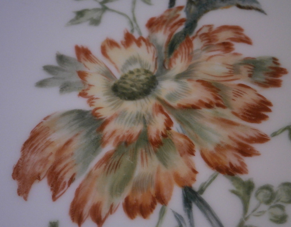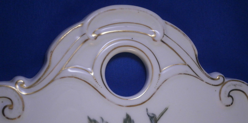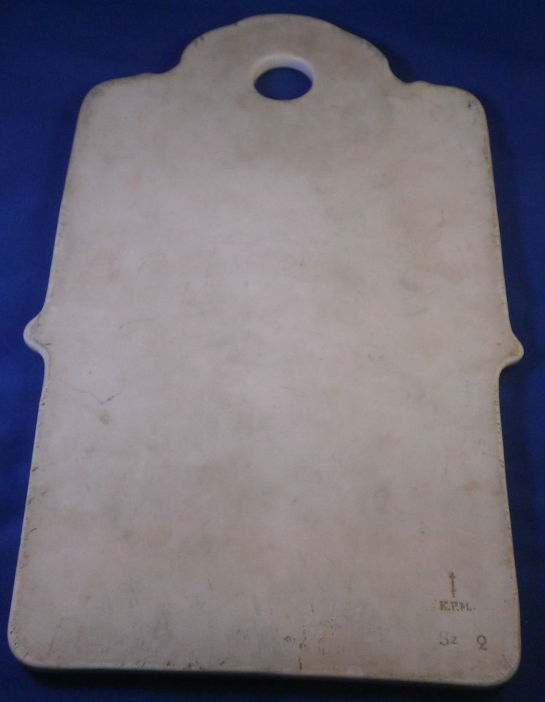 This is a rare find - a breakfast / cutting board made by KPM in the 19th century. You don't see breakfast board very often at all and this one is nicely hand painted with a yellow and orange fancy poppy flower with its blossoms, stems and leaves. The upper part of the board has some relief design to the outside that is highlighted with gilding. A nice looking piece! It is is in great condition with some wear to the gold highlights along the top as shown. Looks great and displays nicely! The plaque is marked underneath with the impressed scepter mark with K.P.M. under that as well as some impressed numbers and letters as shown. The board is 11.625 inches tall, 7.125 inches wide and 0.375 inches thick. Please email me for more information or other pictures.