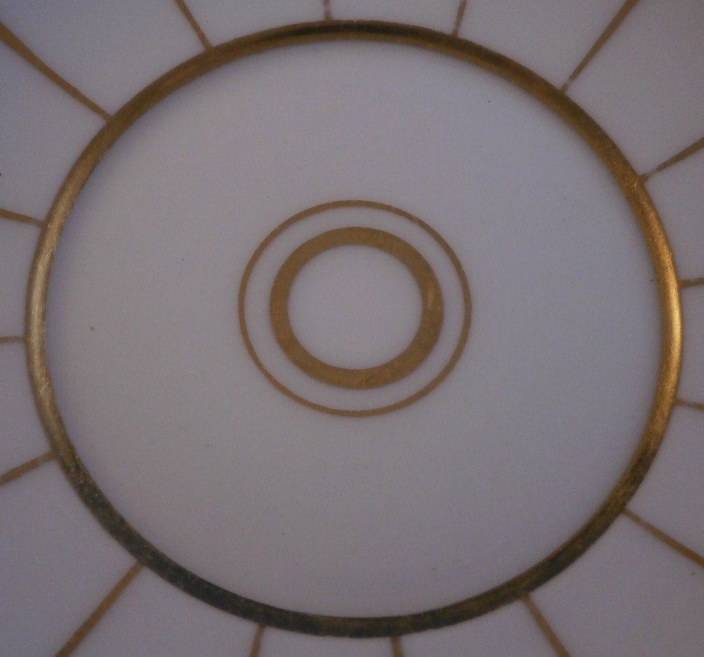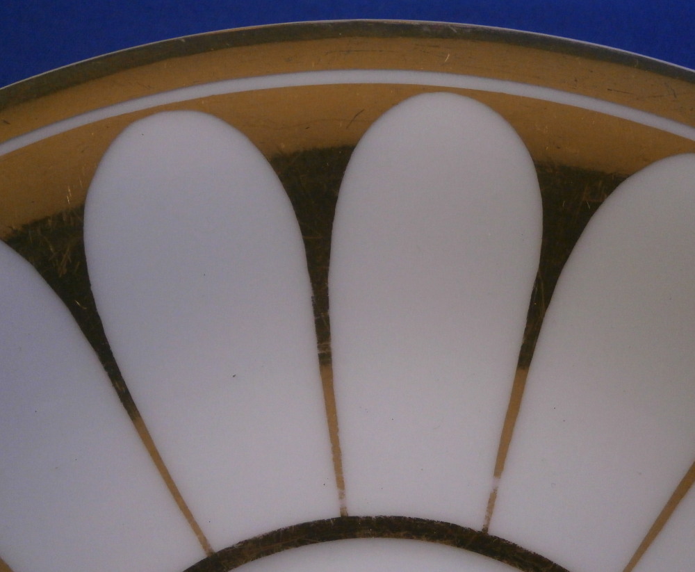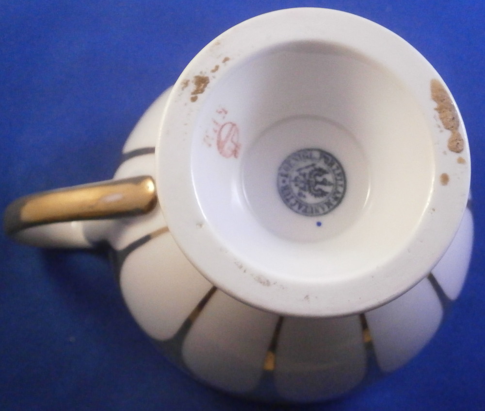 This is a cup and saucer made by KPM in the mid 19th century . The design remind me of the Grecque Athena Service made by Fuerstenberg but here we have an earlier KPM design. The set is decorated with a white and gold design that is quite nice. Sort of like a fan shaped or arch design with the handle in the shape of the earlier swan handles without the detail. The cup is still influenced by the earlier Biedermeier period. A great cup & saucer from its original period. Both pieces are in great condition with just some very minor wear/use marks mainly to the saucer and a tiny white spot to the top of the handle. The set displays perfectly! The saucer is 1 inch tall and just over 6 inches in diameter. The cup is 2.875 inches tall and 3.375 inches in diameter at the top. The saucer is marked with the so called penny mark with the scepter above it used during the period of 1849 until 1970 and the cup has just the penny mark used from 1847 until 1849. The combo would date this set right to 1849. Both also have the red orb mark as well as some other marks as shown. I also have quite a few other pieces from this service up for sale on the site. Please email me for more information or other pictures.