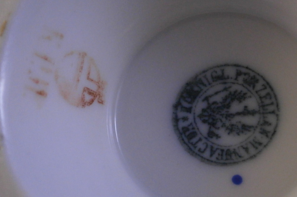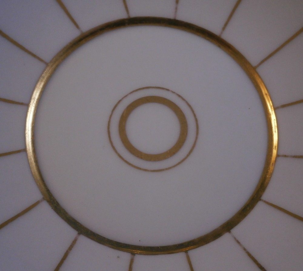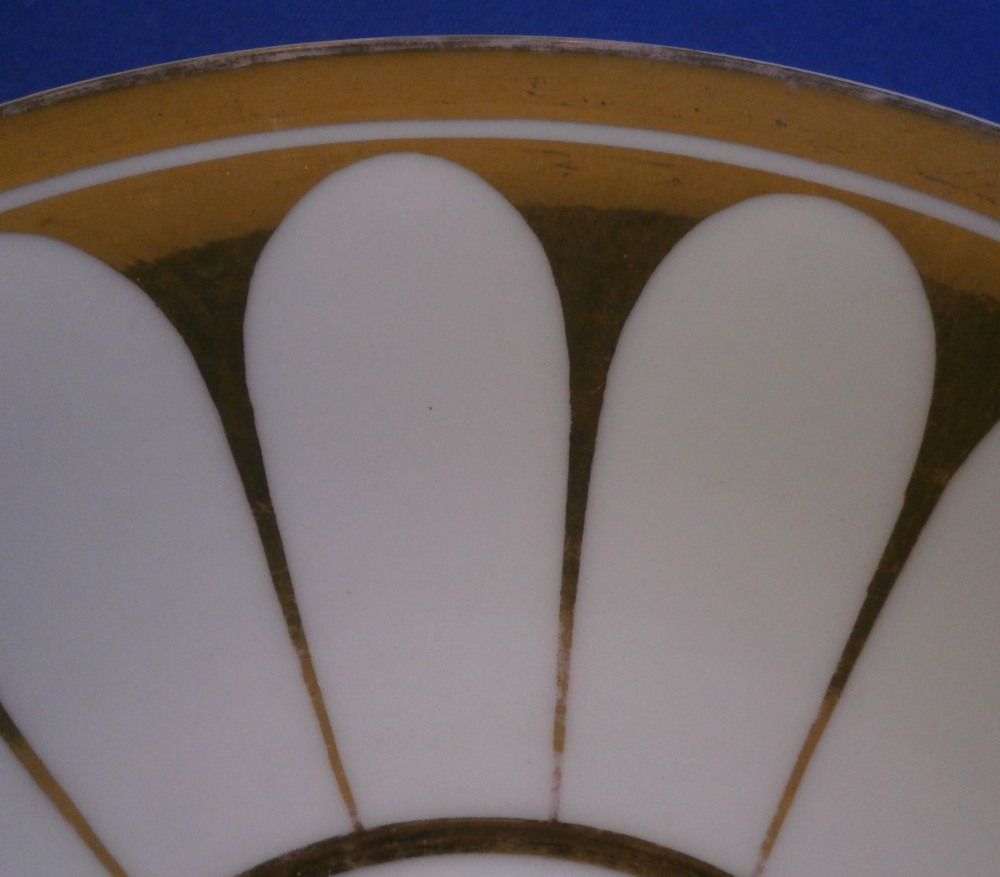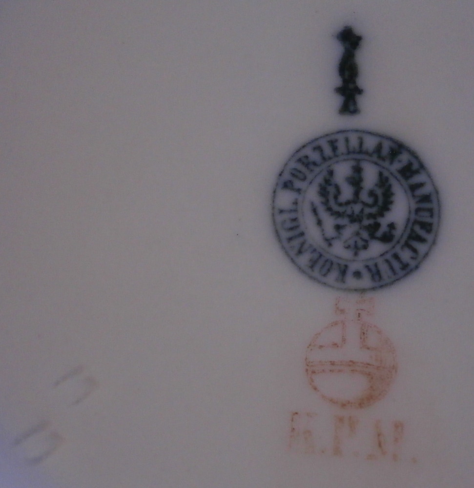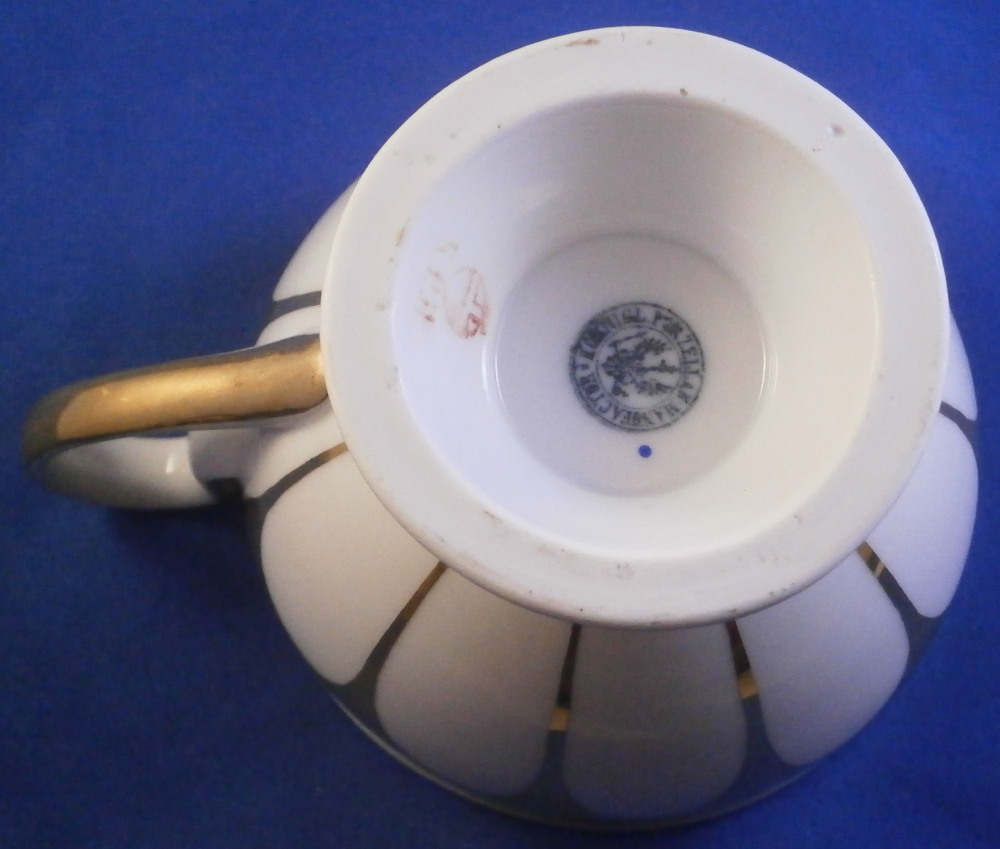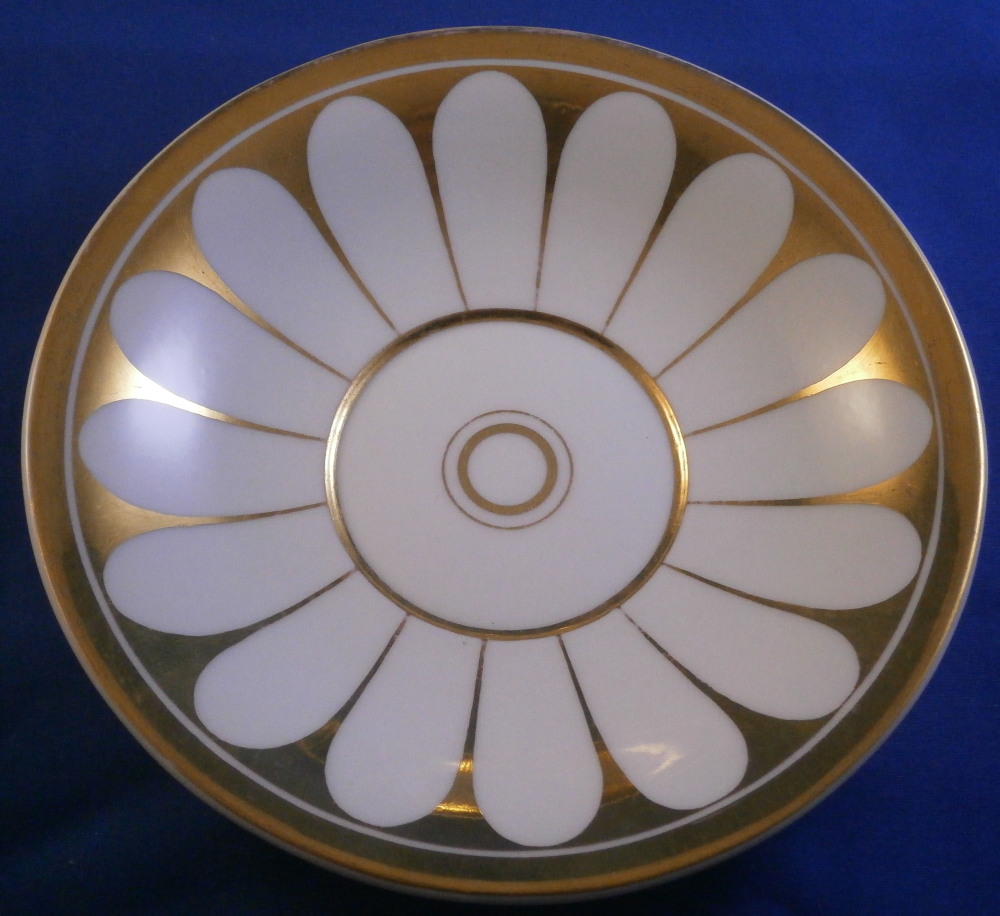 This is a cup and saucer made by KPM in the mid 19th century . The design remind me of the Grecque Athena Service made by Fuerstenberg but here we have an earlier KPM design. The set is decorated with a white and gold design that is quite nice. Sort of like a fan shaped or arch design with the handle in the shape of the earlier swan handles without the detail. The cup is still influenced by the earlier Biedermeier period. A great cup & saucer from its original period. Both pieces are in great condition with just some very minor wear/use marks mainly to the saucer and a tiny white spot to the top of the handle. The set displays perfectly! The saucer is 1.125 inches tall and 6 inches in diameter. The cup is 2.875 inches tall and just over 3.25 inches in diameter at the top. The saucer is marked with the so called penny mark with the scepter above it used during the period of 1849 until 1970 and the cup has just the penny mark used from 1847 until 1849. The combo would date this set right to 1849. Both also have the red orb mark as well as some other marks as shown. I also have quite a few other pieces from this service up for sale on the site. Please email me for more information or other pictures.