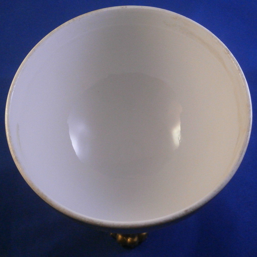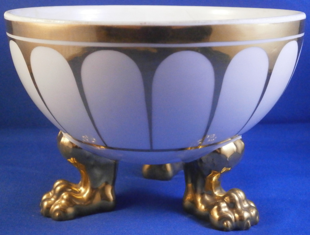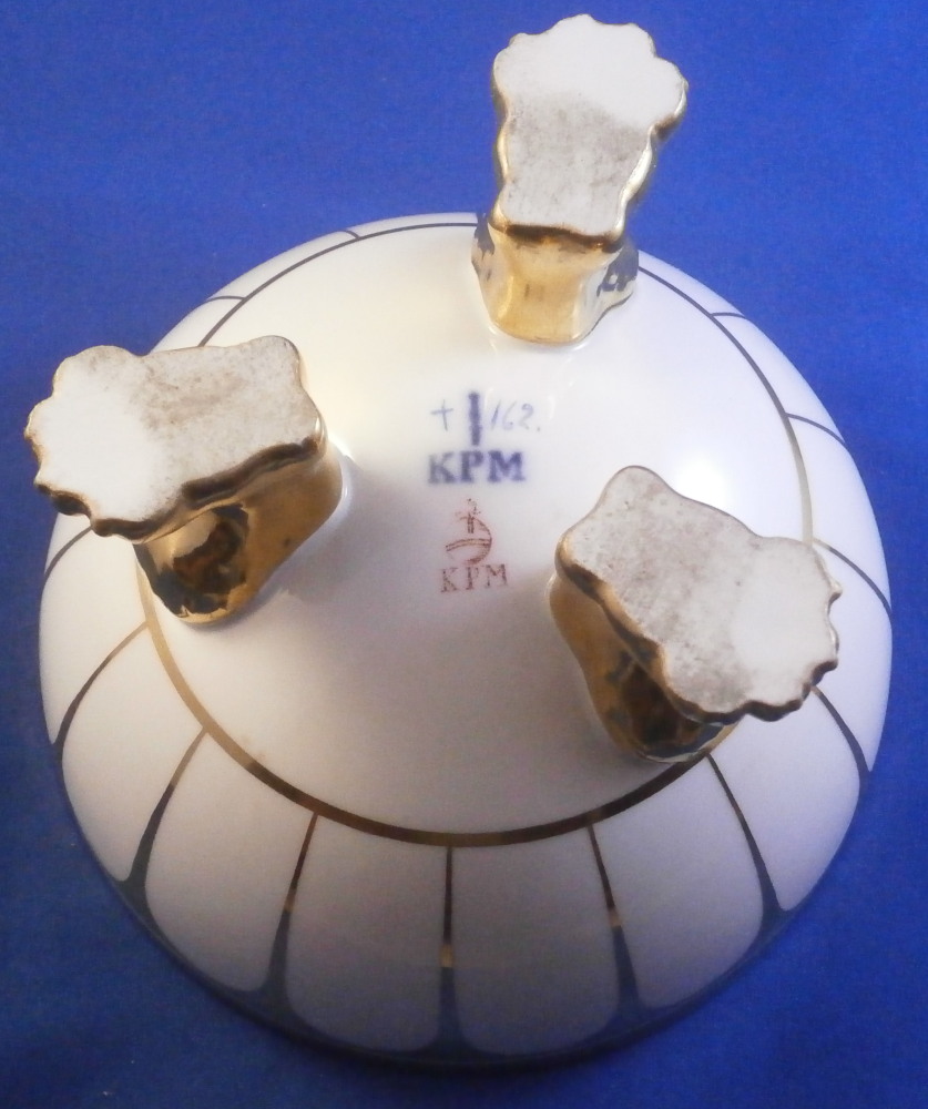 This is a superb lidded box / dish made by KPM in the mid 19th century . The design remind me of the Grecque Athena Service made by Fuerstenberg but here we have an earlier KPM design. The piece is decorated with a white and gold design that is quite nice. Sort of like a fan shaped or arch design. It sits on three very detailed and fully gilded claw feet and has a nicely shaped finial on the lid. A really nice looking piece! It is in great condition with just some very minor wear/use marks nd a small chip to the very edge of the lid as shown that is very ahrd to spot and thus it displays perfectly! The piece is 5.5 inches tall and 5.5 inches in diameter. Marked with the letter KPM under the scepter used from 1837 until 1844 plus the red orb mark as well as some other marks like a gilder's mark as shown. Almost 200 years old and still looks stunning! I also have quite a few other pieces from this service up for sale on the site. Please email me for more information or other pictures.