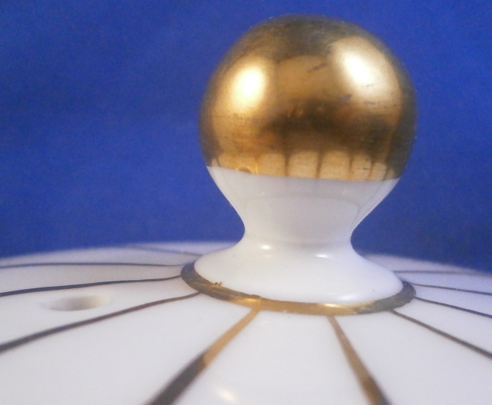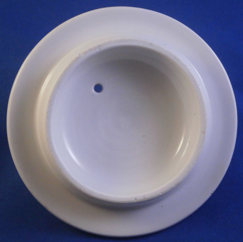 This is a lid for a teapot from this design made by KPM in the mid 19th century . The design remind me of the Grecque Athena Service made by Fuerstenberg but here we have an earlier KPM design. The set is decorated with a white and gold design that is quite nice. Sort of like a fan shaped or arch design with the handle in the shape of the earlier swan handles without the detail. Still influenced by the earlier Biedermeier period. A great lid in perfect condition so if you happen to miss a lid or yours is damaged here is you probably once in a life time chance to get a replacement. The lid has a diameter of 3.625 inches. The outer diameter of the ring that sits within the tea pot is 2.75 inches. Unmarked which is normal for a lid but I have quite a few other pieces from this service up for sale on the site. Please email me for more information or other pictures.
