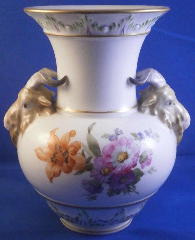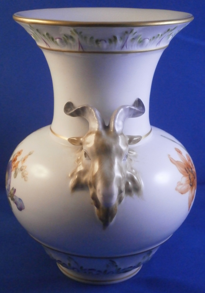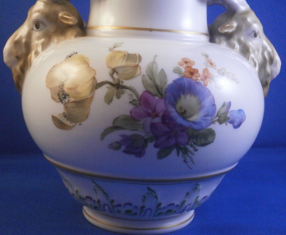 This is a fun vase made by KPM in the early 20th century. It has a really fun shape to it and is hand painted with two very nice floral arrangements as well as a nice puce and green trim on a raised design to the top rim and bottom rim, a bit of gold trim and off coure my favorite part - two amazingly detailed goat / ram heads on either side acting as handles. These are hand painted superbly and this is the nicest version of them that they made I think. The vase is in perfect condition and is marked underneath with the under glaze blue scepter mark, the red orb as well as various painter's marks / gilder's mark and numbers and impressed marks normal to this period. The vase is 6.625 inches tall and 4.75 inches in diameter with the handles sticking out a bit from that. This shape is nice and stable so it is perfect for using with cut flowers from your garden or the store! Please email me for more information or other pictures.