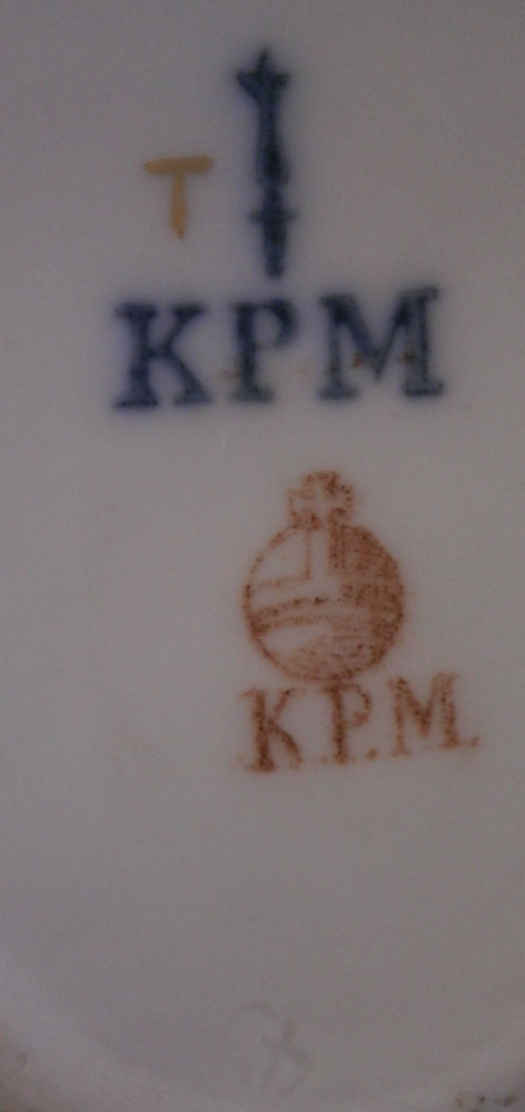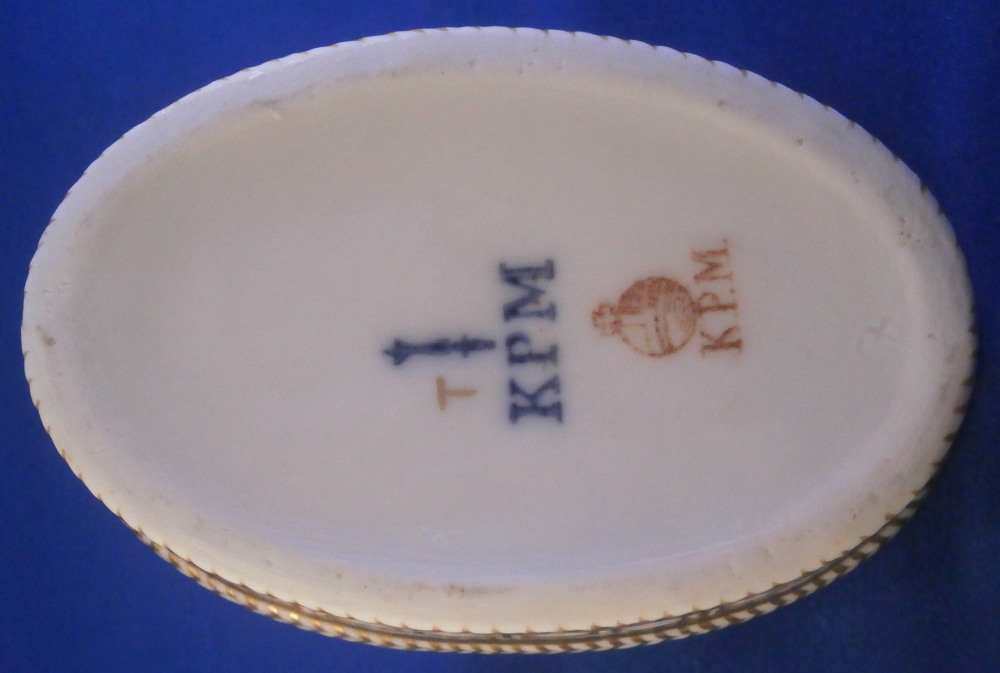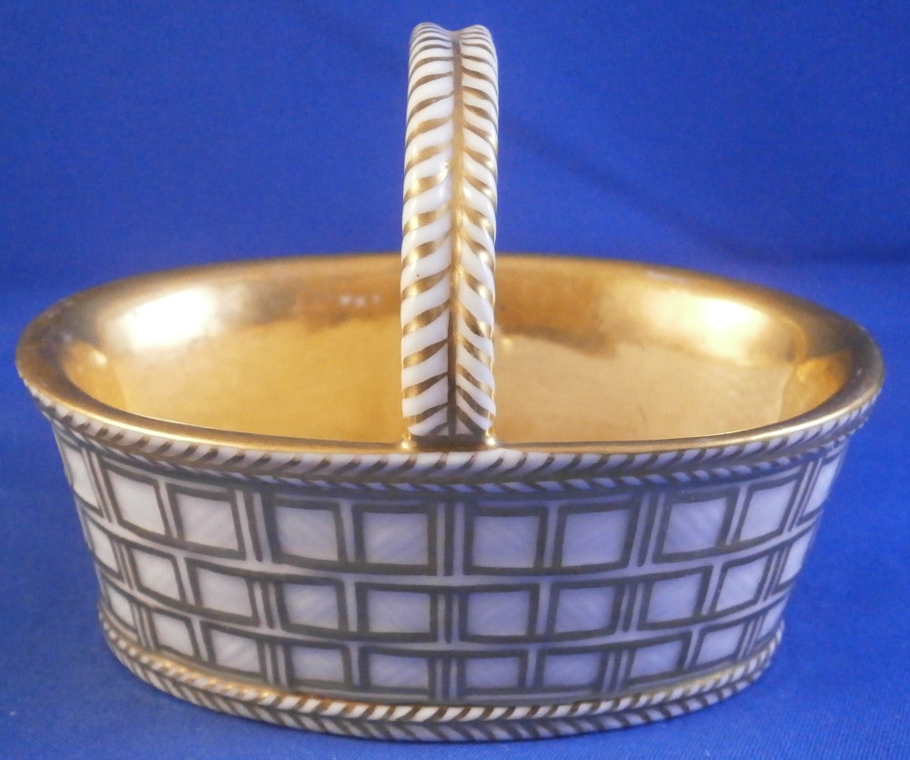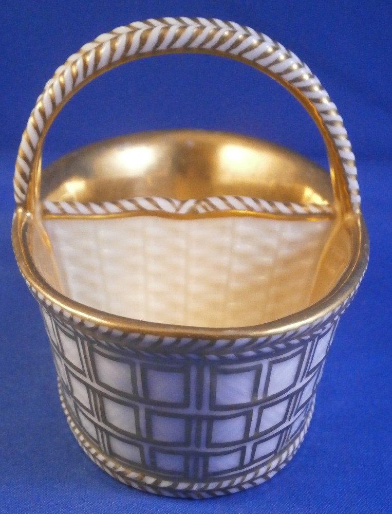 This is a second cute little basket likely meant to be an open salt or spice dish made by KPM in the mid 19th century between 1837 and 1844. The piece has a superb design to it with lots of molded relief detail. It has a divider in the center and a nice handle over that. Lots of gold highlights and the inside wall is fully gilded as well. A great looking and unusual piece! The piece is in great condition with a couple of hard to see spots of gold wear to the inner lip. It displays perfectly! The piece is 2.625 inches tall at the handle, 3.625 inches wide and 2.5 inches deep. Marked underneath with the rare KPM under the scepter mark only used for a few years. It also has the red orb mark as well as a gilder's mark and an impressed mark. A truly fun little piece! I have another one up for sale if anyone is interested in a rare pair! Please email me for more information or other pictures.